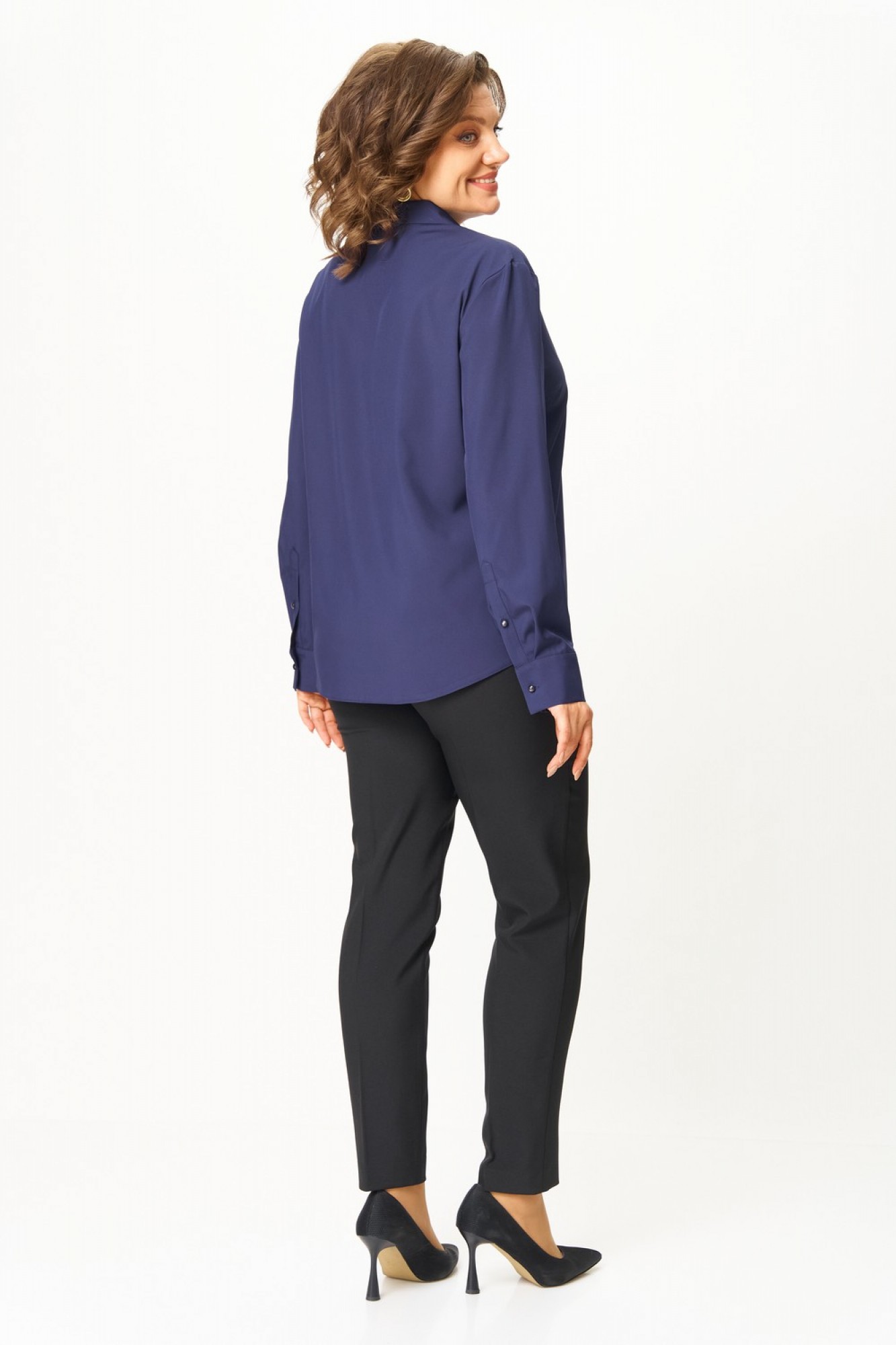 Блузка женская из хлопковой ткани, прямого силуэта с втачным рукавом. Линия плеча слегка спущена. Застежка центральная на петли и пуговицы. Воротник отложной с лацканами. Перед с вытачками по линии груди. По левой части переда накладной карман с отделкой. Рукав длинный рубашечный, по низу притачная манжета с застежкой петли и пуговицы. Линия низа фигурная. Фурнитура может меняться от наличия.