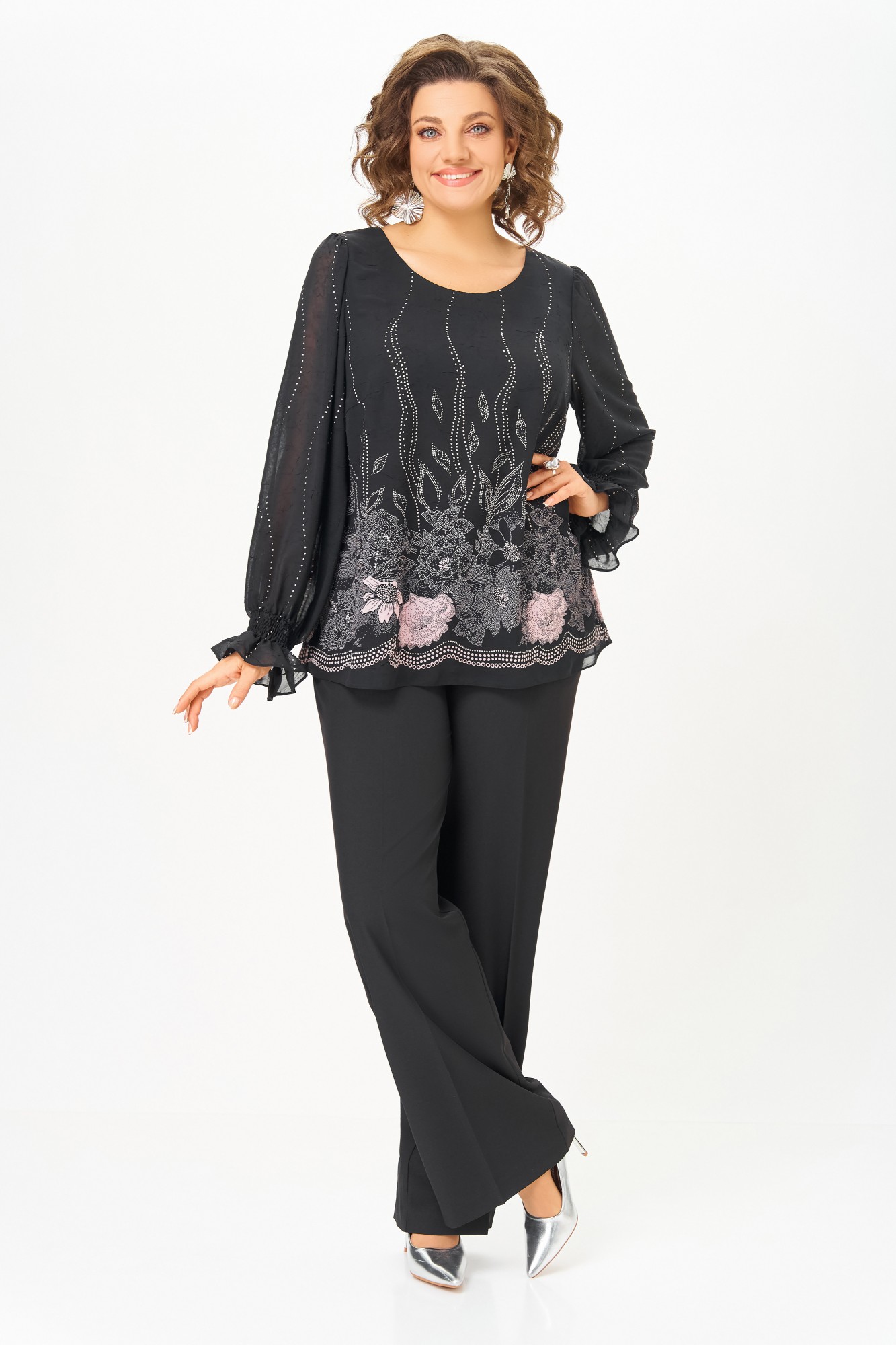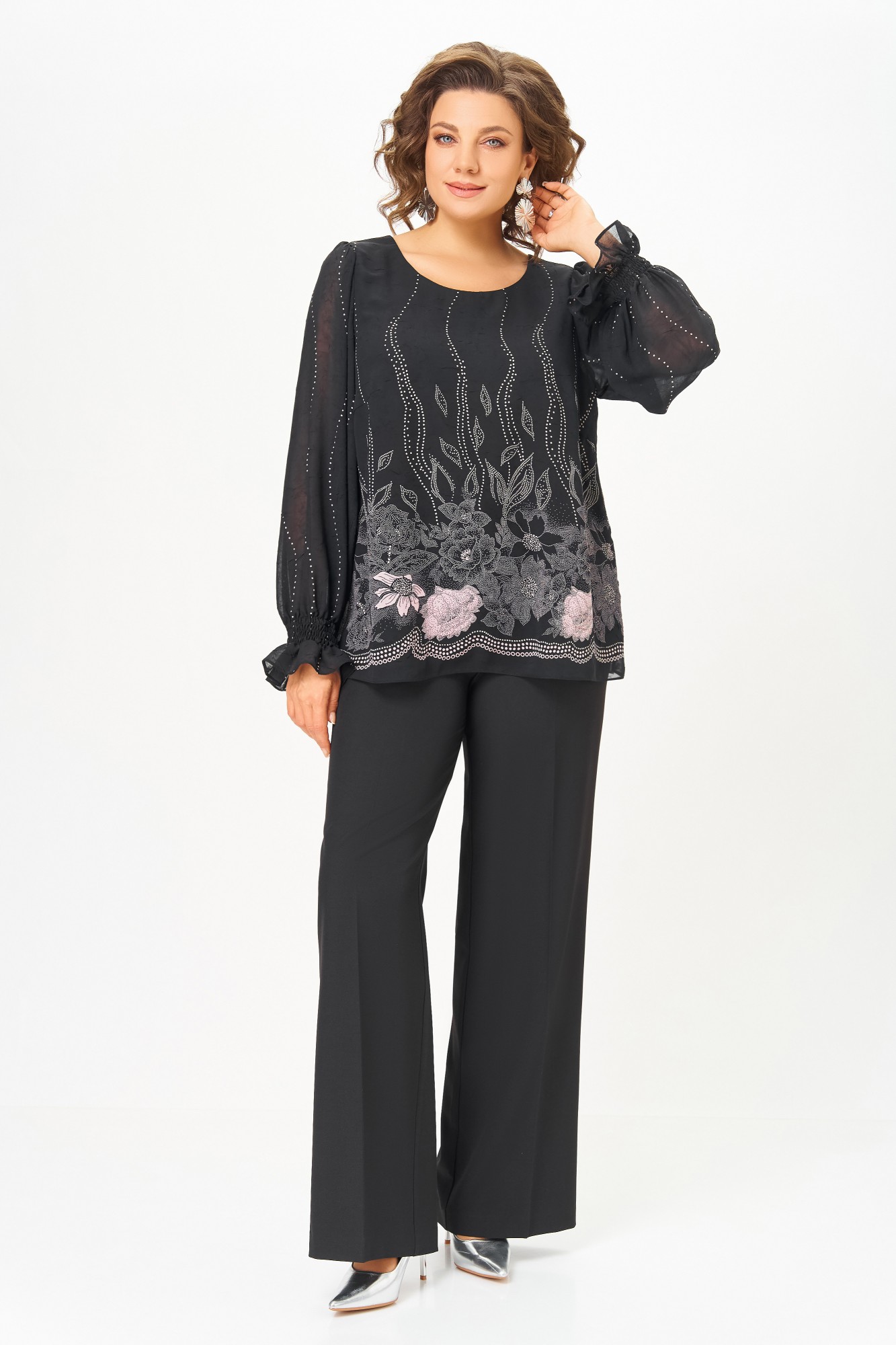 Блузка А-силуэта из нежной шифоновой ткани с лёгким эффектом «жатки», на подкладке из шифона. Полочка с нагрудными выточками, спинка без особенностей. Горловина круглая. Рукав втачной длинный по окату со сборкой, в нижней части собран на эластичную нить, которая внизу образует рюшу высотой 6 см.
