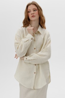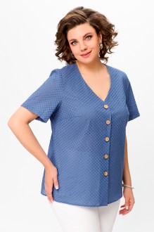 Блузка из мягкой вискозной ткани свободного силуэта со спущенной линией плеча. Горловина по полочке округлой формы, по спинке – V-образный вырез, который соединён планкой. Рукав втачной, длинный. Низ блузки и низ рукавов присобраны на декоративный трикотажный довяз.