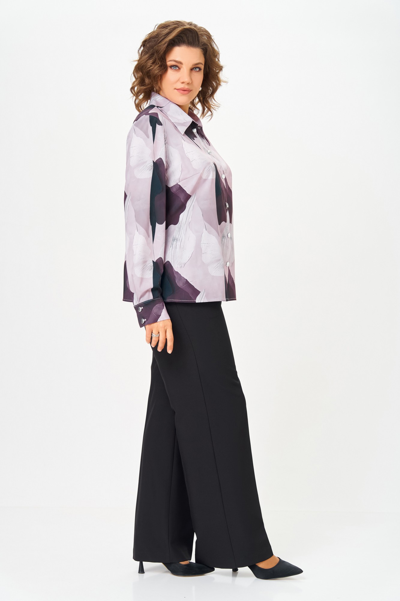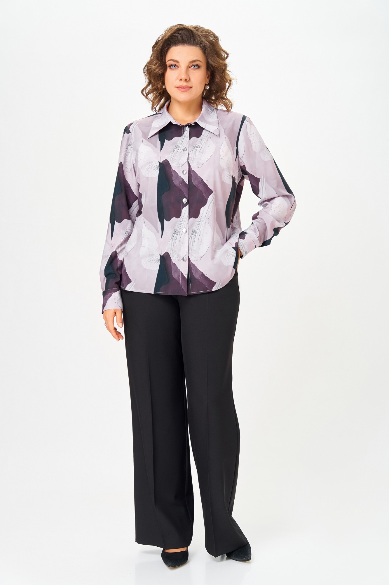 Блузка из вискозной ткани, прямого силуэта с центральной застёжкой на петли и декоративные пуговицы. Перед с нагрудными вытачками. Спинка цельная. Воротник рубашечного типа с отрезной стойкой. Рукав втачной одношовный с манжетой, которая застёгивается на две петли и пуговицы.