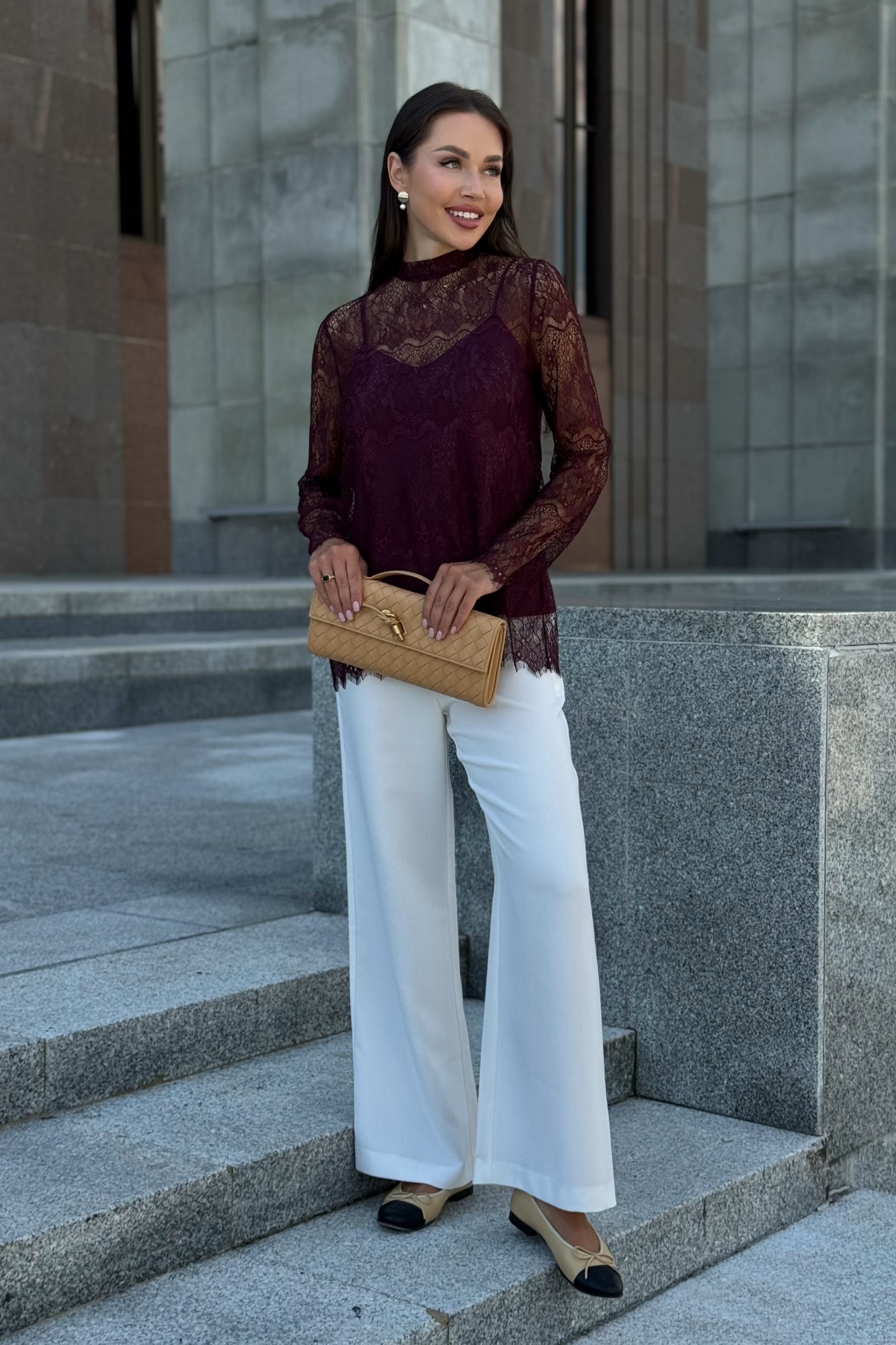 Блуза Длина посередине спинки ( от шва втачивания воротника до конца фестона) - 71,0 см (±2,0 см), Ширина на уровне глубины проймы - 59,0 см (±1,0 см), Ширина на уровне линии талии - 60,5 см (±1,0 см), Ширина на уровне линии бедер - 64,0 см (±1,0 см), Длина рукава (от шва проймы до конца фестона по низу) - 64,0 см (±1,0 см), Ширина рукава вверху - 21,0 см (±1,0 см), Ширина рукава по низу - 12,5 см (±0,5 см) Длина плеча - 11,5 см (±0,5 см). Топ Длина посередине спинки - 38,0 см (±1,0 см), Длина по боковому шву - 39,0 см (±1,0 см), Ширина на уровне глубины проймы - 54,5 см (±1,0 см), Ширина на уровне линии талии - 54,0 см (±1,0 см), Ширина по низу топа - 62,0 см (±1,0 см).