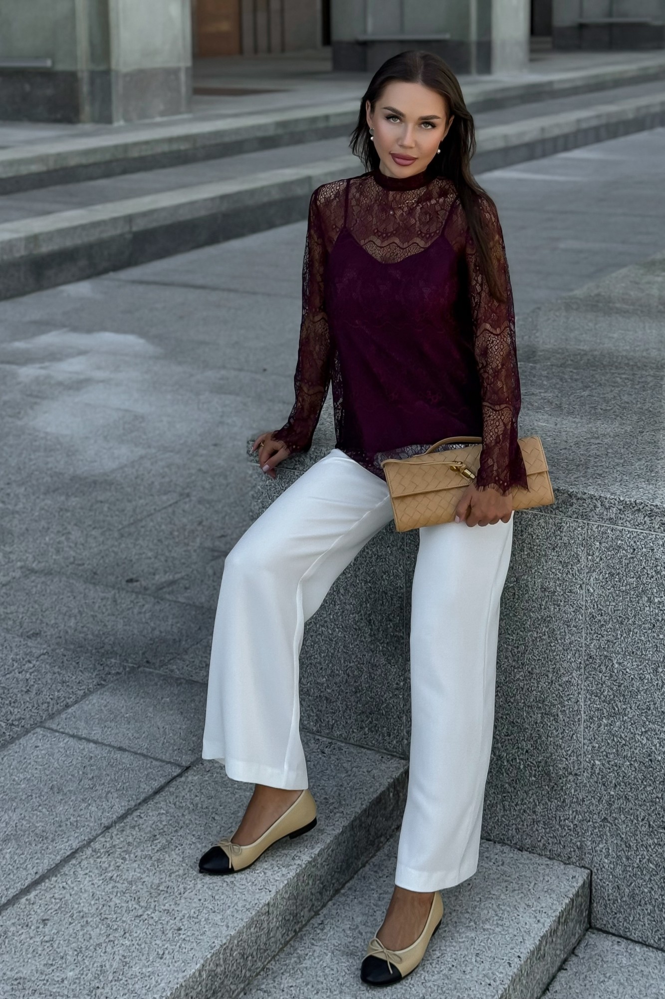 Блуза Длина посередине спинки ( от шва втачивания воротника до конца фестона) - 71,5 см (±2,0 см), Ширина на уровне глубины проймы - 50,0 см (±1,0 см), Ширина на уровне линии талии - 51,5 см (±1,0 см), Ширина на уровне линии бедер - 56,0 см (±1,0 см), Длина рукава (от шва проймы до конца фестона по низу) - 64,0 см (±1,0 см), Ширина рукава вверху - 17,5 см (±1,0 см), Ширина рукава по низу - 11,0 см (±0,5 см) Длина плеча - 12,0 см (±0,5 см). Топ Длина посередине спинки - 38,5 см (±1,0 см), Длина по боковому шву - 39,5 см (±1,0 см), Ширина на уровне глубины проймы - 46,0 см (±1,0 см), Ширина на уровне линии талии - 45,0 см (±1,0 см), Ширина по низу топа - 54,0 см (±1,0 см).