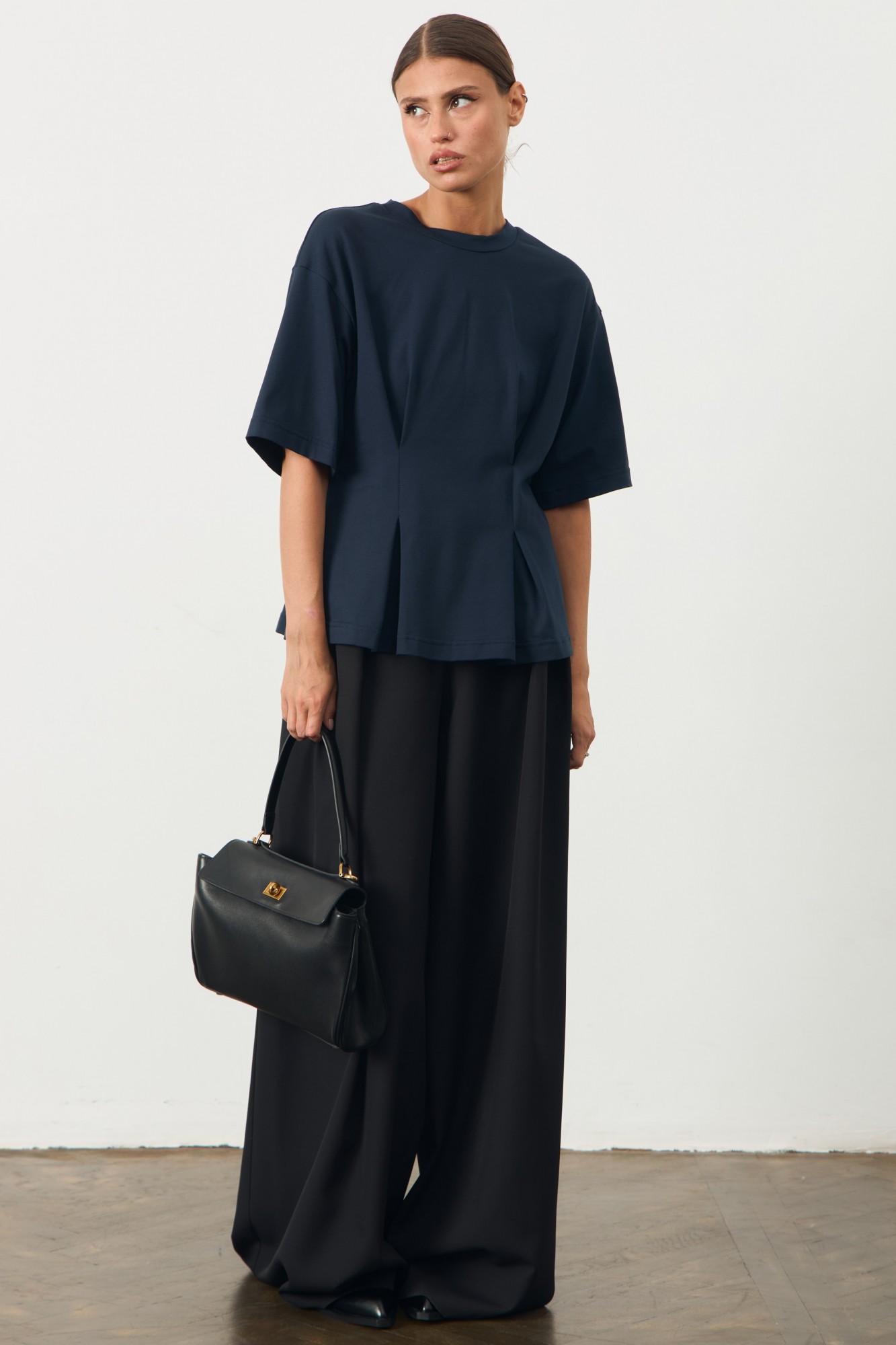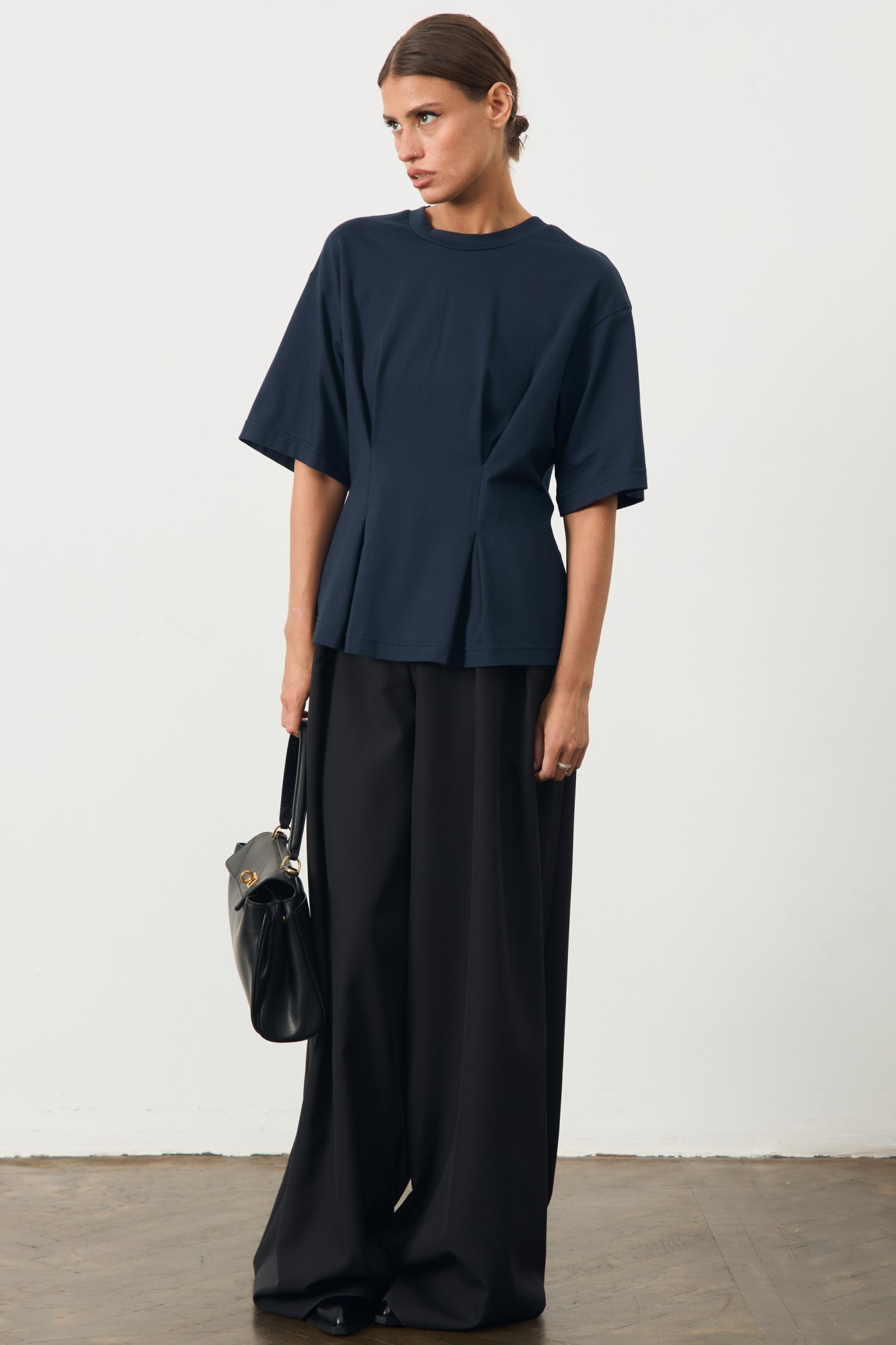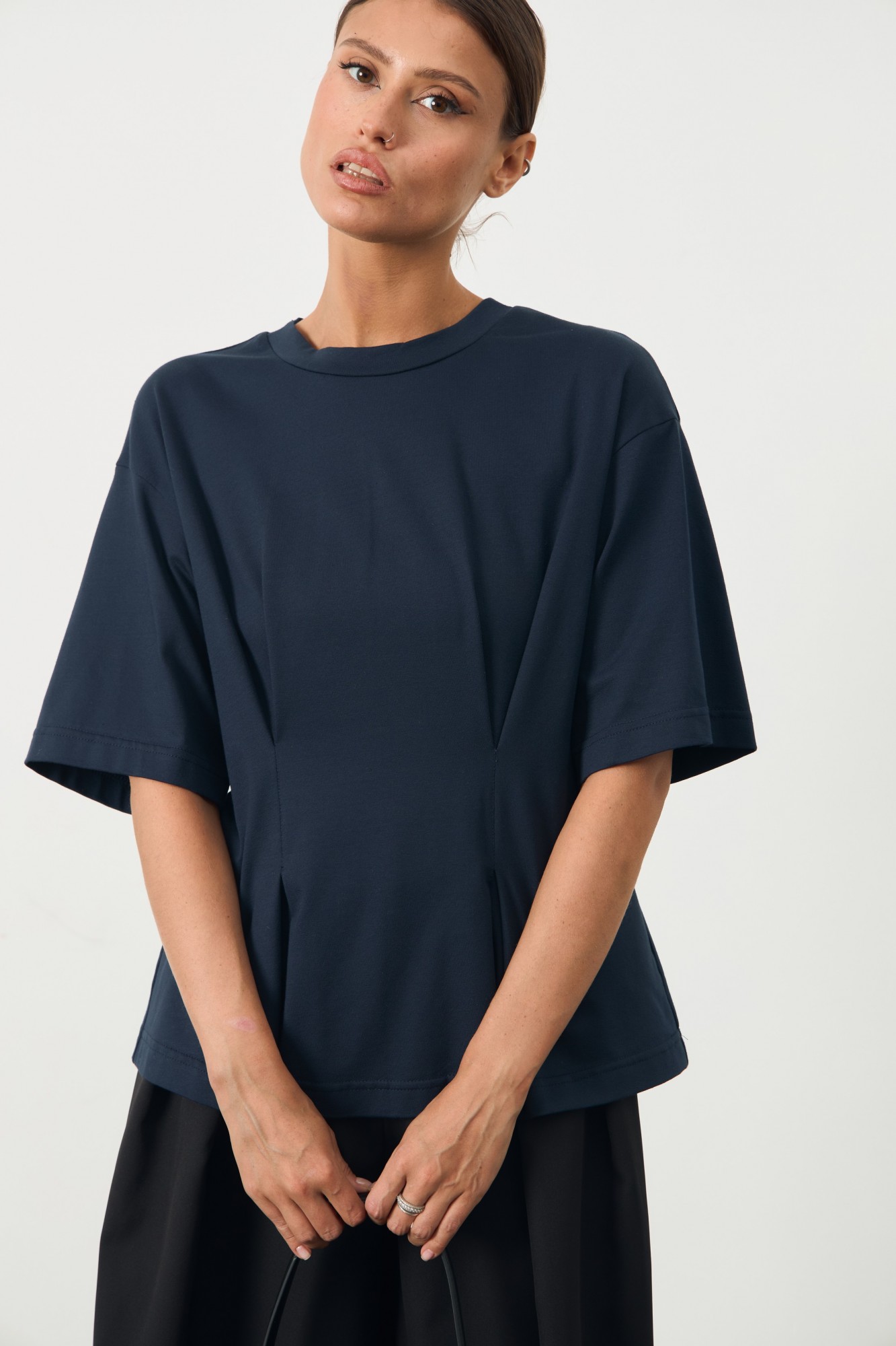 Футболка приталенного кроя со спущенным рукавом. По переду декорирована складками.