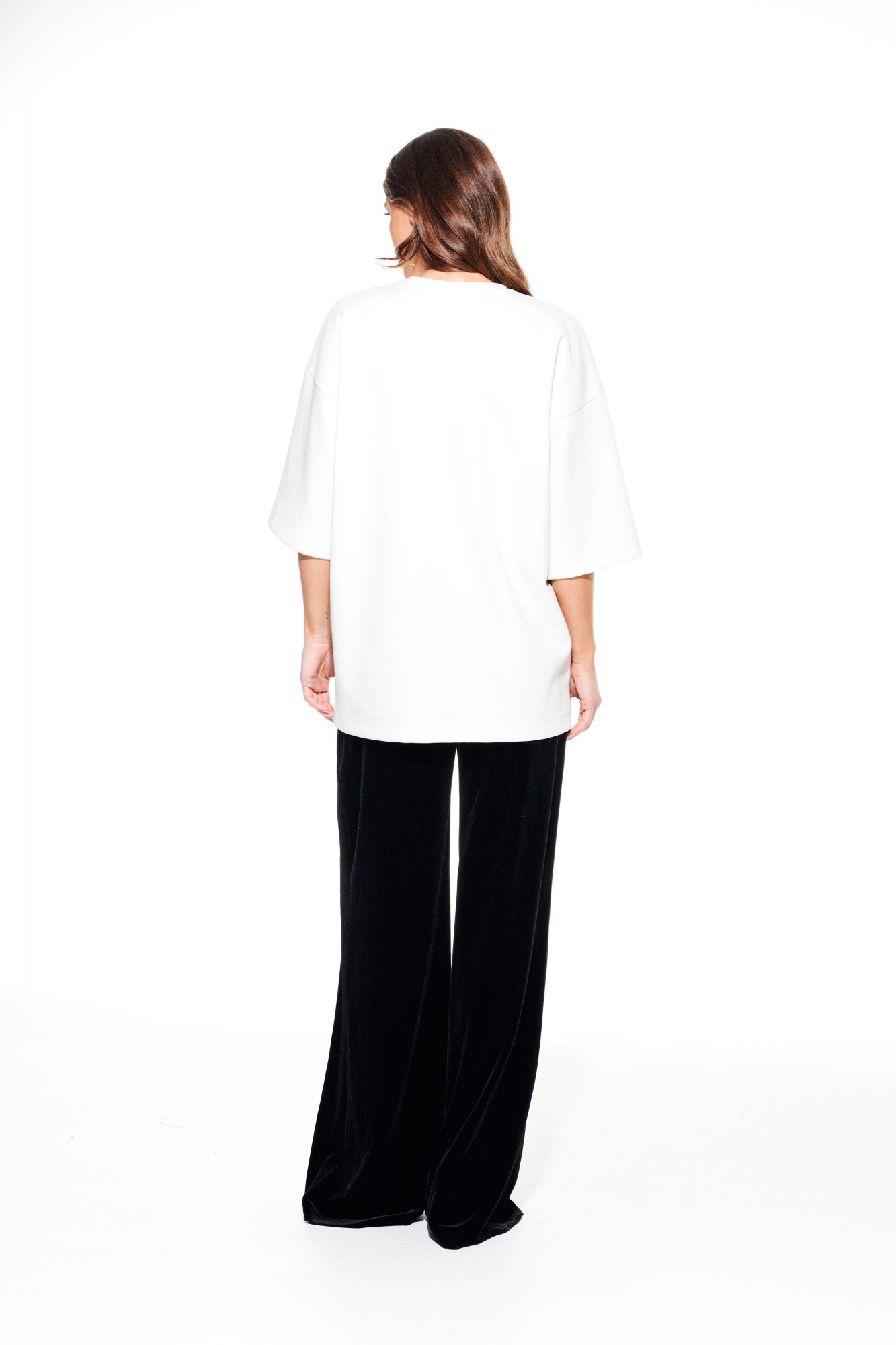 Джемпер из трикотажного полотна, прямого силуэта, свободный, с круглым вырезом горловины. Перед и спинка цельные. По переду выполнена вышивка-аппликация из бархата "Лошадь".