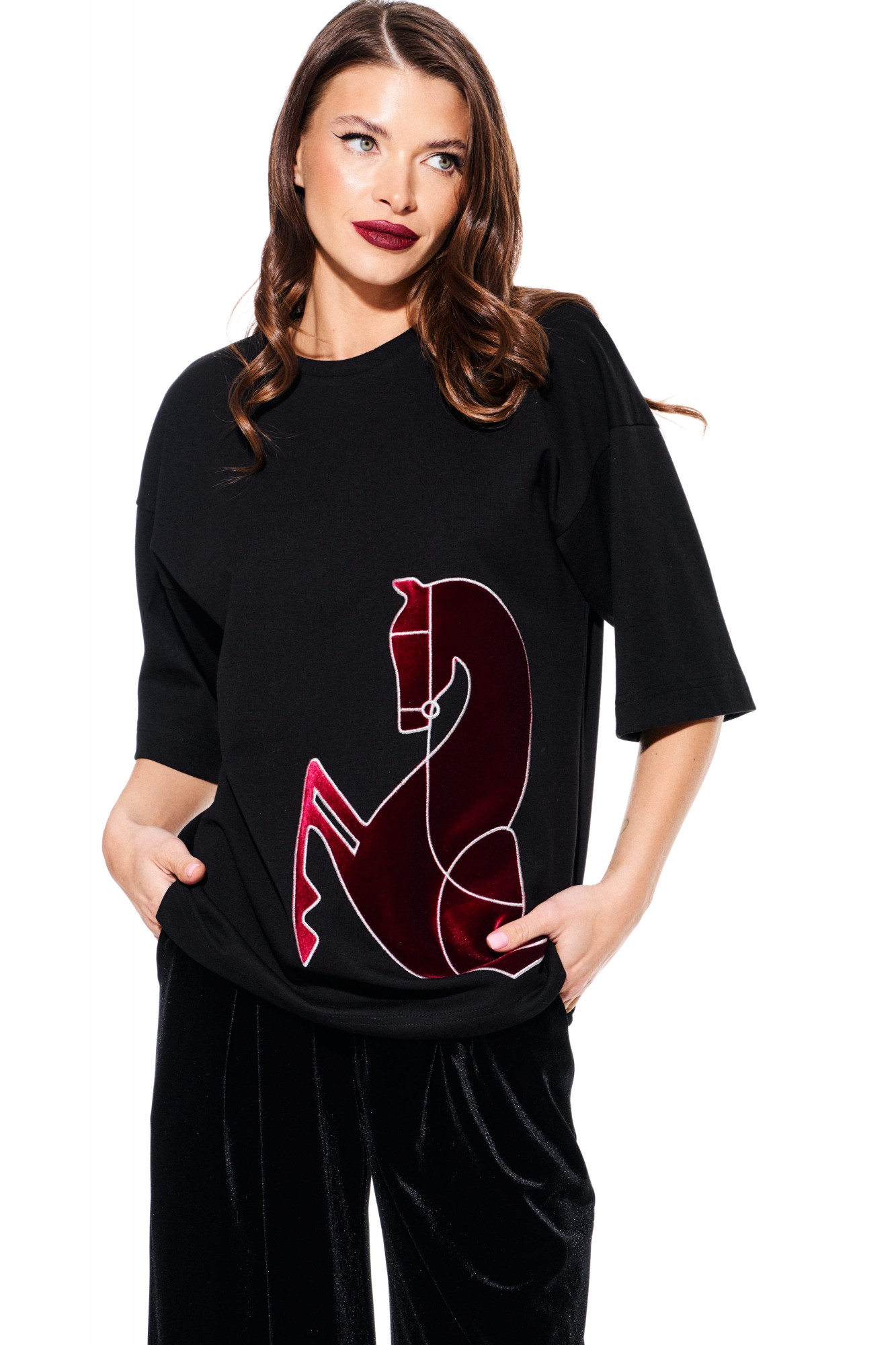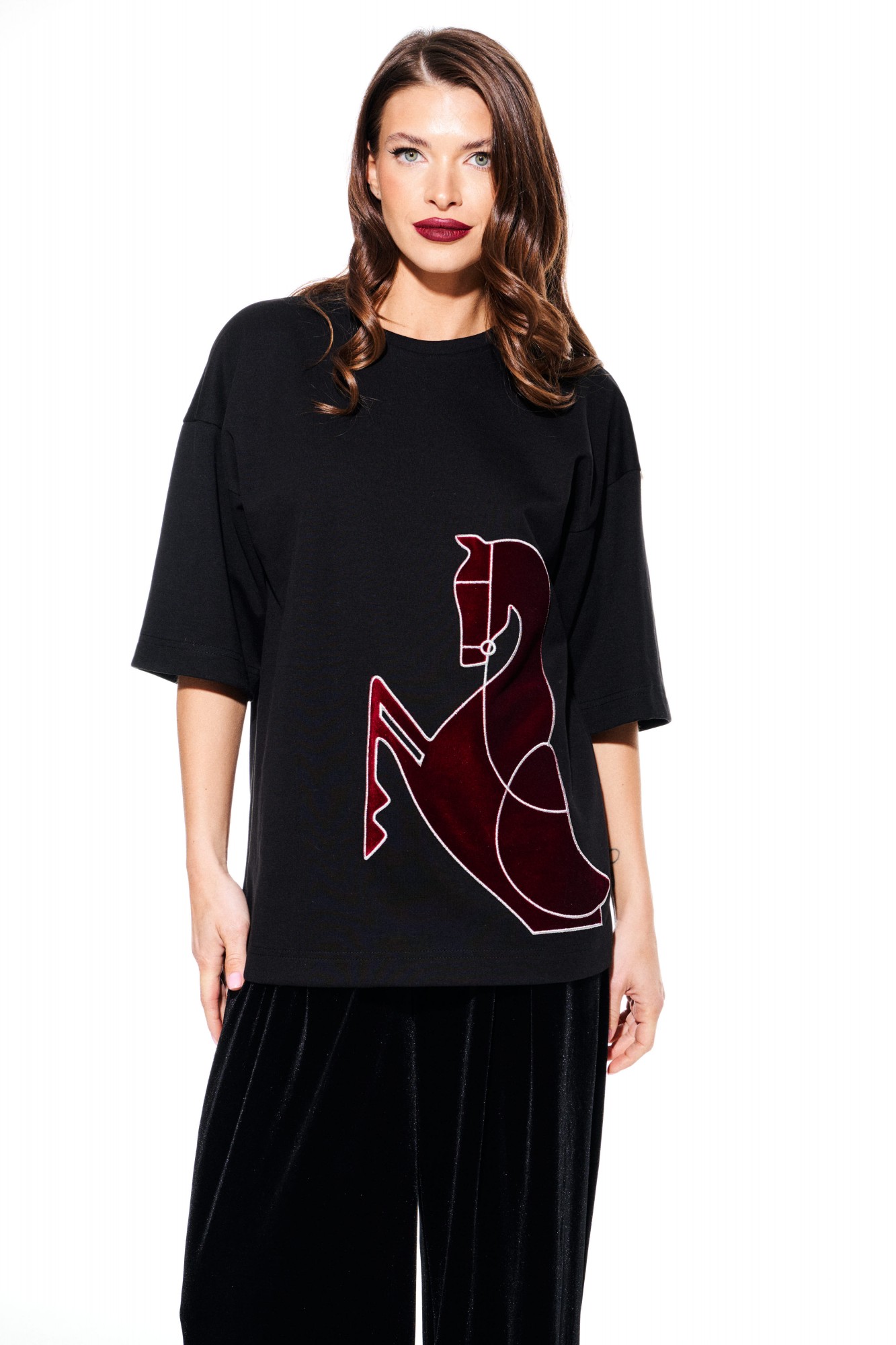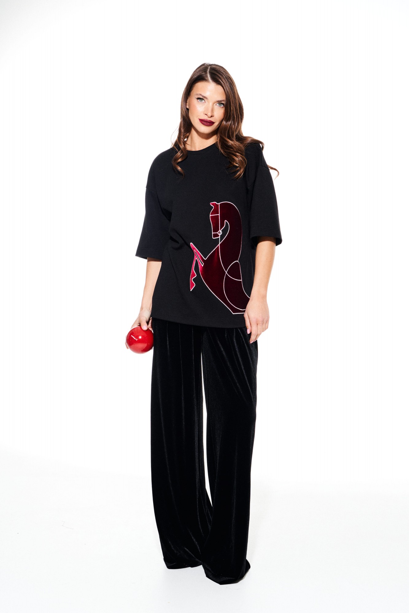 Джемпер из трикотажного полотна, прямого силуэта, свободный, с круглым вырезом горловины. Перед и спинка цельные. По переду выполнена вышивка-аппликация из бархата Лошадь.