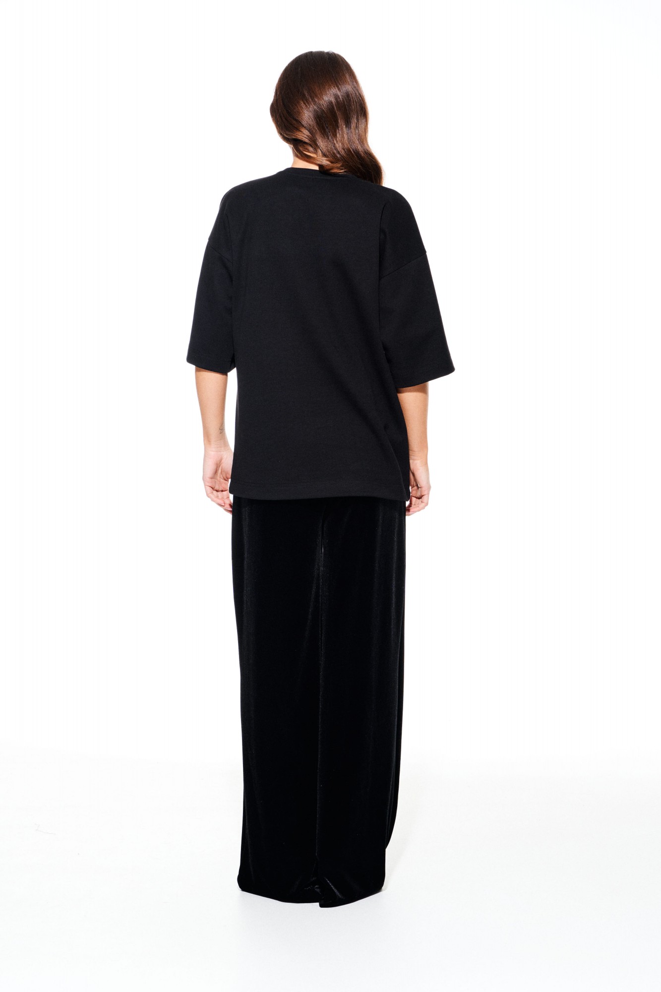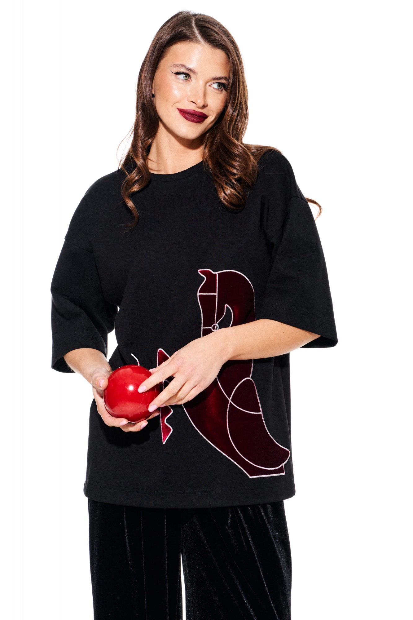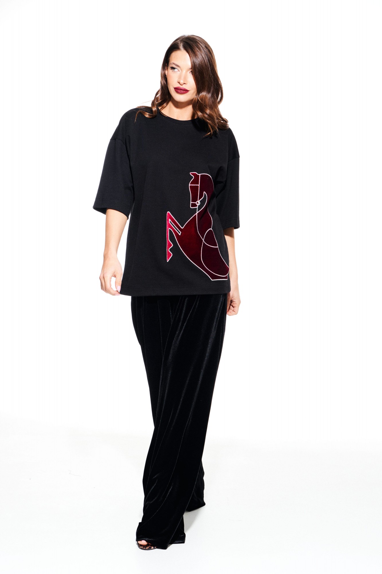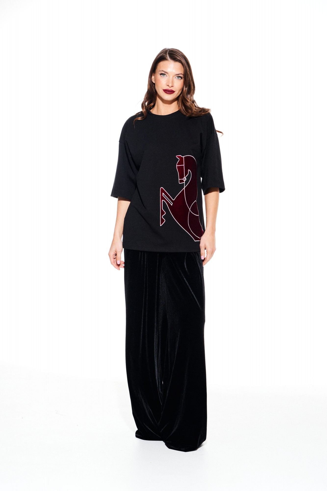 Джемпер из трикотажного полотна, прямого силуэта, свободный, с круглым вырезом горловины. Перед и спинка цельные. По переду выполнена вышивка-аппликация из бархата Лошадь.