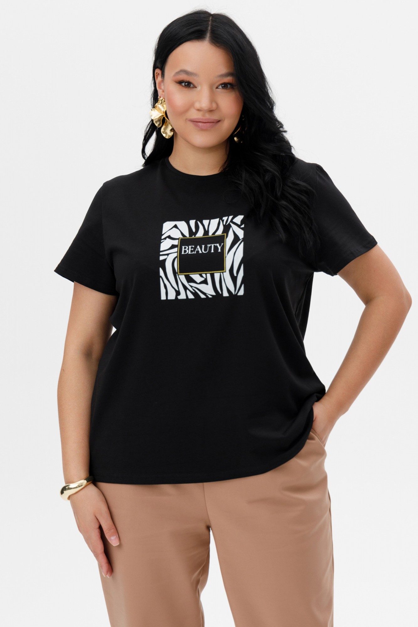 Уникальный принт с зебровым узором и надписью "BEAUTY" добавляет изделию стиль и индивидуальность.