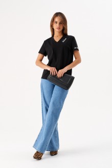 Джемпер полуприлегающего силуэта. Рукав втачной, короткий. Форма горловины V-образная. Вырез горловины обработан притачной бейкой . Низ рукавов и спинки обработаны на плоскошовной машине. На левом рукаве и слева у горловины нанесена печать. Джемпер изготовлен из трикотажного полотна, в составе которого хлопок 94%, эластан 6%.