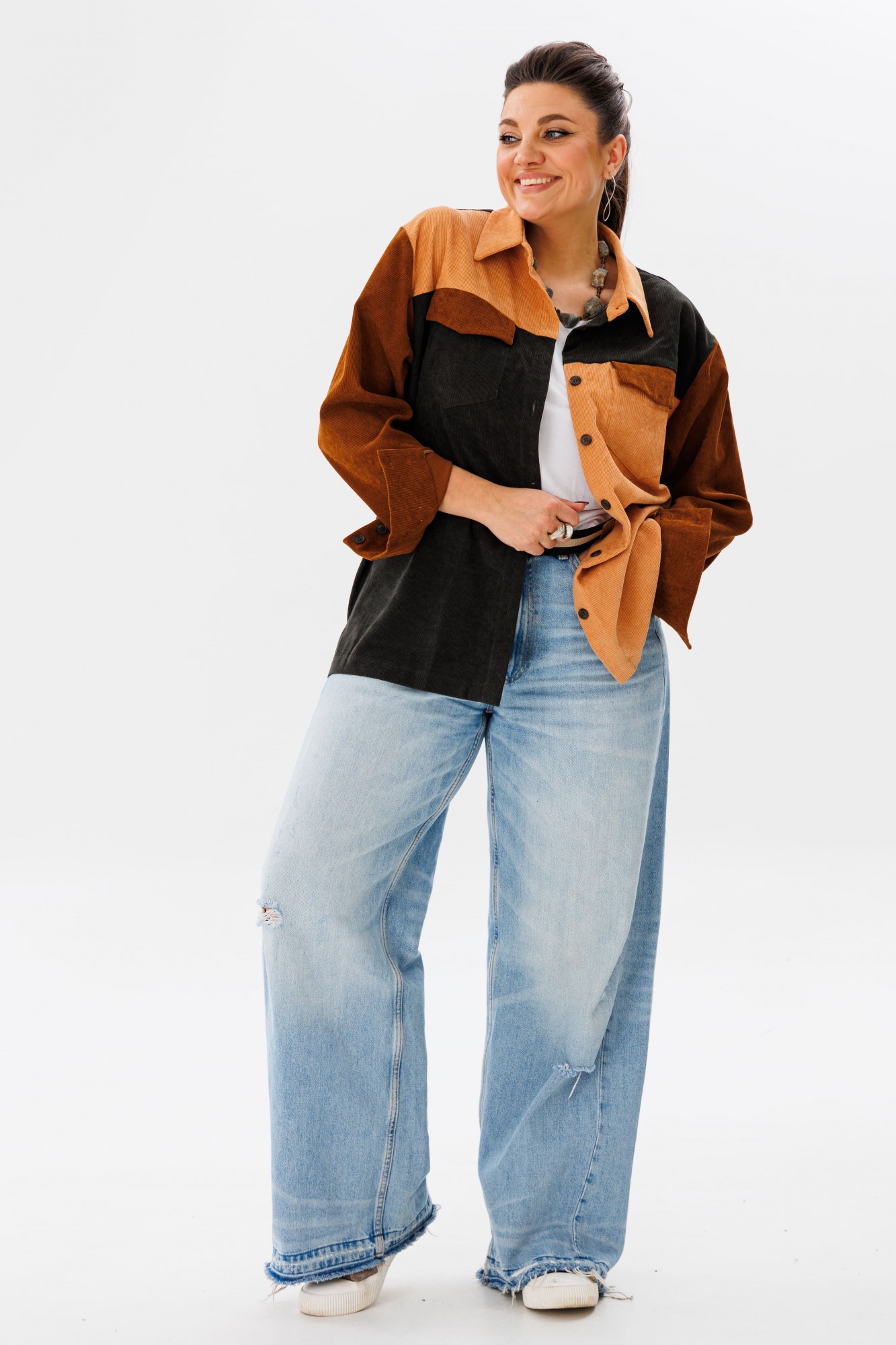 Вельветовая рубашка прямого силуэта от Анелли, сочетающая в себе сладость и мягкость оттенков карамели, – идеальное решение для тех, кто ценит стиль и уют. Отложной воротник на стойке и застёжка на пуговицы добавляют нотки строгости, а спущенное плечо с длинным втачным рукавом на манжете – удобство и практичность. Край кокетки на спинке обработан бахромой, что не может не привлекать внимания. Элементы рубашки сочетаются тремя цветами – это смелое решение, которое даёт возможность собирать образы с любыми вашими вещами! Также на модели собран образ с жилетом 1386 от Анелли.