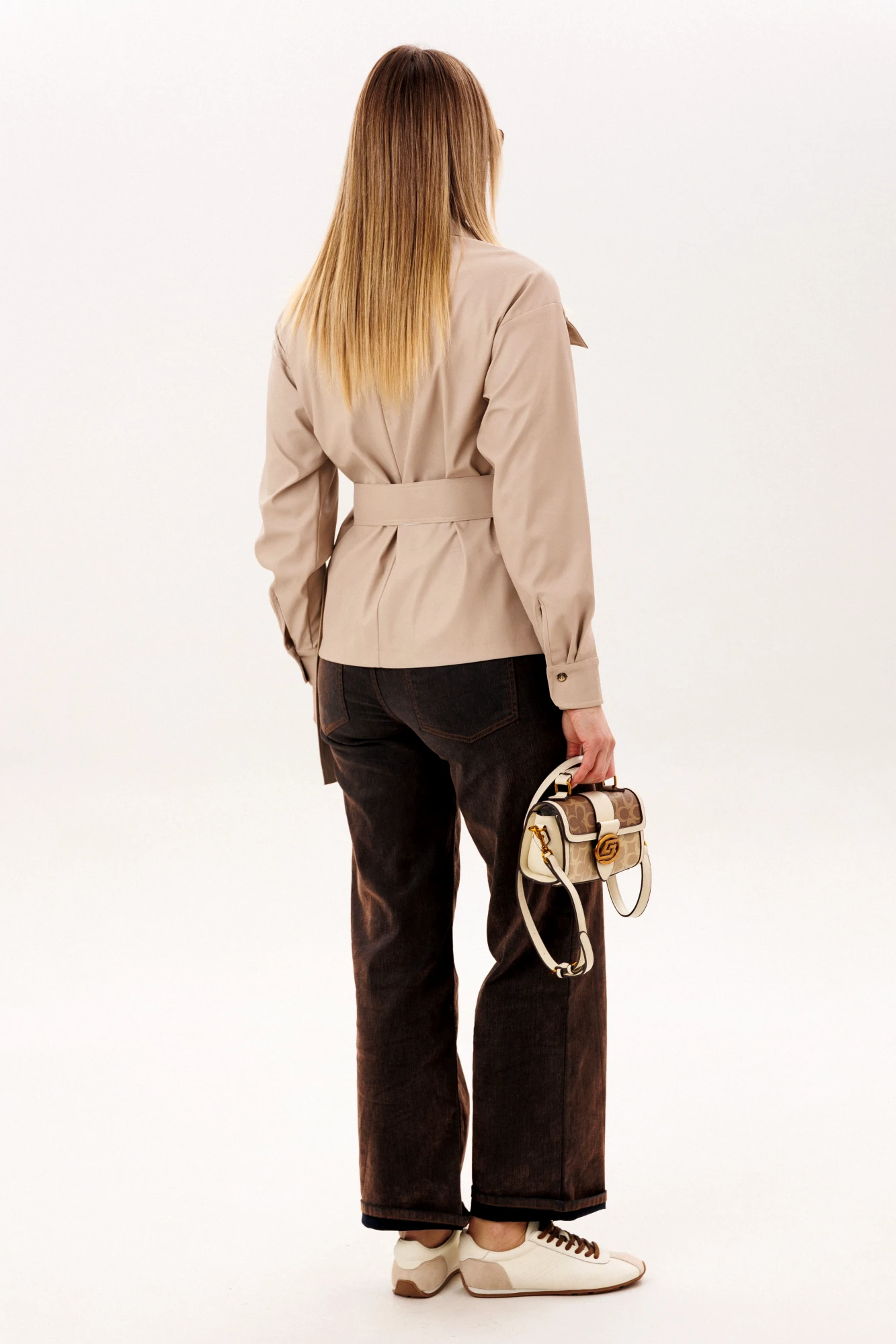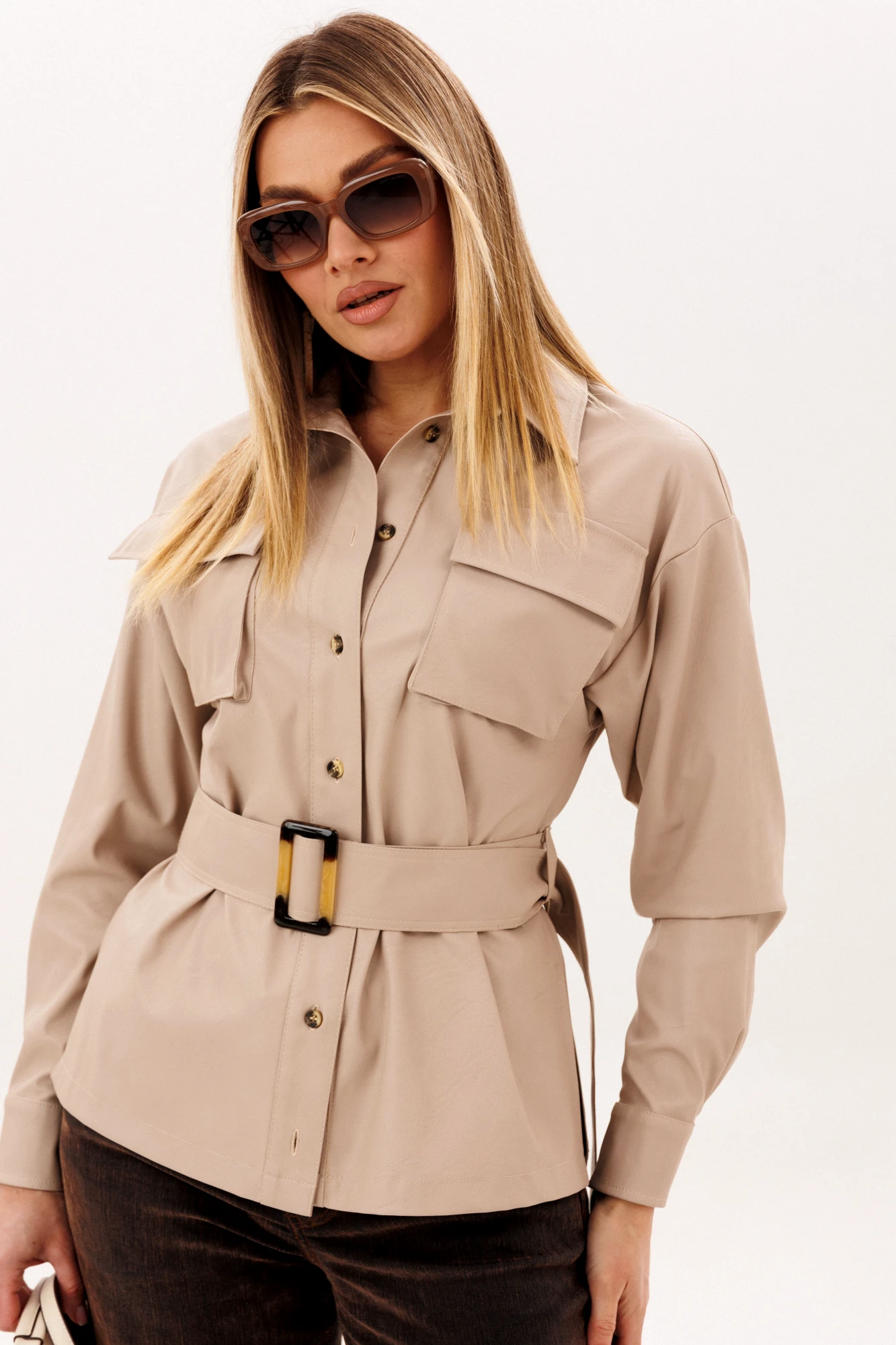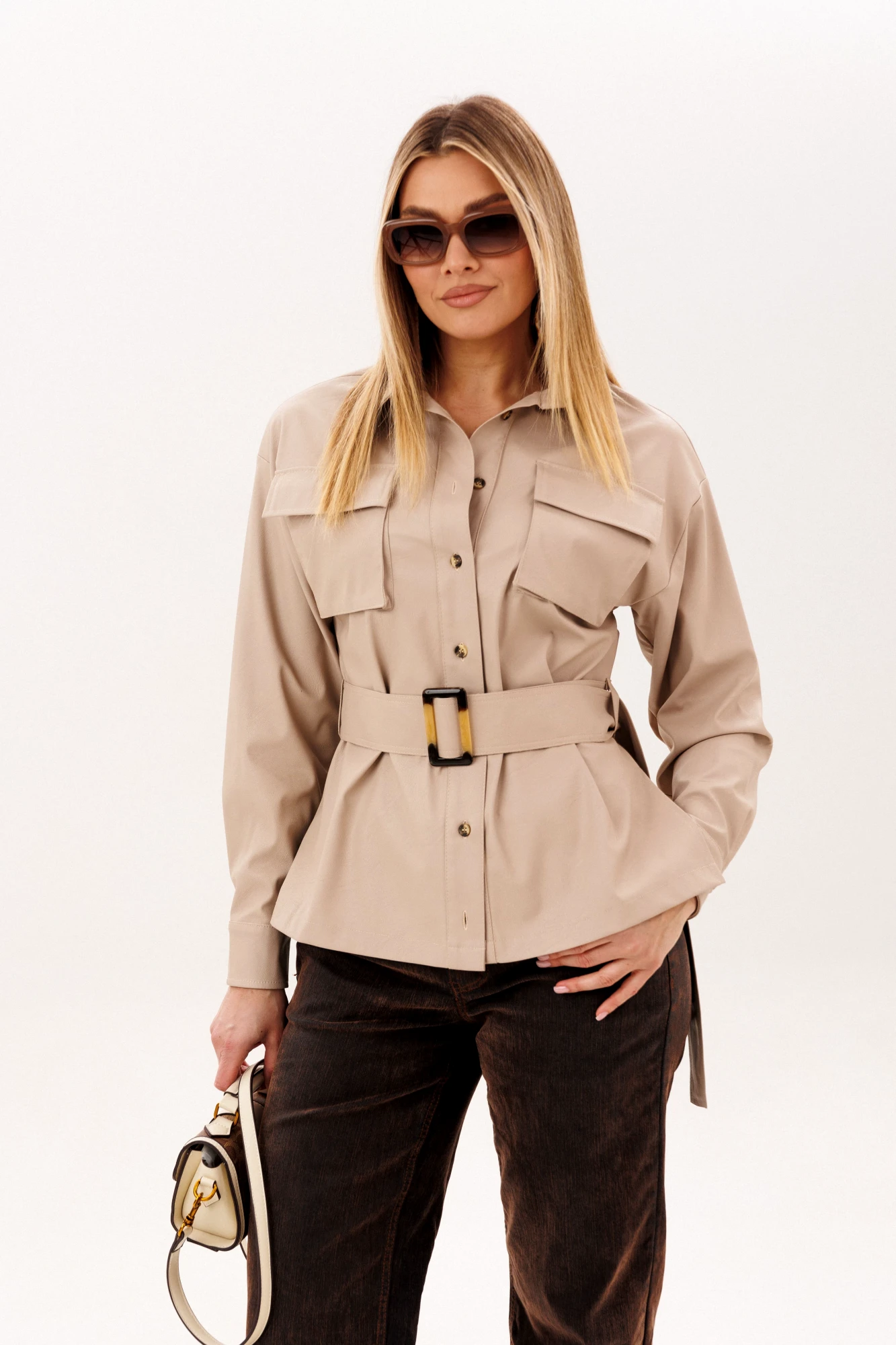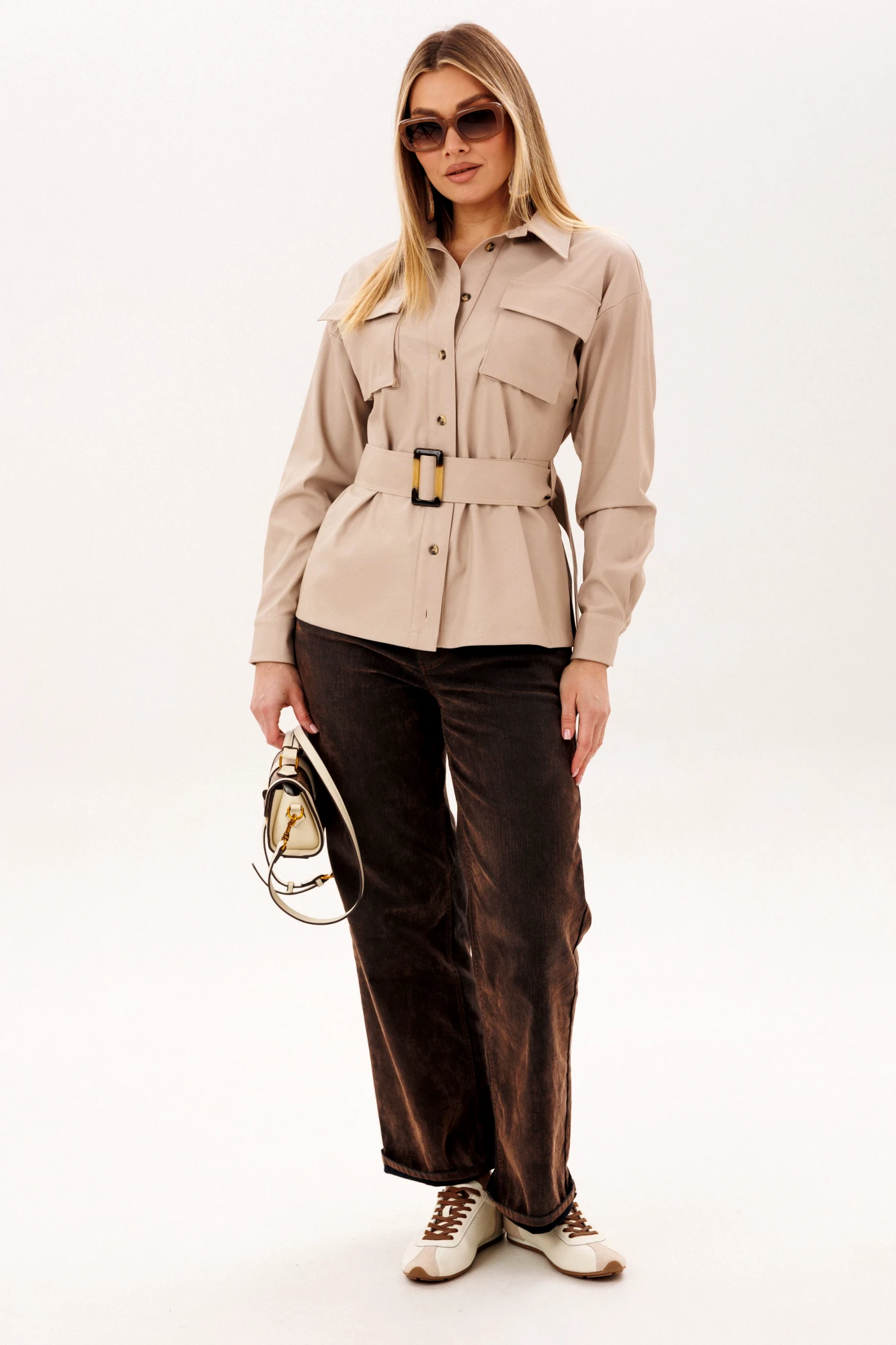 Пояс из той же эко кожи позволяет менять настроение образа - носить рубашку свободно или мягко подчеркнуть талию, создавая более женственный силуэт. Эта модель легко вписывается в гардероб, прекрасно сочетается с джинсами и каблуками, создавая образ, в котором комфорт соединяется с выразительностью. Рубашка, в которой чувствуется уверенность, стиль и особое настроение.