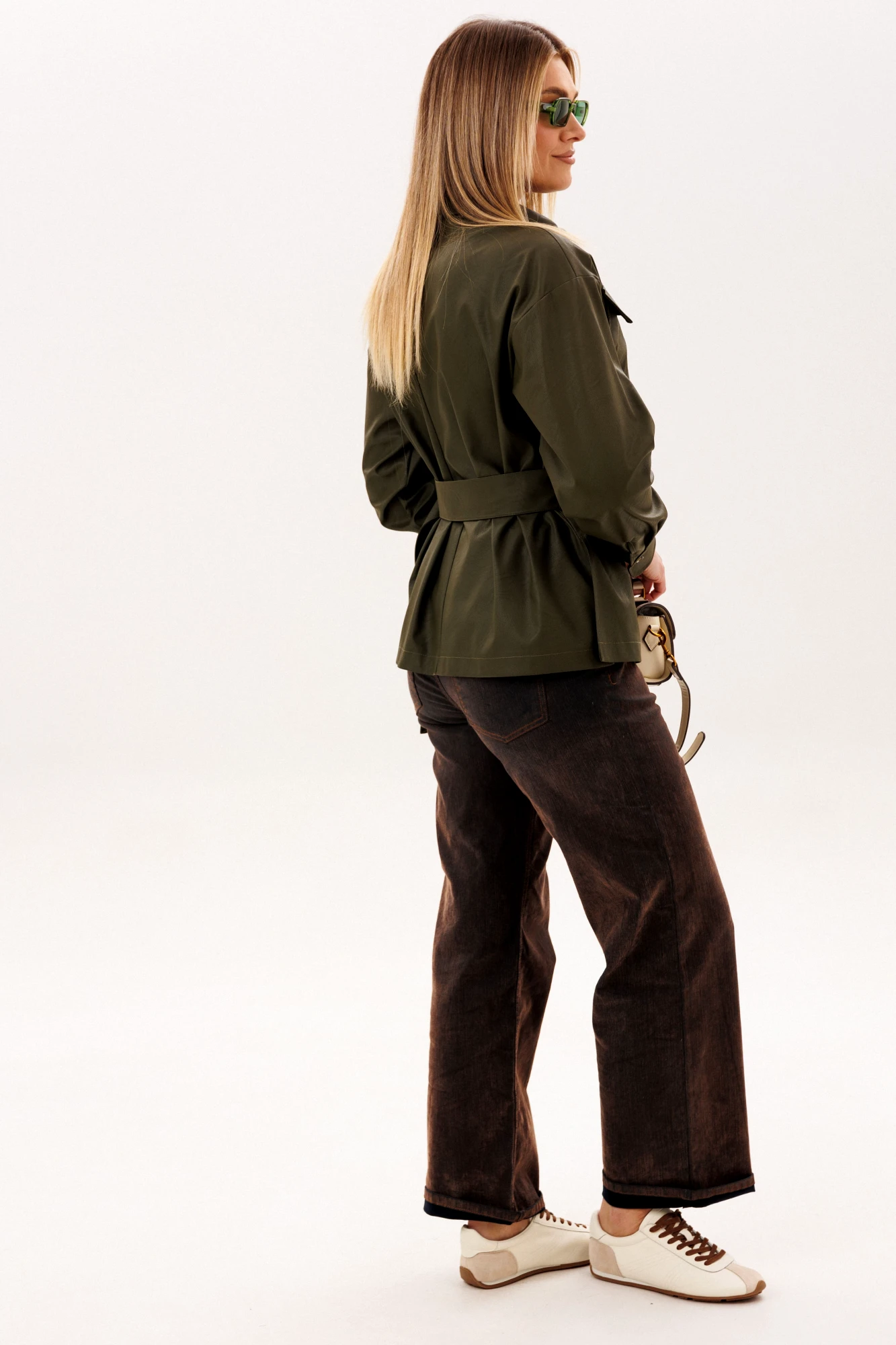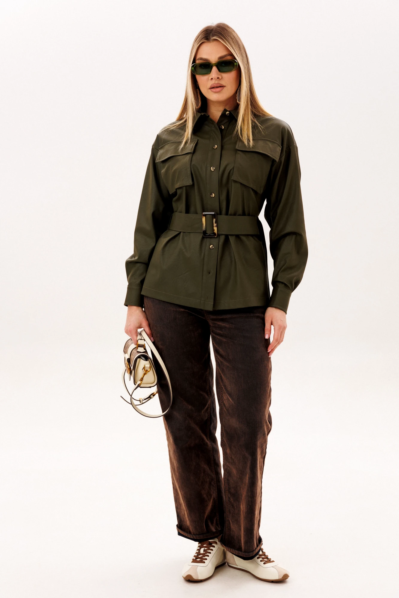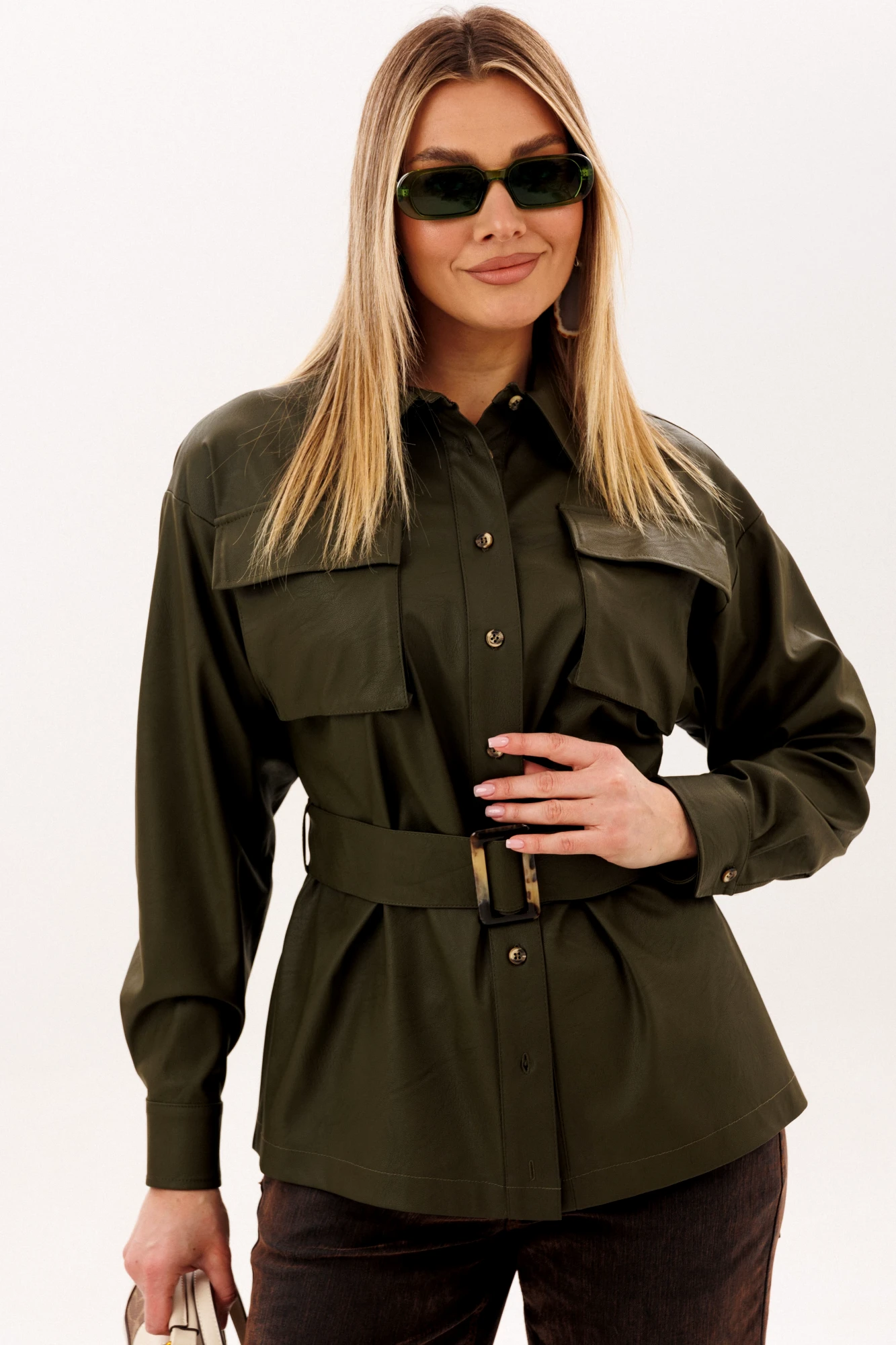 Пояс из той же эко кожи позволяет менять настроение образа - носить рубашку свободно или мягко подчеркнуть талию, создавая более женственный силуэт. Эта модель легко вписывается в гардероб, прекрасно сочетается с джинсами и каблуками, создавая образ, в котором комфорт соединяется с выразительностью. Рубашка, в которой чувствуется уверенность, стиль и особое настроение.
