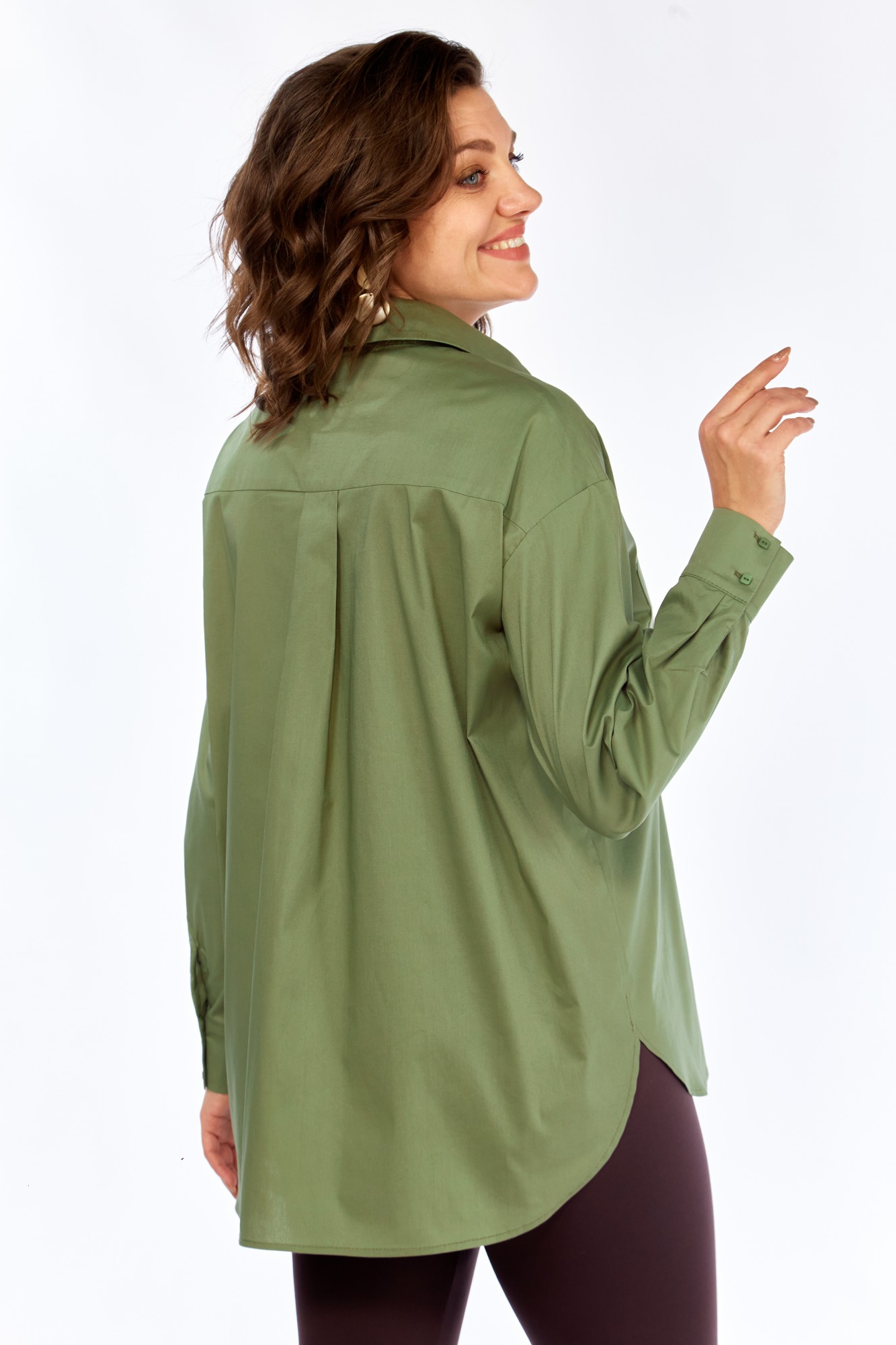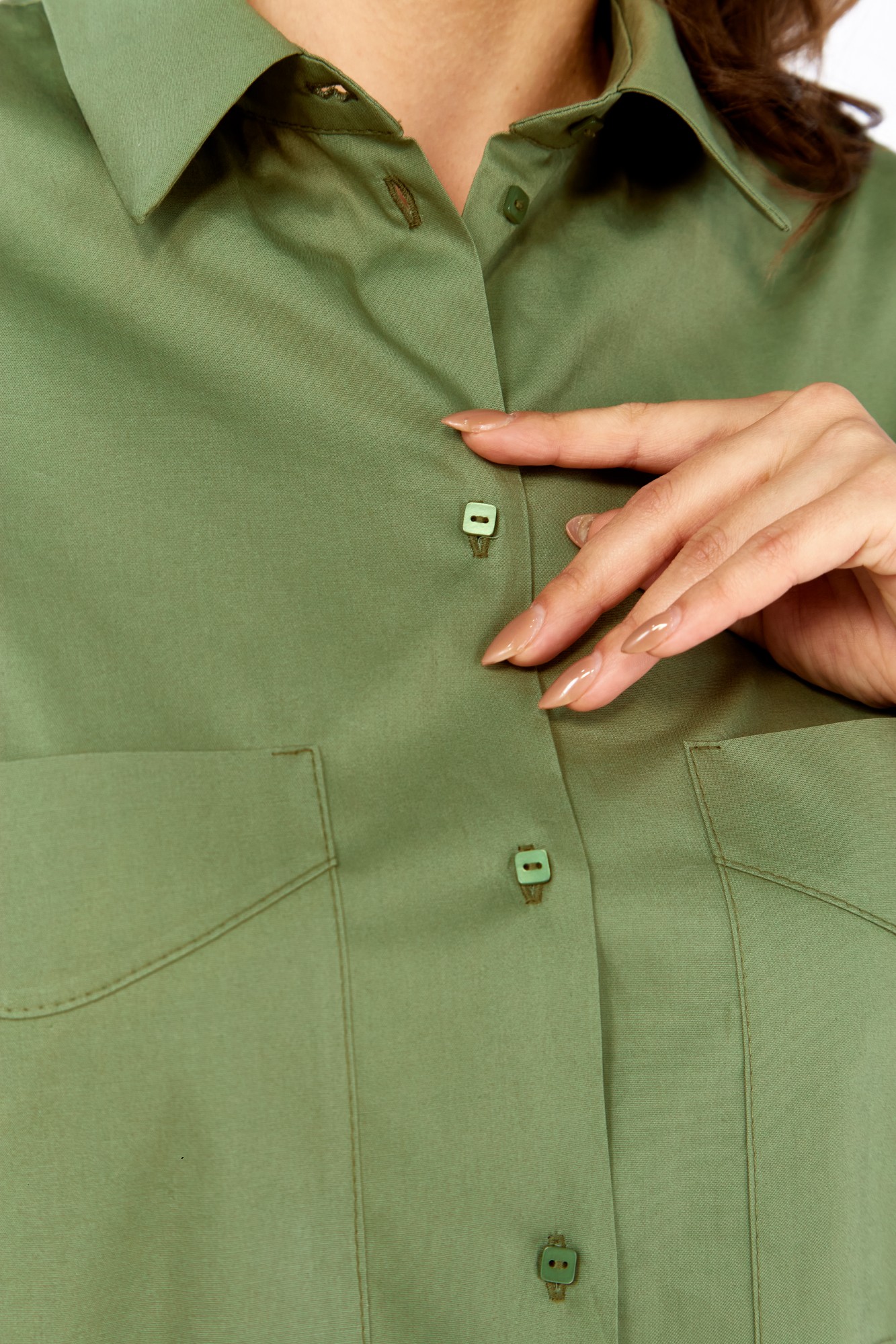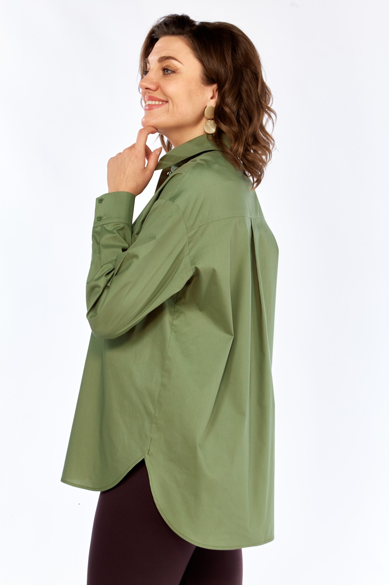 Рубашка свободного силуэта. Рукав рубашечный с разрезом и складками, заканчивается манжетой, которая застегивается на 2 петли и пуговицы. Плечо спущенное. На спинке двойная кокетка, от кокетки по центру спинки идет встречная складка. Ткань поплин, тянется по ширине.