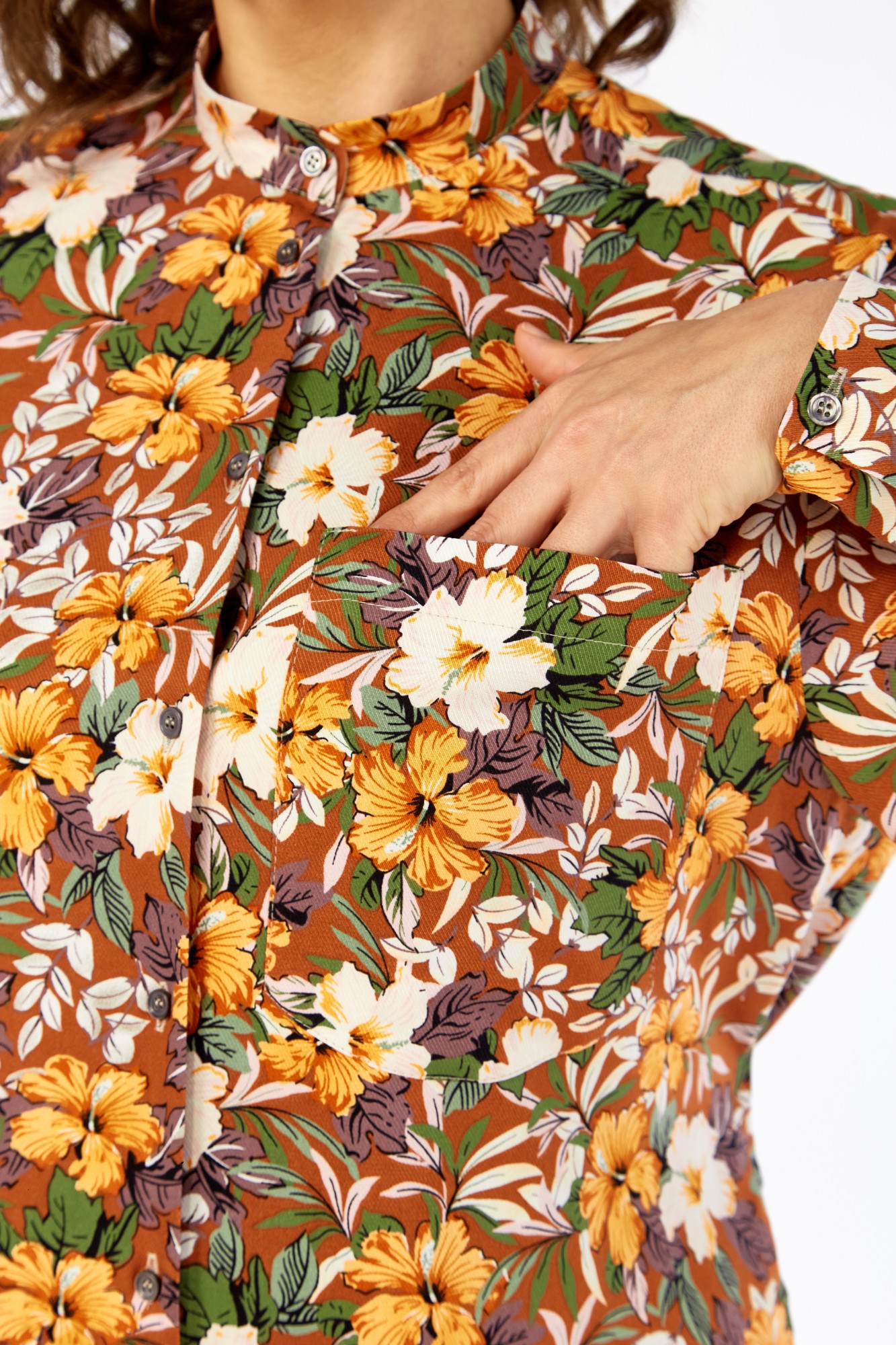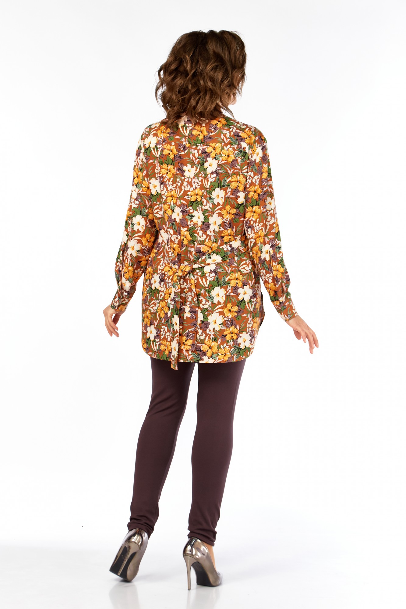 Рубашка свободного кроя, в стиле оверсайз. Силуэт свободный. На переде настрочен 1 кармана с левой стороны. По боковым швам разрезы. Рукав длинный, заканчивается манжетой, на рукаве удлиненный разрез. Манжета застегивается на 2 петли и пуговицы. Плечо спущенное. в боковые вставлен пояс.