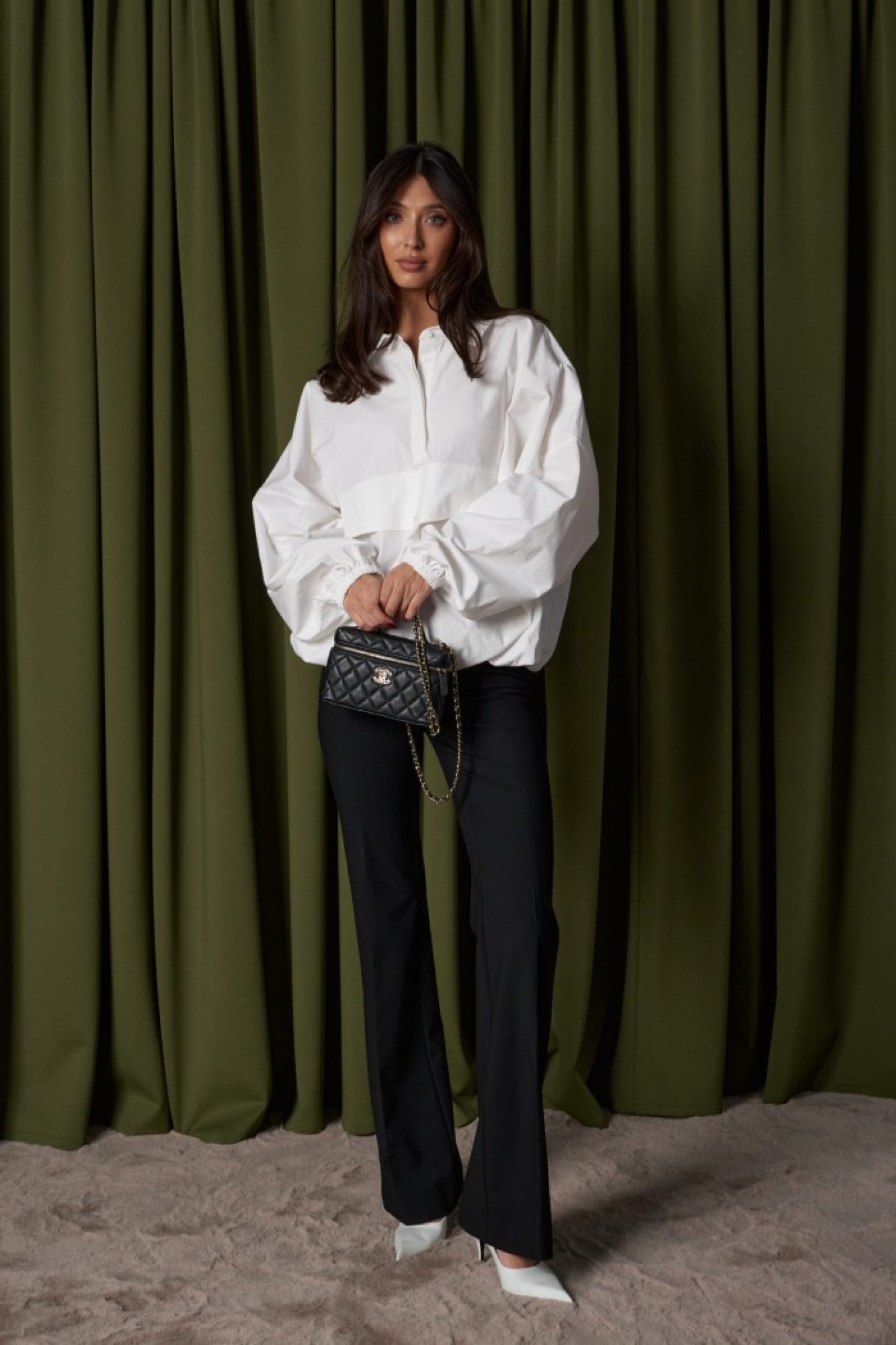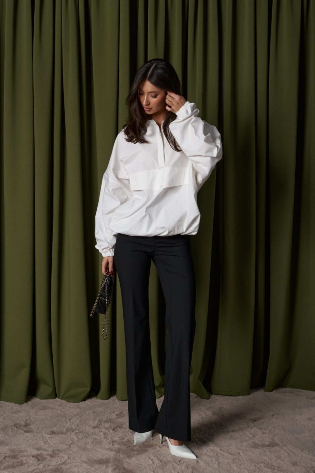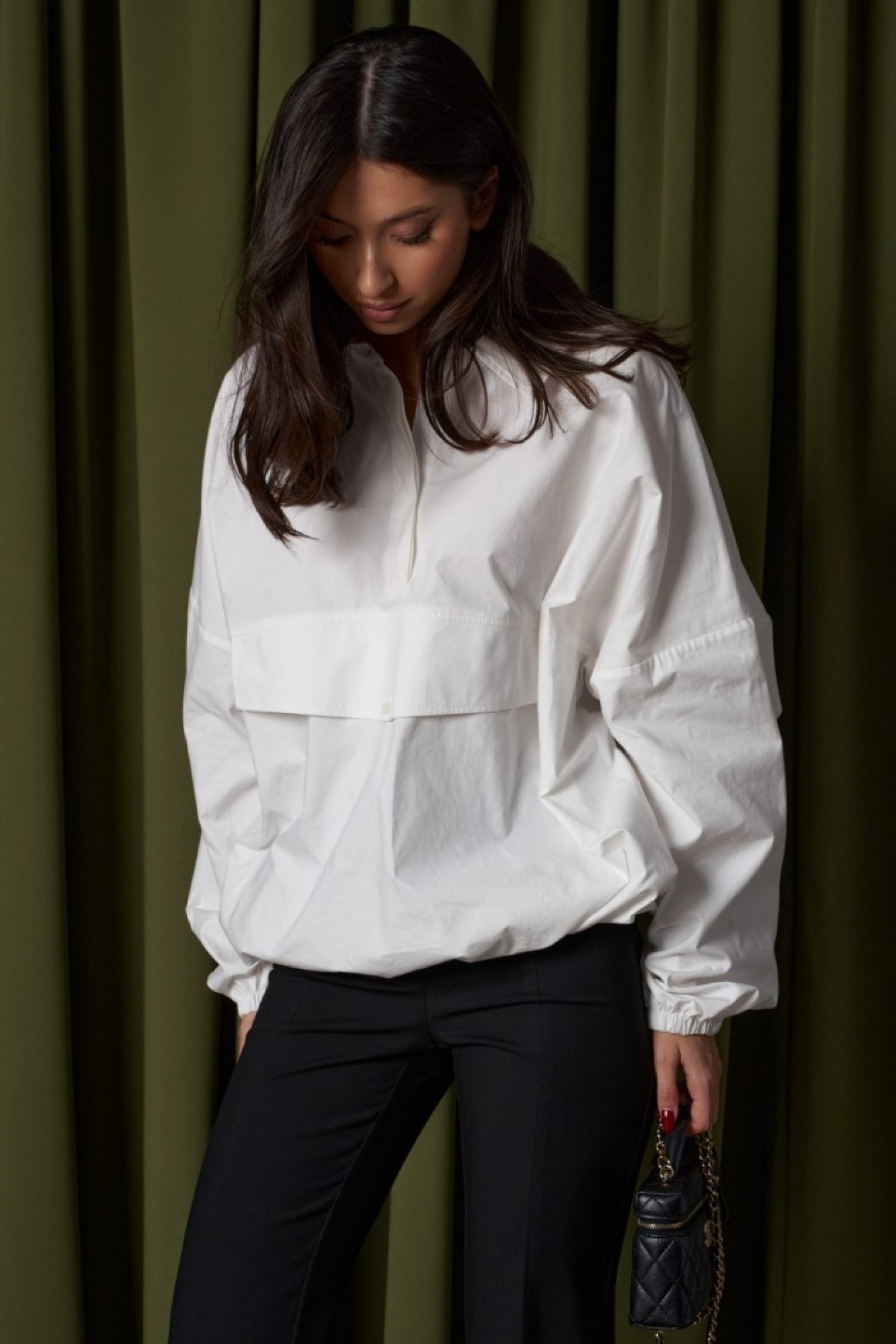 Блузон прямого свободного кроя выполнен из хлопковой ткани. Характеристики: отложной воротник, застежка центральная на петли пуговицы, по переду имитация кармана. Низ изделия на резинке с фиксатором. Плечо спущено, рукав свободный, низ рукава на резинке.