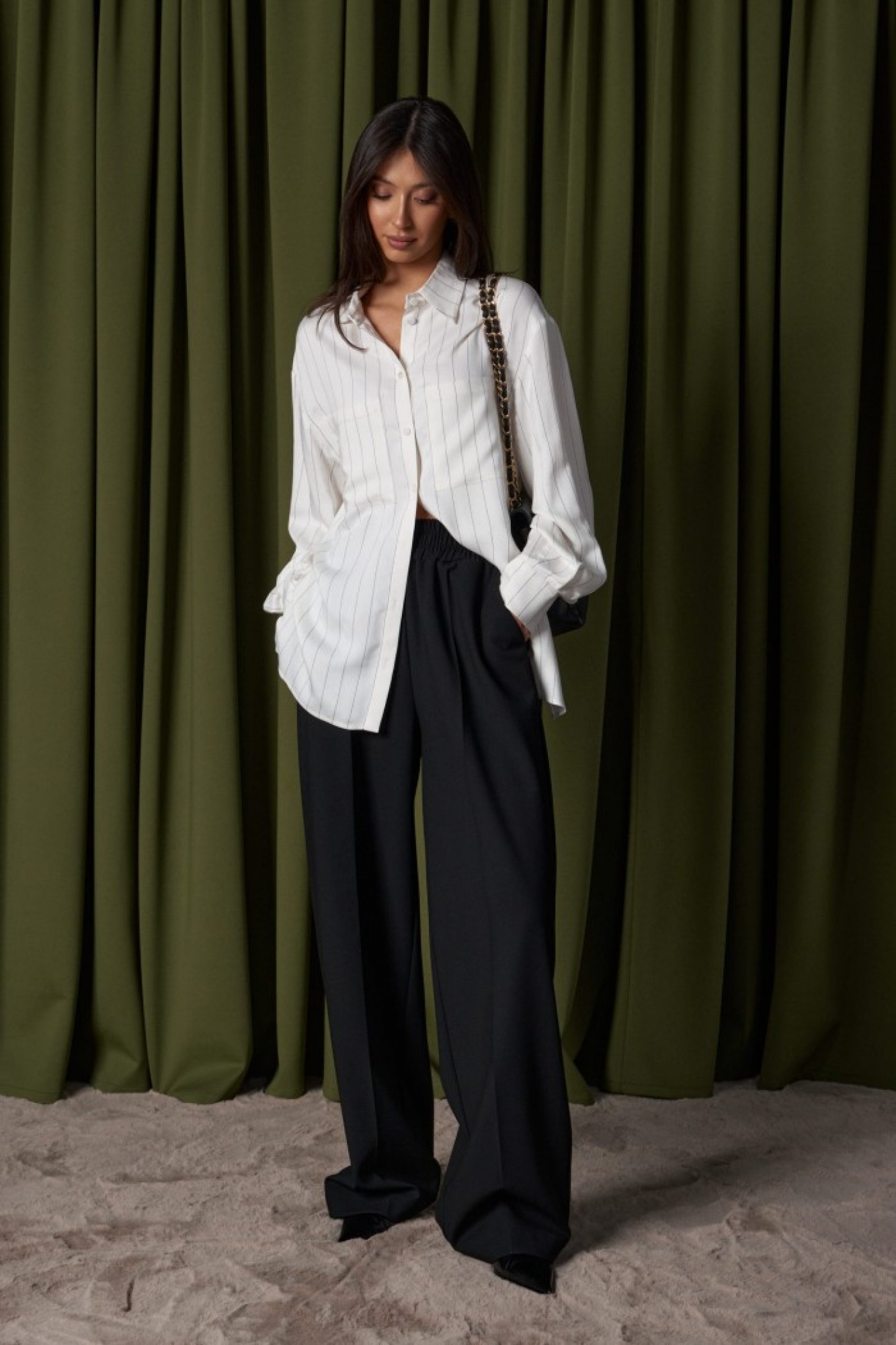 Рубашка свободного кроя выполнена из текстильного полотна бежевого цвета с геометрическим принтом. Характеристики: прямой крой, горловина круглая с отложным воротником на стойке, рукав втачной, немного спущен, с манжетой на двух пуговицах, в боковых швах разрезы 27см, на груди функциональные карманы.