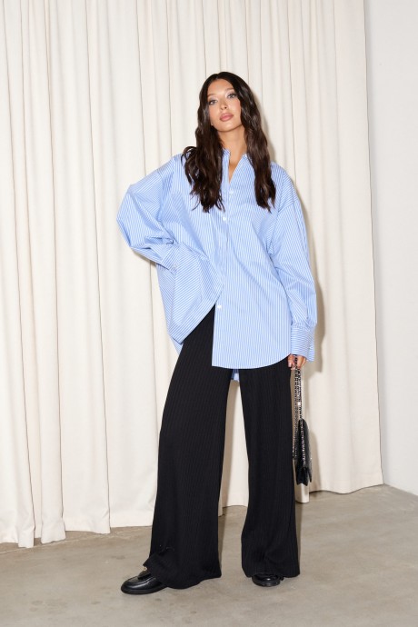 Рубашка прямого кроя выполнена из ткани голубого цвета с принтом белая вертикальная полоска. Характеристики: прямой свободный крой, отложной воротник на стойке, застежка центральная на петли пуговицы, рукав спущен, рукав с декоративными складками, по низу широкая манжета с имитацией запонки на пуговице. Спинка отрезная с декоративными складками, низ изделия с плавным срезом.