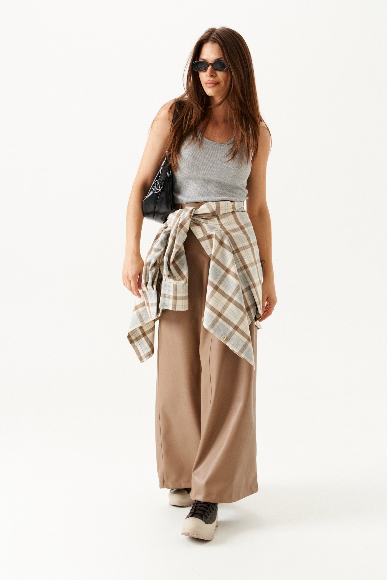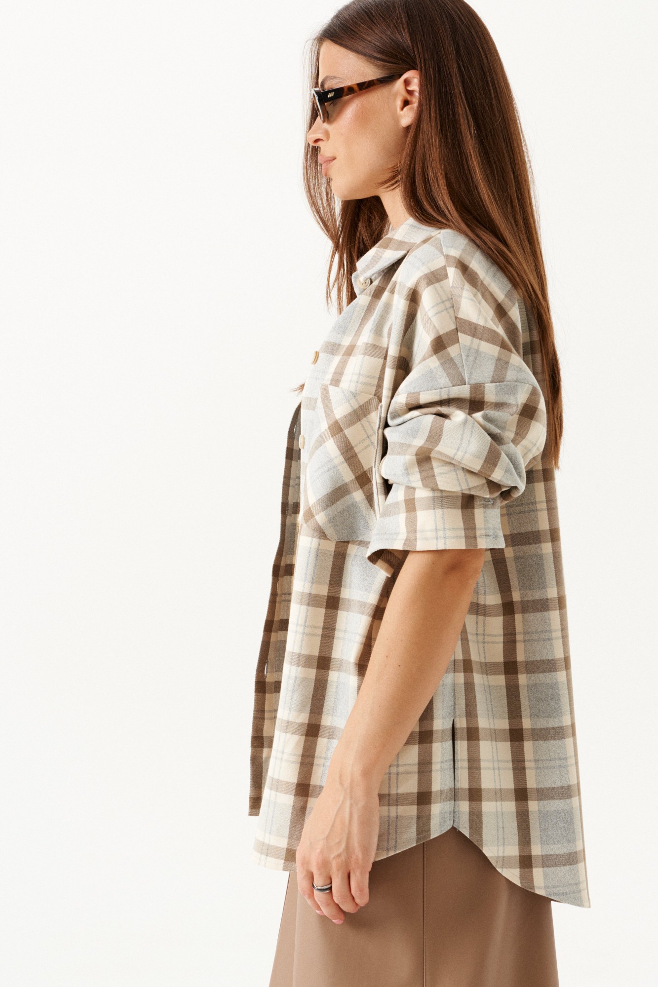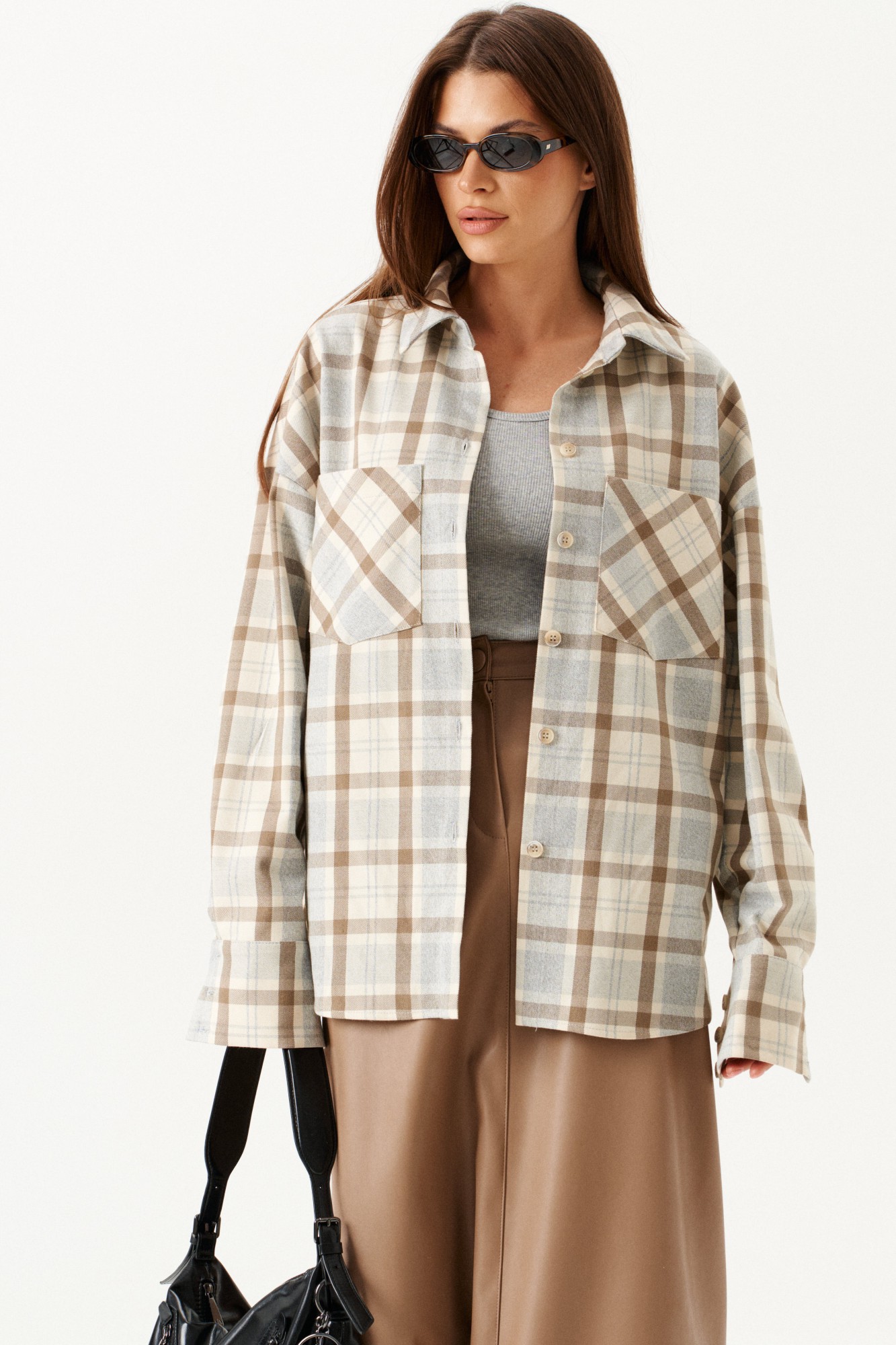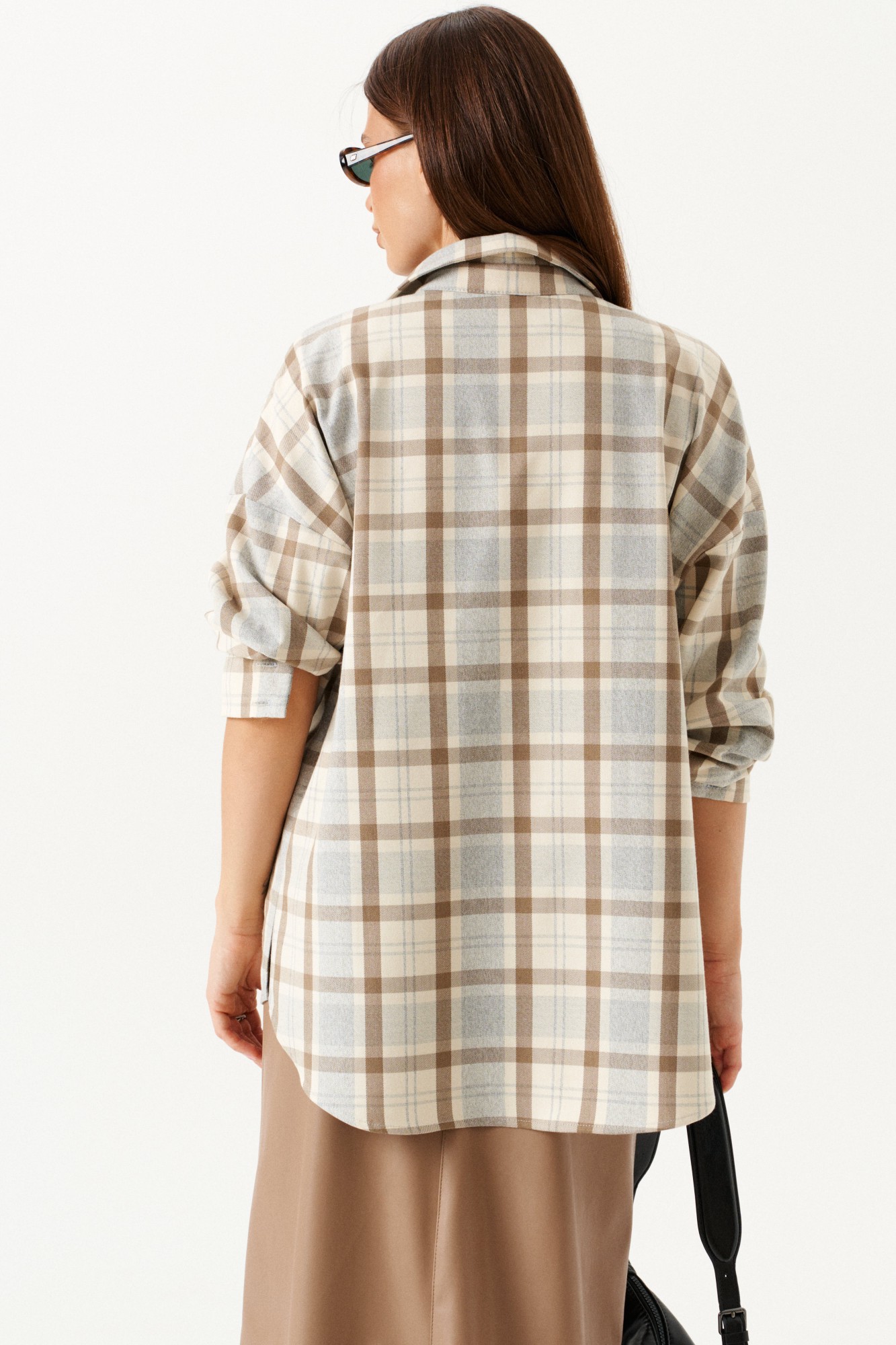 Блузка прямая, свободная, с центральной застежкой на петли и пуговицы. Воротник рубашечный, отложной, на притачной стойке. По полочкам в верхней части – симметричные накладные карманы. Спинка цельная. Боковые швы заканчиваются разрезом. Рукав втачной, длинный, с отрезной манжетой. Манжеты с застежкой на петли и пуговицы.