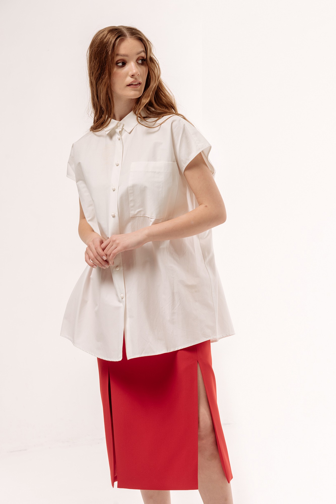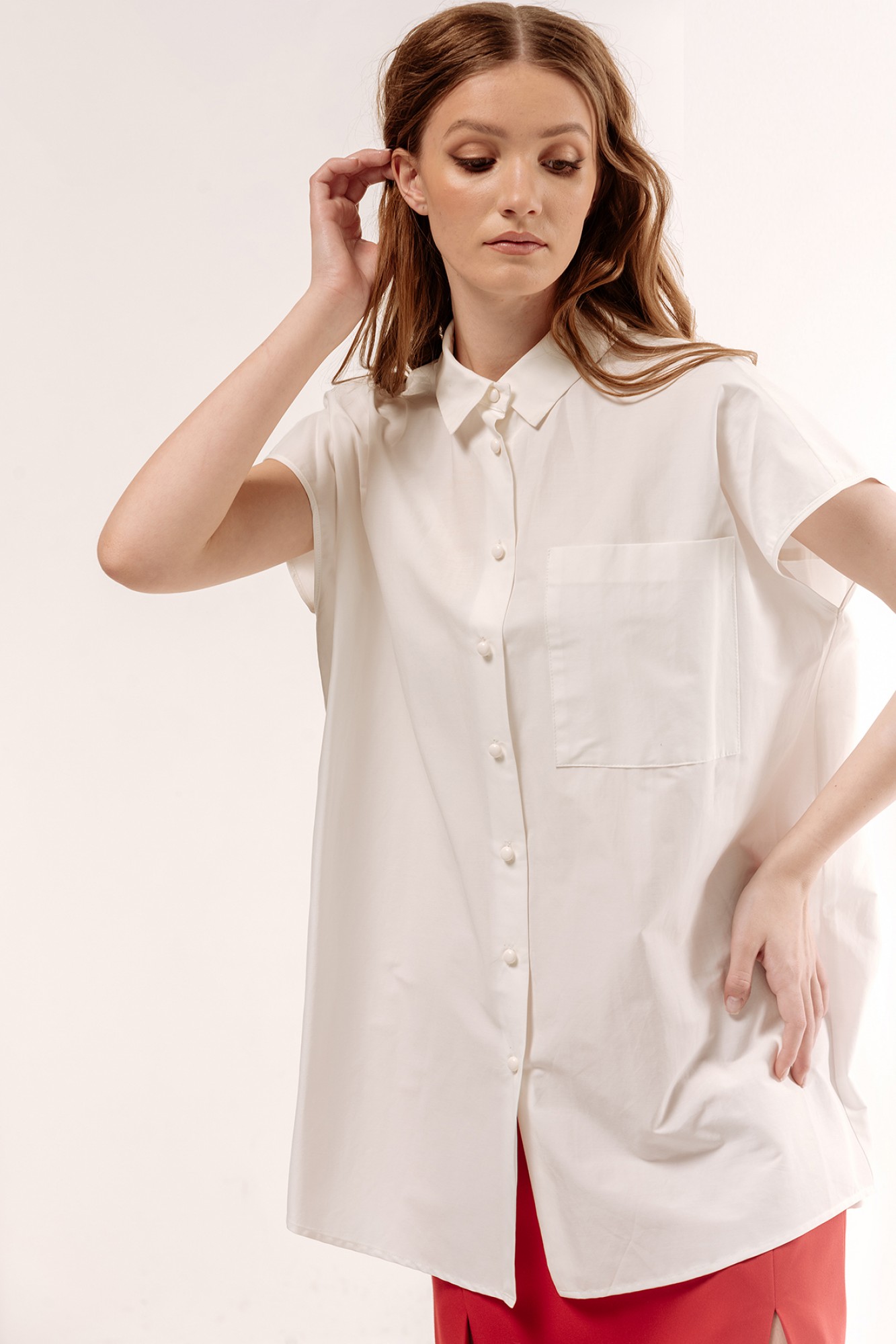 Рубашка оверсайз со спущенным плечом без рукава. Характеристики: свободный силуэт, выполнена из рубашечной ткани в белом цвете, центральная застежка на петли и пуговицы, по спинке отрезная кокетка и сборка.
