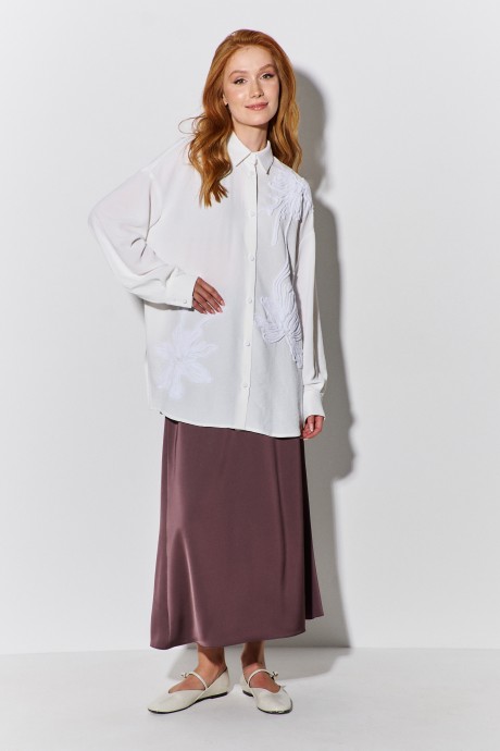Рубашка свободного силуэта с вышивкой. Характеристики: выполнена из рубашечной ткани в молочном цвете, по полочкам объемная вышивка, центральная застежка на петли и пуговицы, по спинке отрезная кокетка и складка, низ рукава обработан манжетой на петли и пуговицы. Длина рубашки по переду 76 см, длина рукава 55 см.