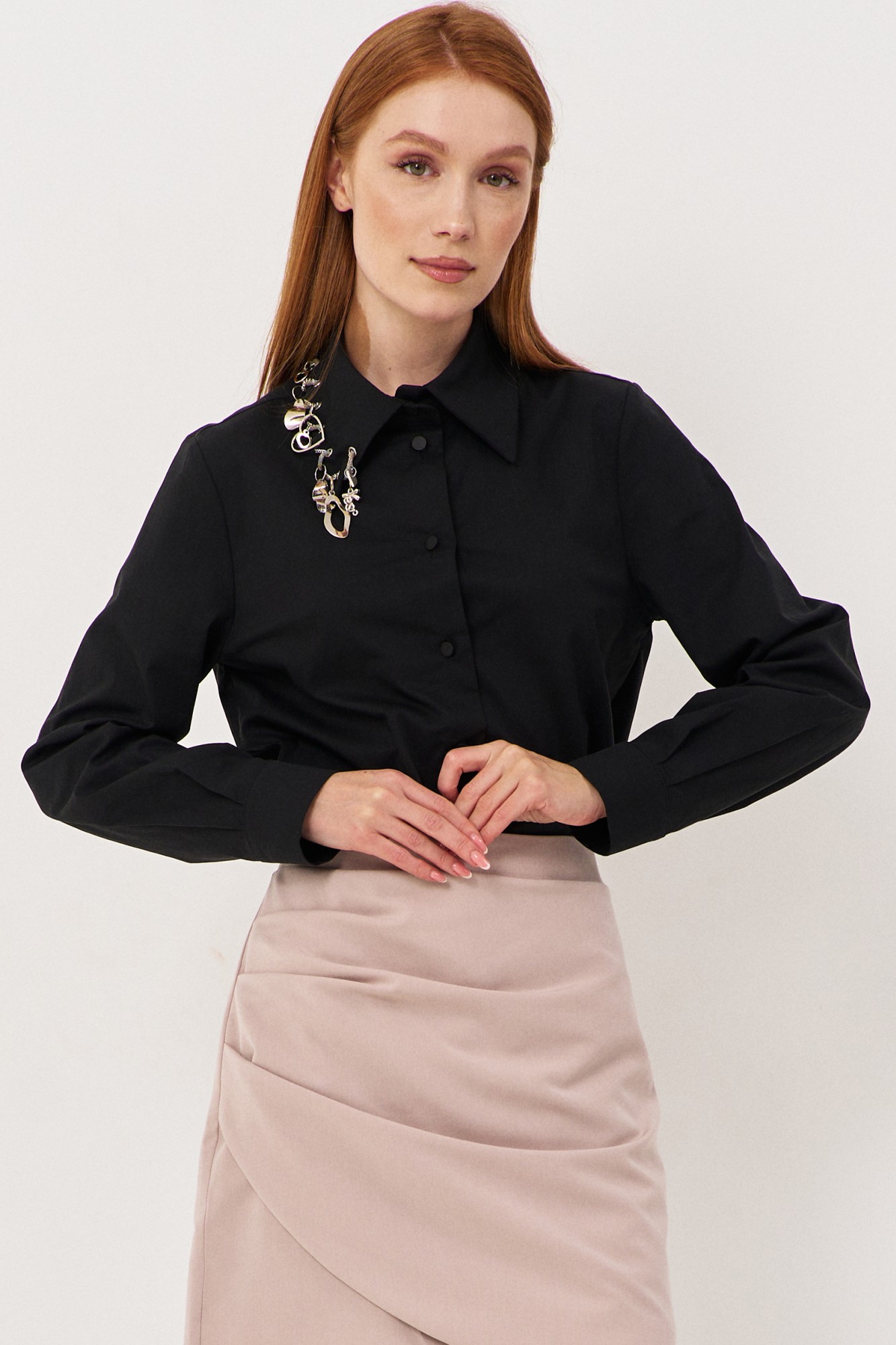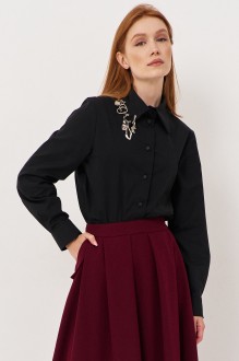Рубашка прямого кроя с декоративными подвесками по воротнику. Характеристики: выполнена из рубашечной ткани в черном цвете, по воротнику декоративные подвески, центральная застежка на петли и пуговицы, по низу рукавов манжеты с защипами. Длина рубашки по переду 68,5 см, длина рукава 60,5 см.