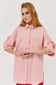 Рубашка свободного силуэта с декоративными рукавами. Характеристики: выполнена из рубашечной ткани в персиковом цвете, центральная застежка на петли и пуговицы, по спинке отрезная кокетка со сборкой, рукав обработан в виде декоративной розы.