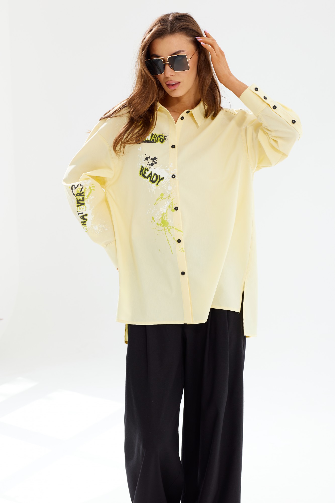 Блузка женская прямого силуэта с декором по правой части переда и рукаву в виде авторской печати. Перед разрезной с нагрудными вытачками и центральной застежкой на петли и пуговицы. Спинка с кокеткой, по нижней части заложена широкая складка. Плечо спущено. Рукав длинный, по низу обработан широкой притачной манжетой, застегивающейся на петли и пуговицы. Низ прямой формы, перед короче спинки. Горловина обработана воротником рубашечного типа с отрезной стойкой. Цвет материала может отличаться по тону в зависимости от настроек вашего устройства!