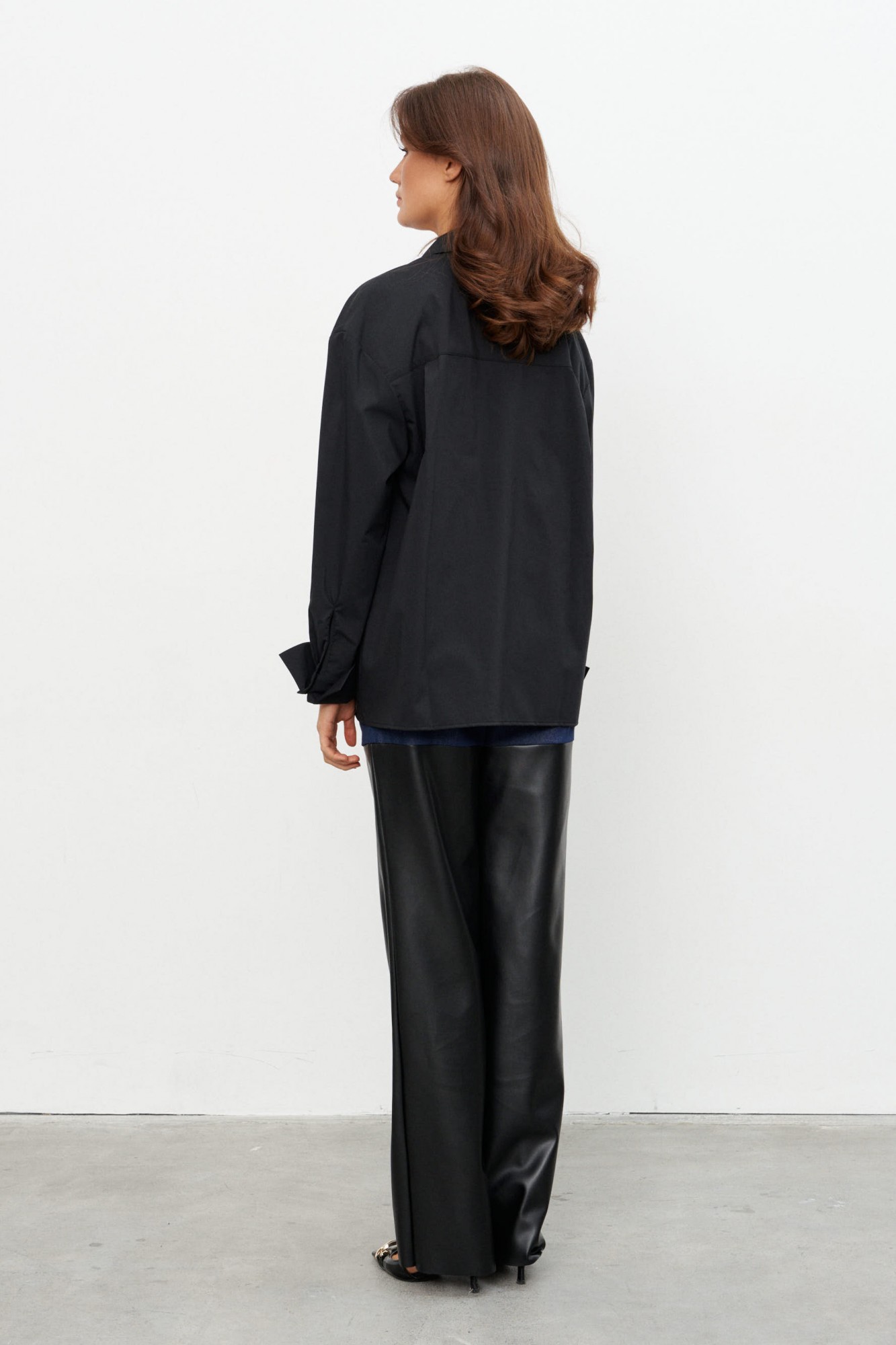 Хлопковая рубашка с дизайнерским решением по переду в виде переплетённых обтачных деталей. Линия плеча спущена, рукав с длинной манжетой, которую можно складывать пополам. Застёжка на планку с пуговицами спереди.