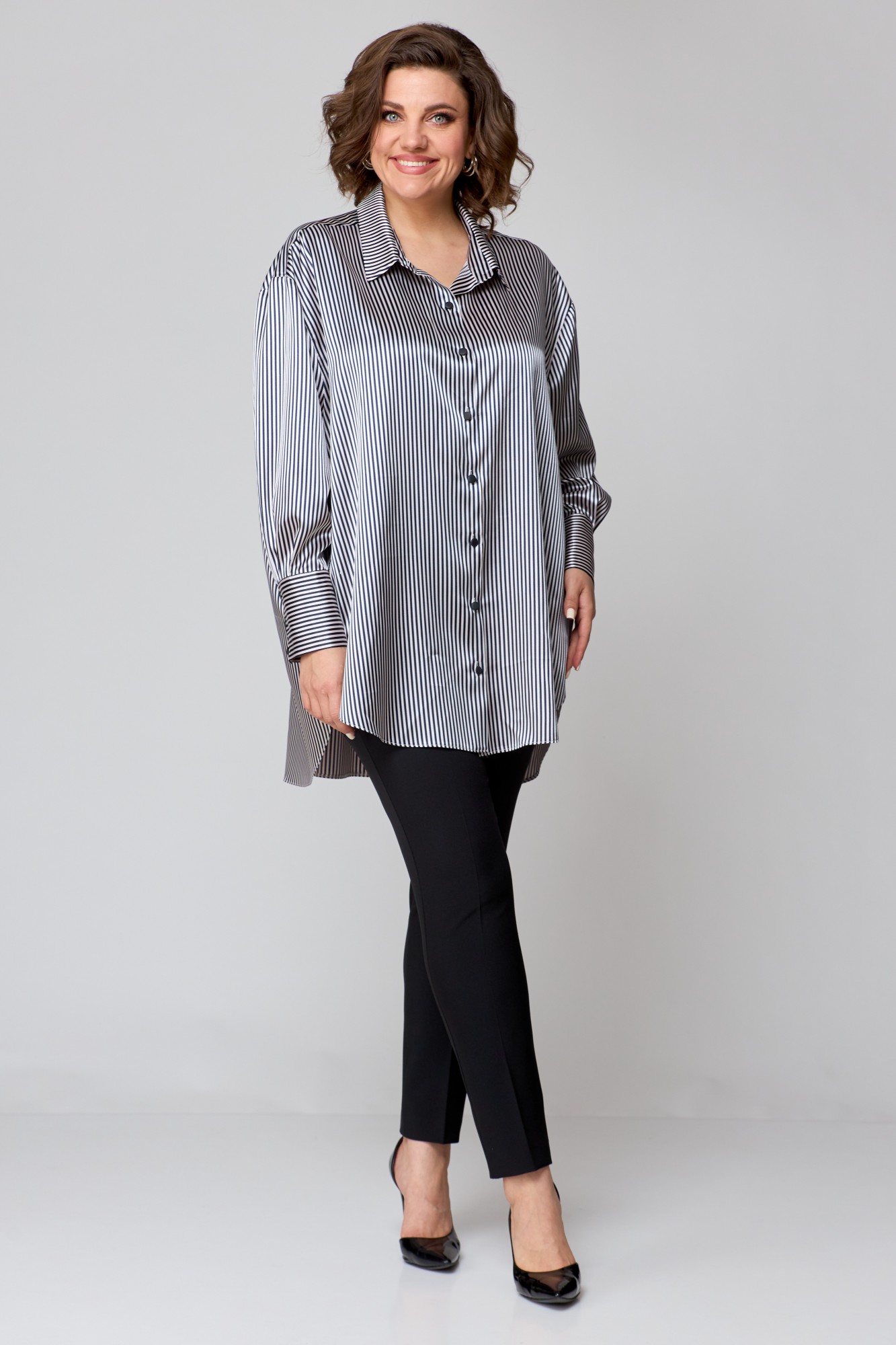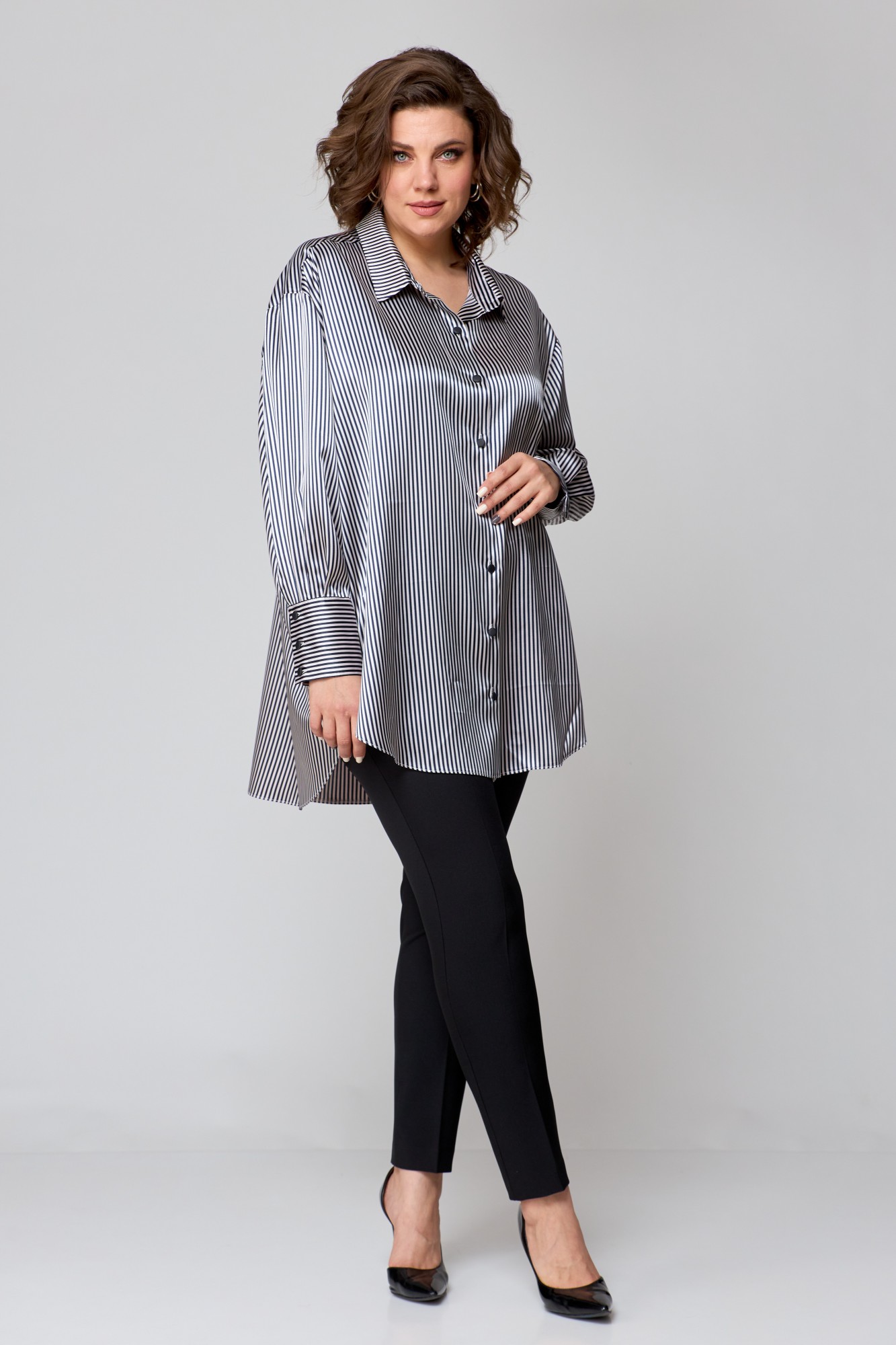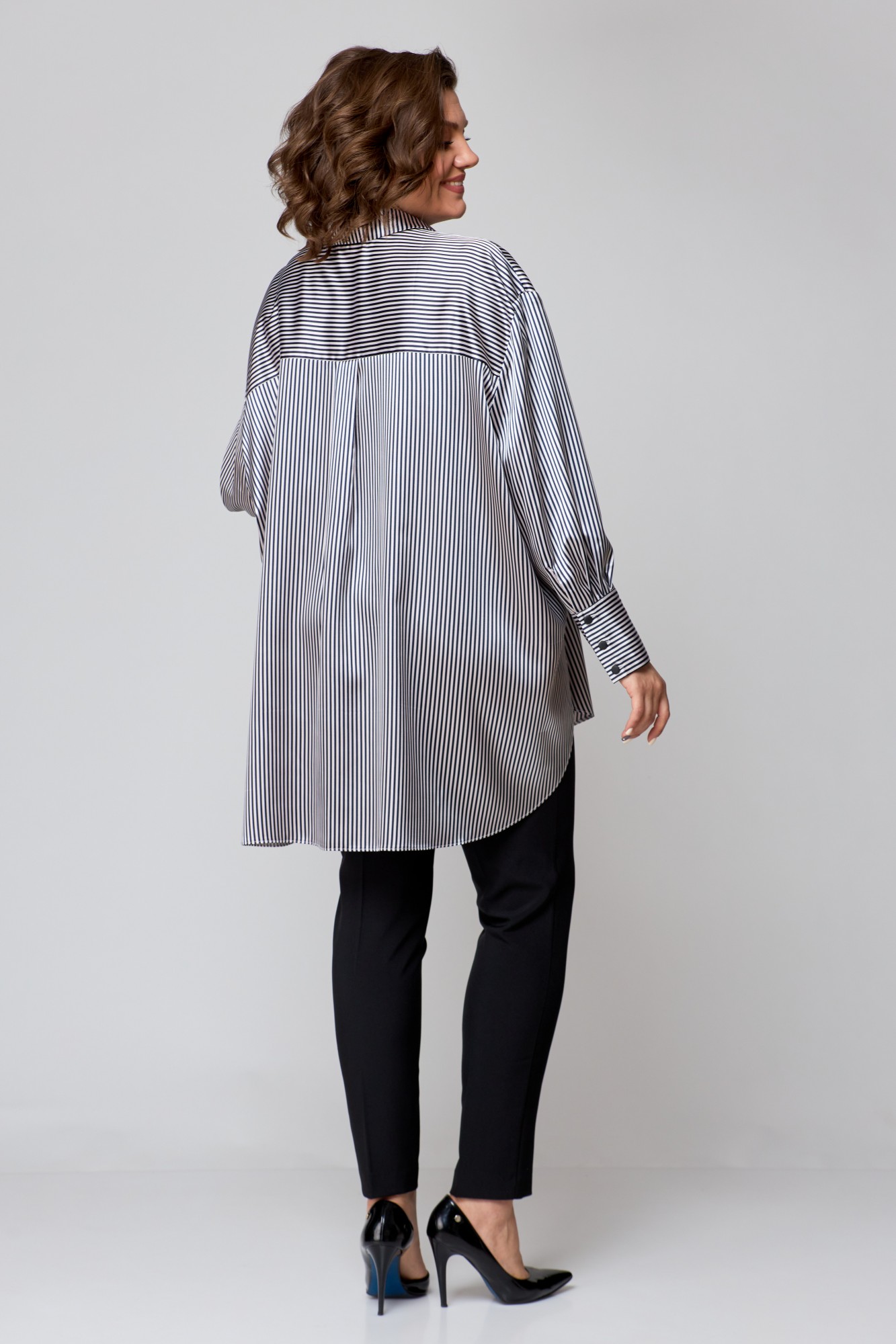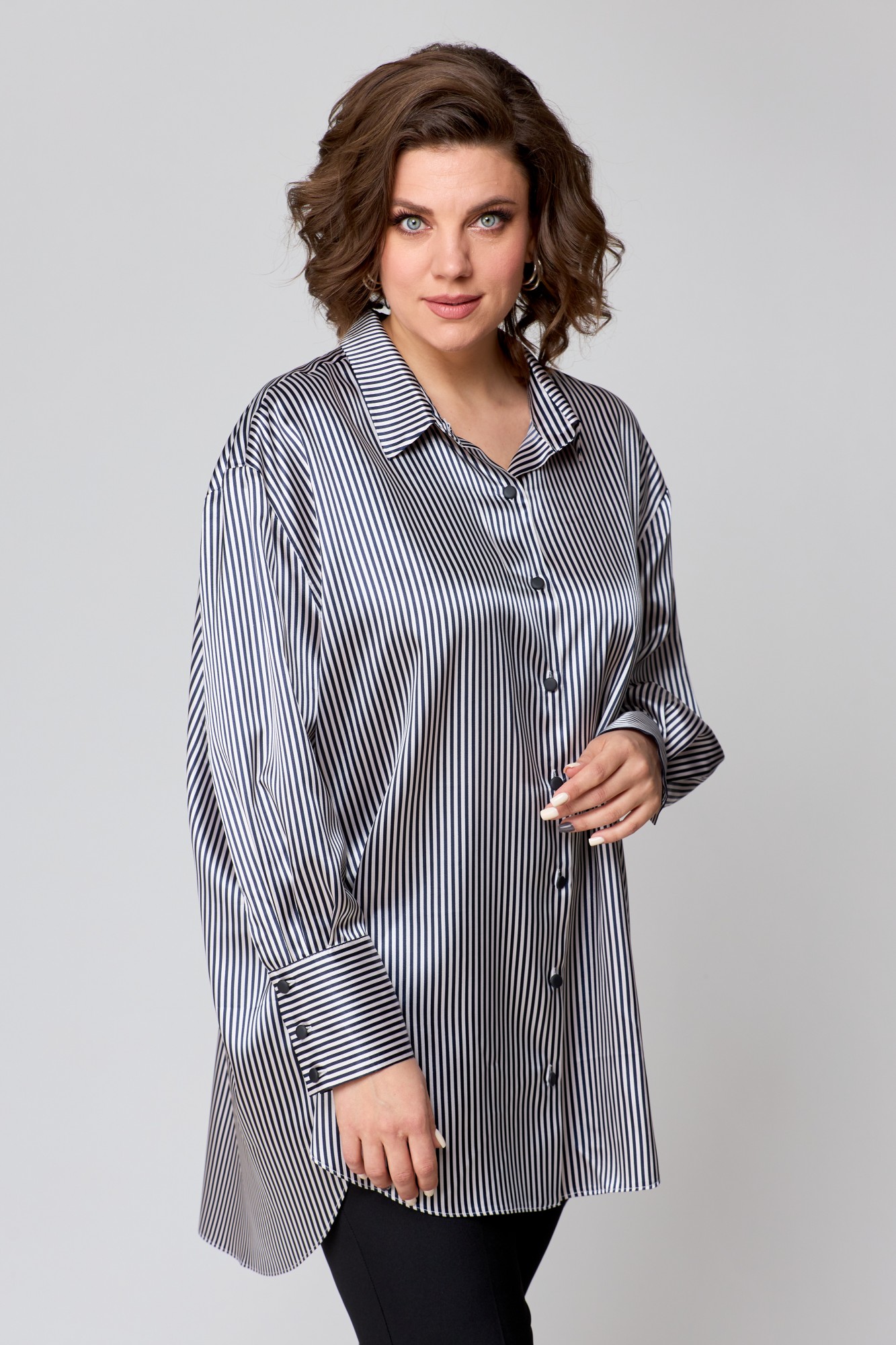 Рубашка женская свободно кроя, выполнена из легкой стрейчевой ткани с атласным переплетением, со спущенной линией плеча и втачным рукавом. Спинка с отрезной кокеткой и бантовой складкой. Рукав одношовный, по низу с притачной манжетой с застежкой на петли-пуговицы. По переду центральная застежка на петли -пуговицы. Боковые швы закругленной формы. Воротник рубашечный.