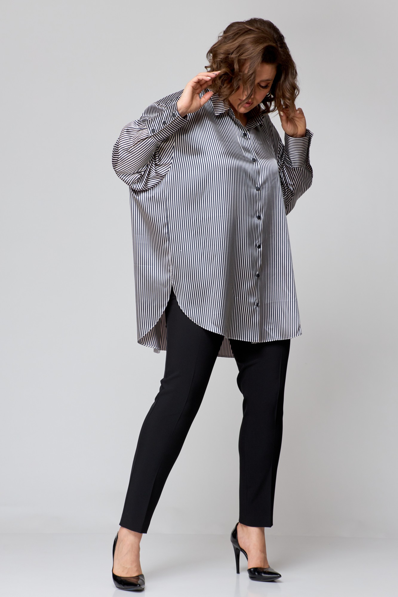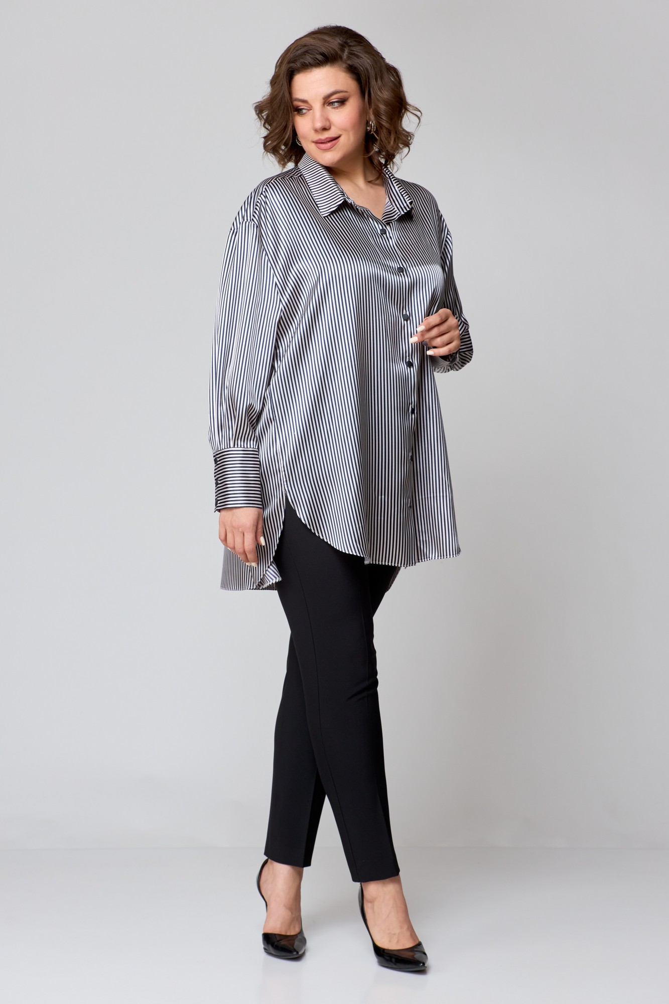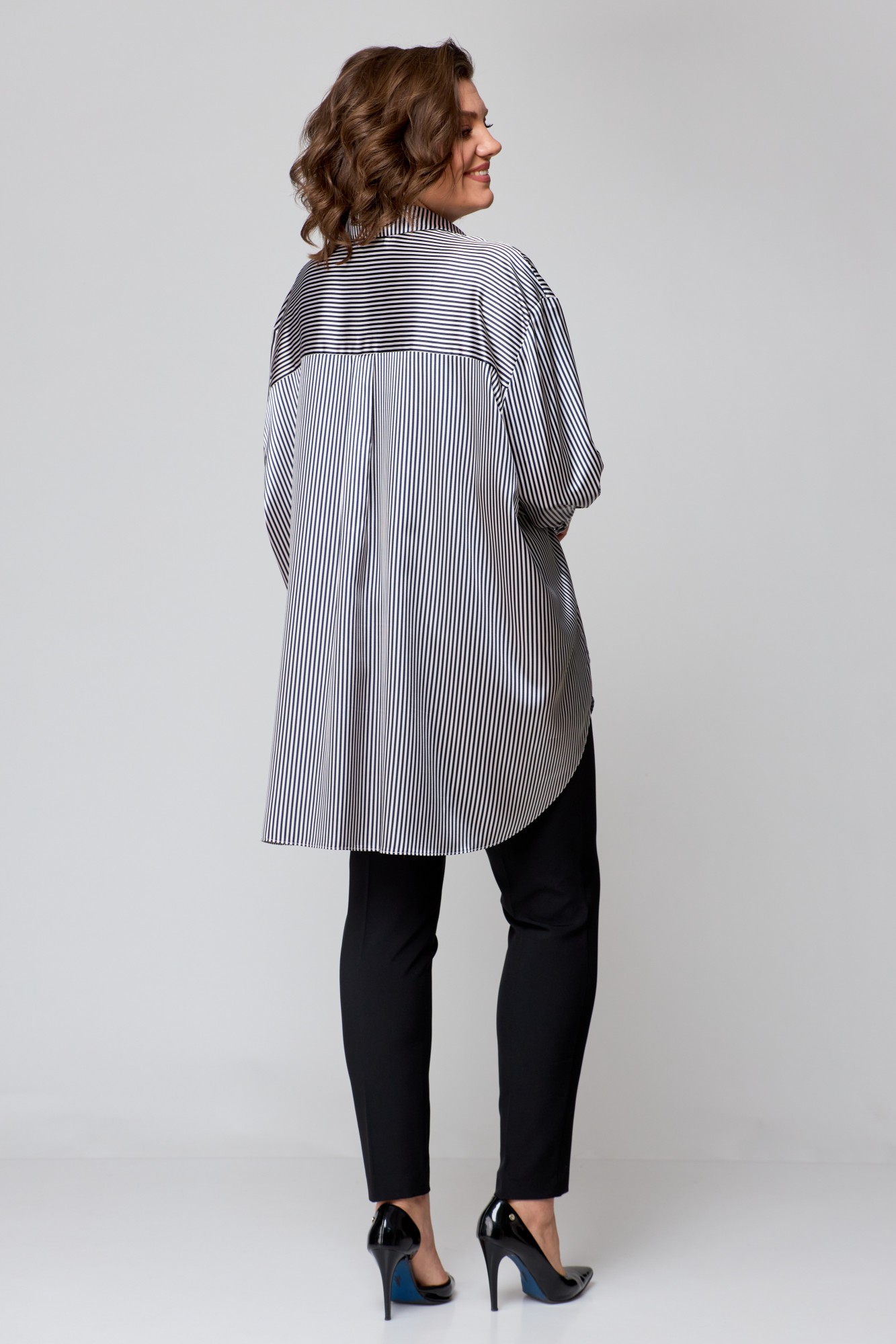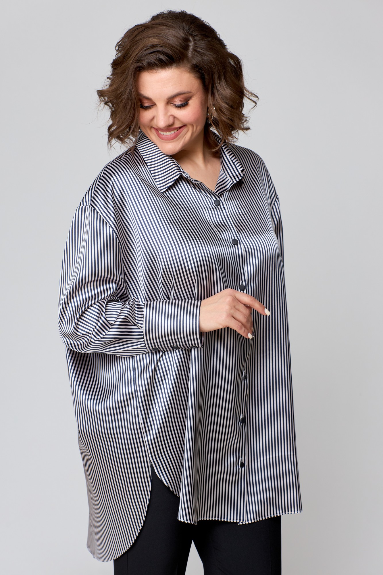 Рубашка женская свободно кроя, выполнена из легкой стрейчевой ткани с атласным переплетением, со спущенной линией плеча и втачным рукавом. Спинка с отрезной кокеткой и бантовой складкой. Рукав одношовный, по низу с притачной манжетой с застежкой на петли-пуговицы. По переду центральная застежка на петли -пуговицы. Боковые швы закругленной формы. Воротник рубашечный.