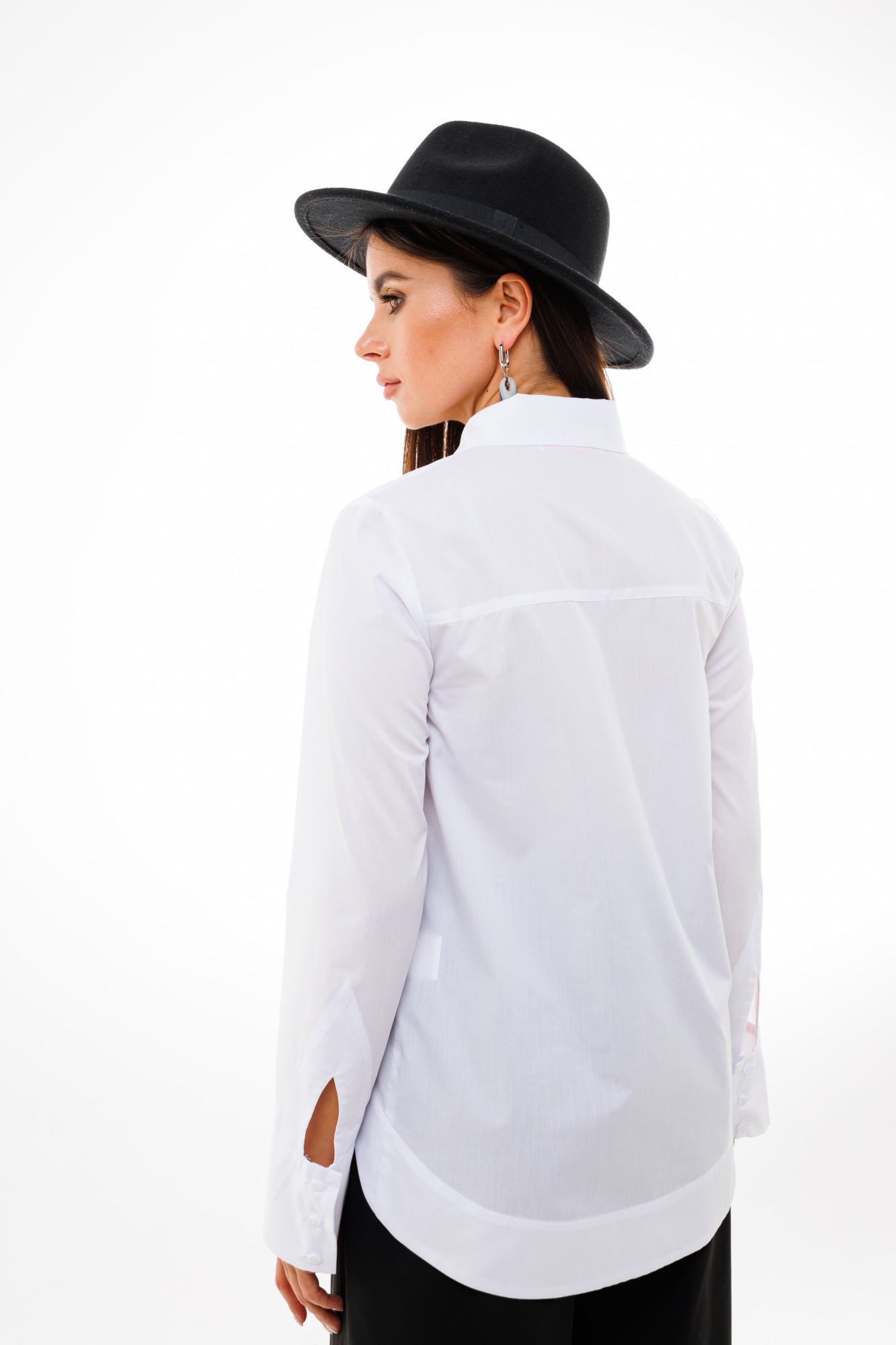 Запоминающиеся детали этой рубашки - треугольные вырезы под воротником и над манжетами.