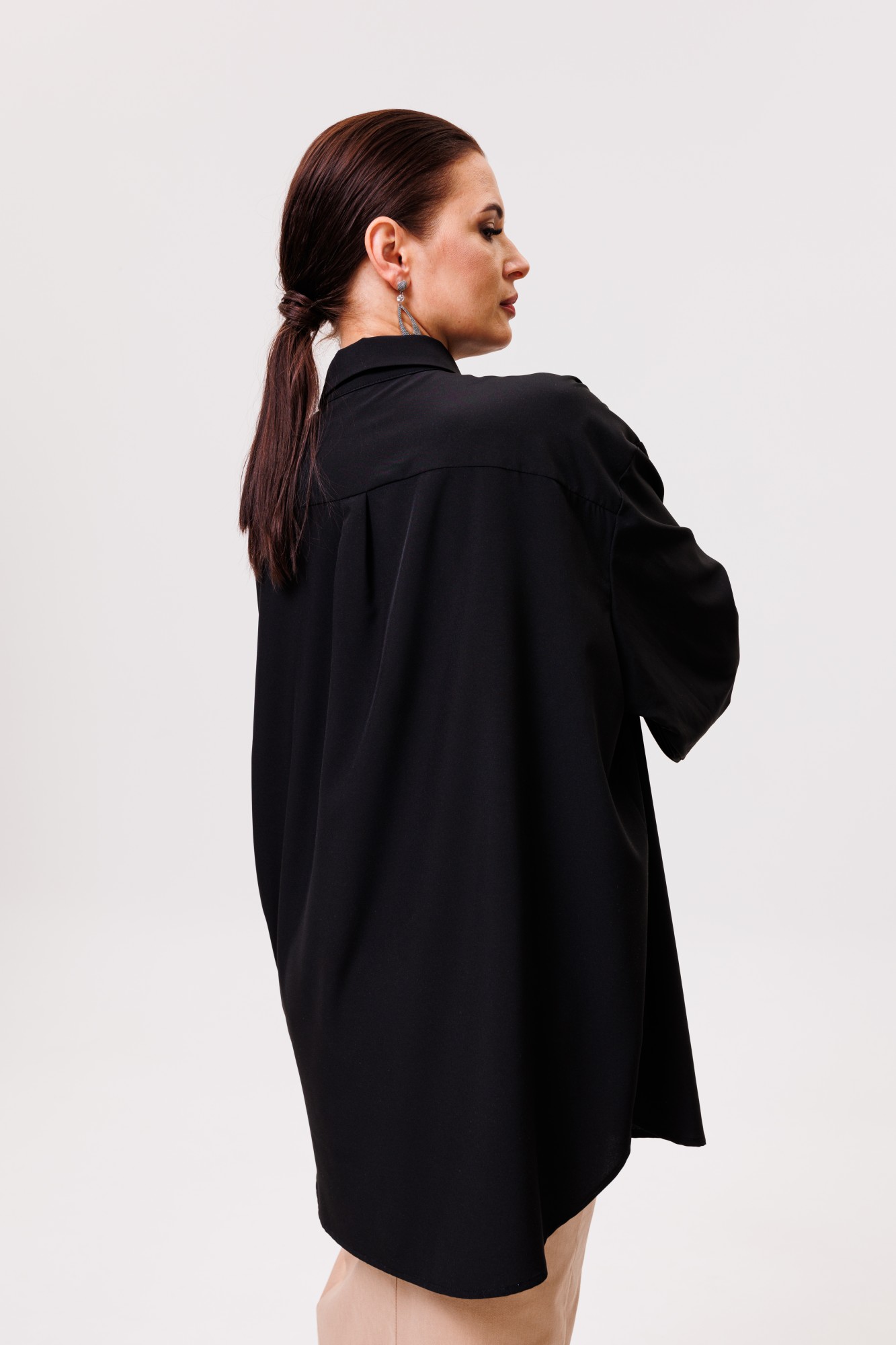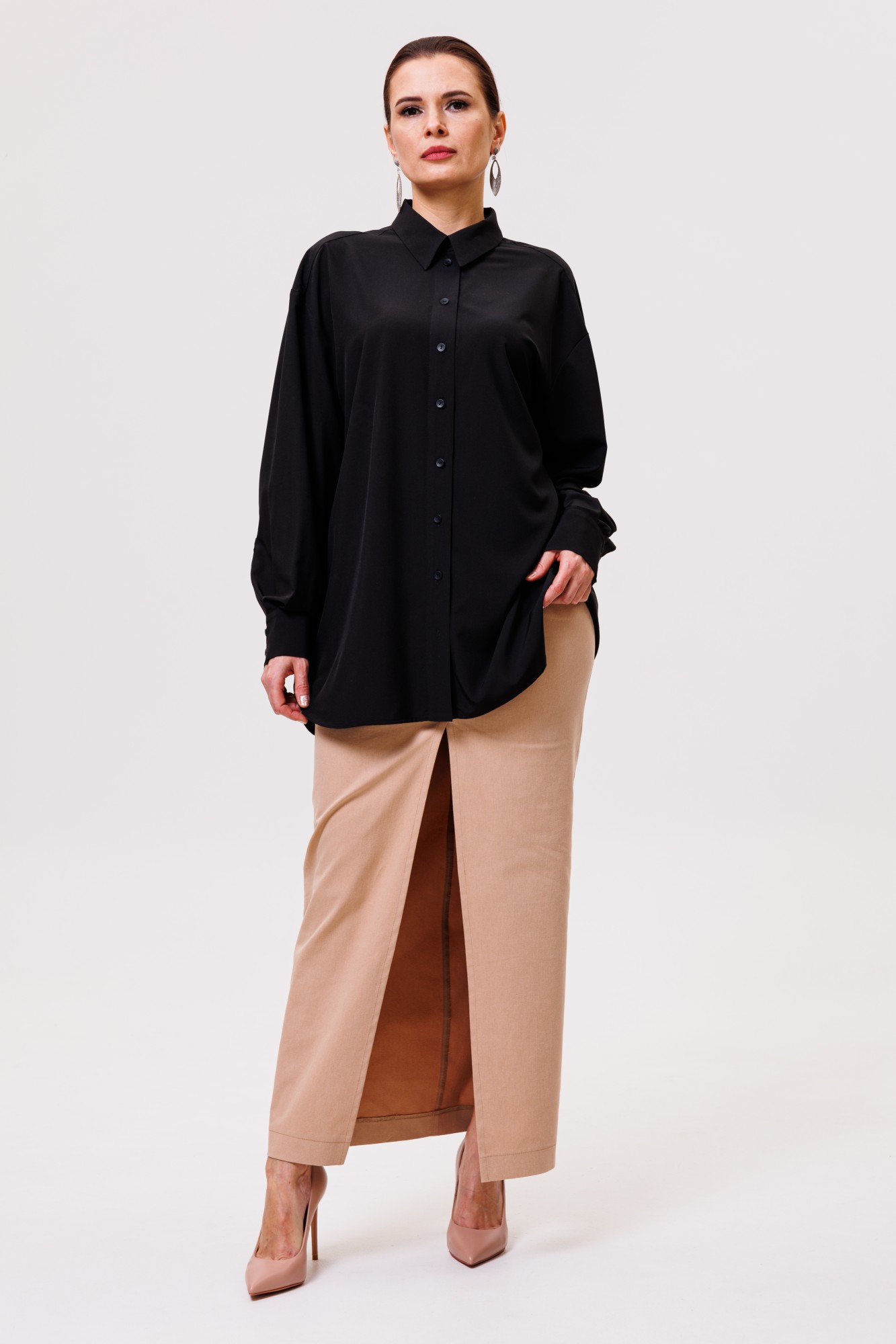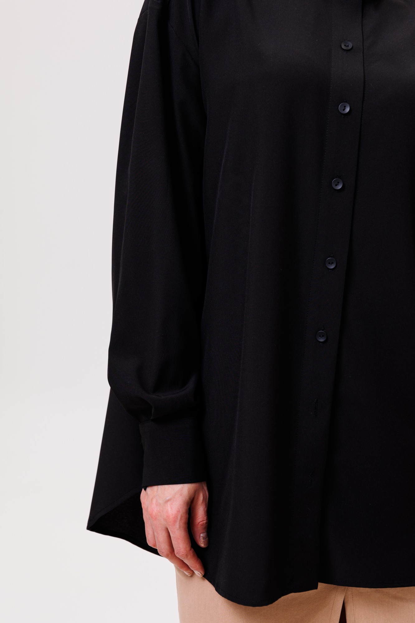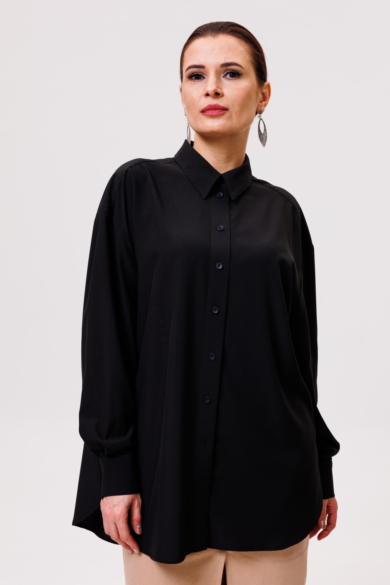 Рубашка большого объема, прямого силуэта. На детали спинки расположена двойная кокетка, переходящая на деталь полочки. Под кокеткой на спинке расположена встречная складка. Воротник рубашечный отложной на стойке. Застежка планка центральная на прорезные петли и пуговицы. Линия плеча спущенная, рукав рубашечный, длинный. В нижней части рукава заложены складки, заканчивается широкой манжетой с двумя прорезными петлями и пуговицами. Разрез рукава обработан планкой. Низ блузки разноуровневый: спереди короче, сзади длиннее.