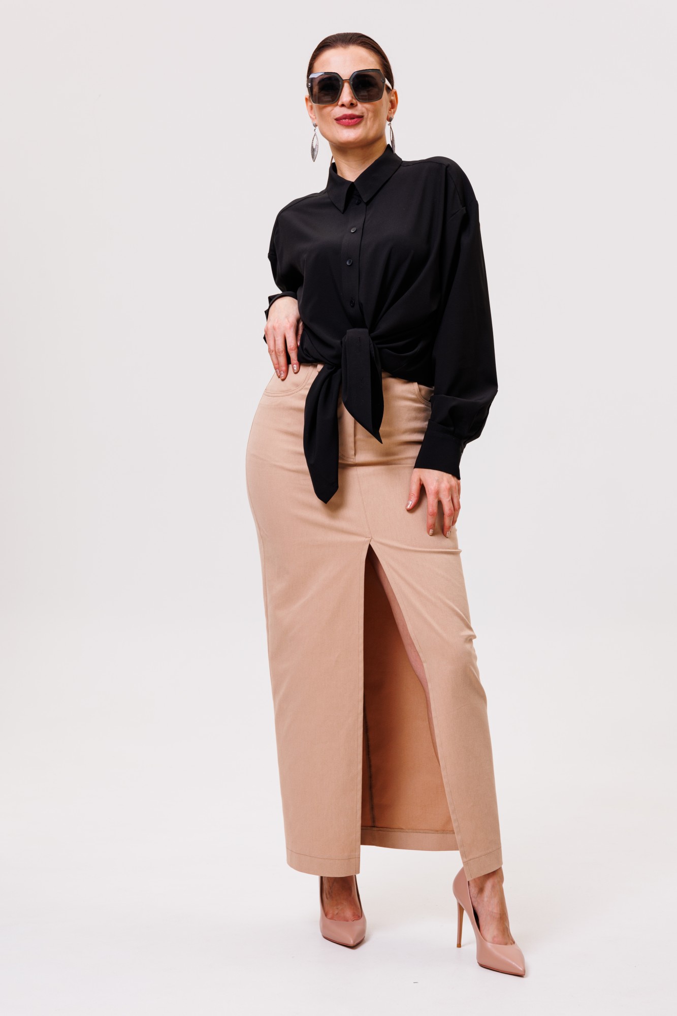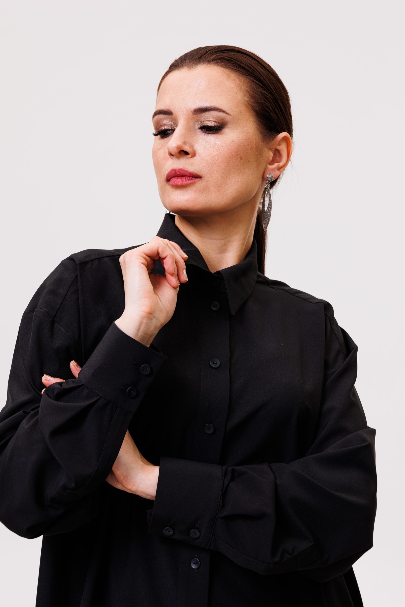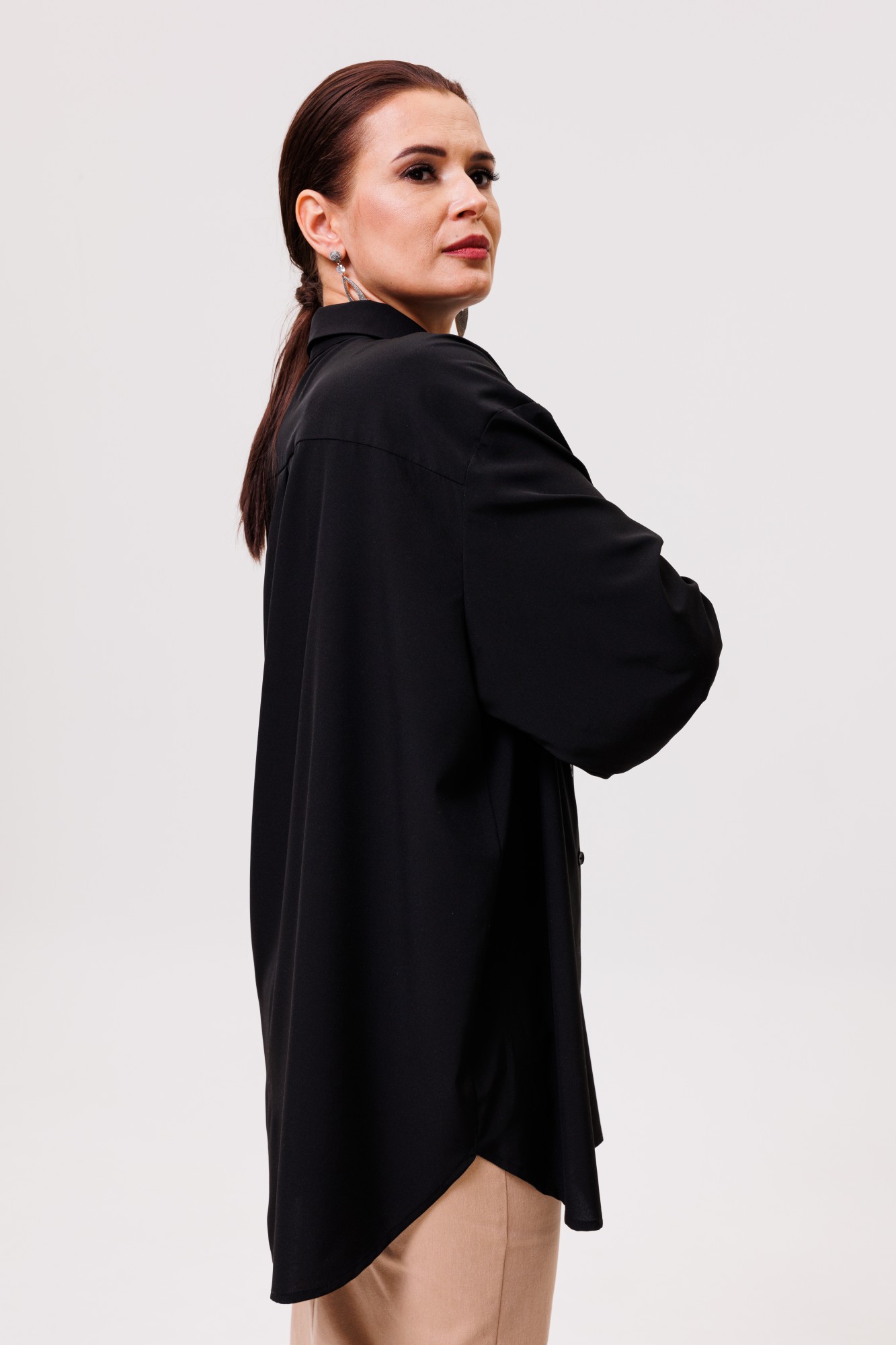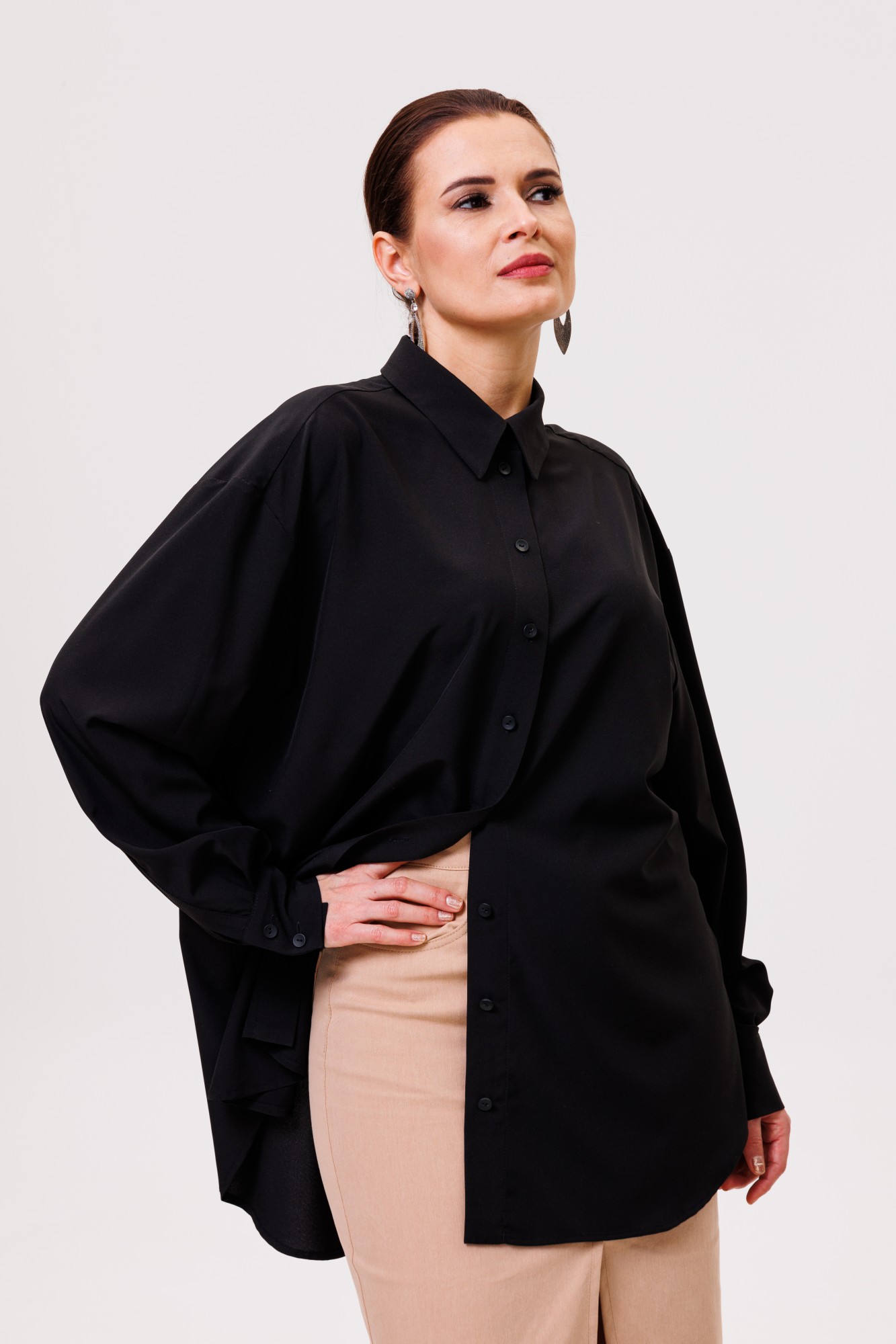 Рубашка большого объема, прямого силуэта. На детали спинки расположена двойная кокетка, переходящая на деталь полочки. Под кокеткой на спинке расположена встречная складка. Воротник рубашечный отложной на стойке. Застежка планка центральная на прорезные петли и пуговицы. Линия плеча спущенная, рукав рубашечный, длинный. В нижней части рукава заложены складки, заканчивается широкой манжетой с двумя прорезными петлями и пуговицами. Разрез рукава обработан планкой. Низ блузки разноуровневый: спереди короче, сзади длиннее.