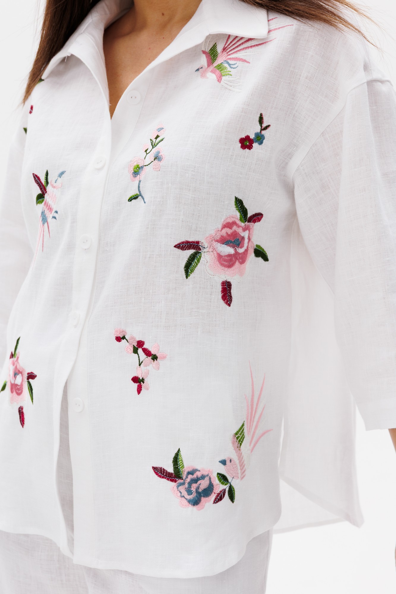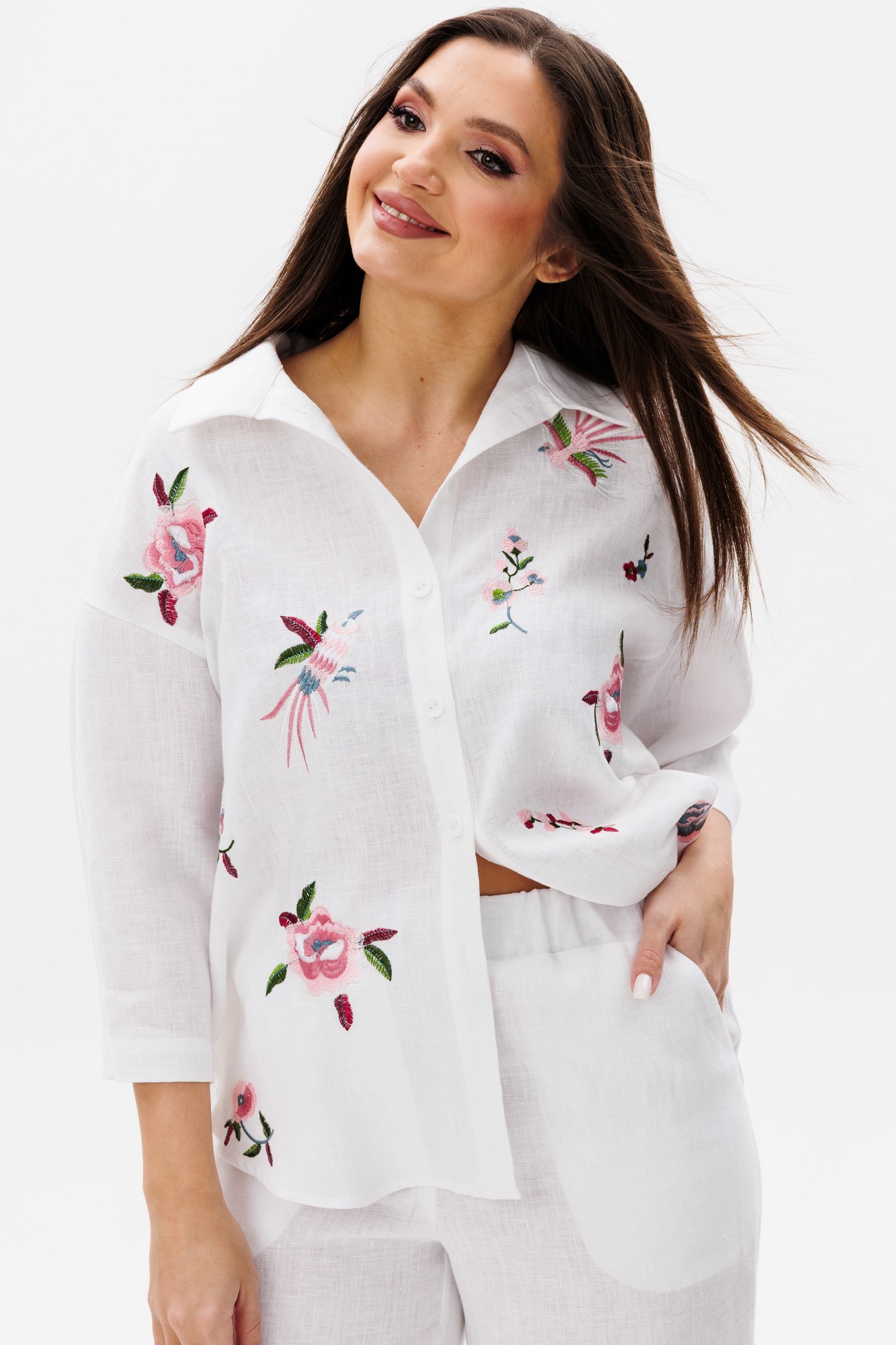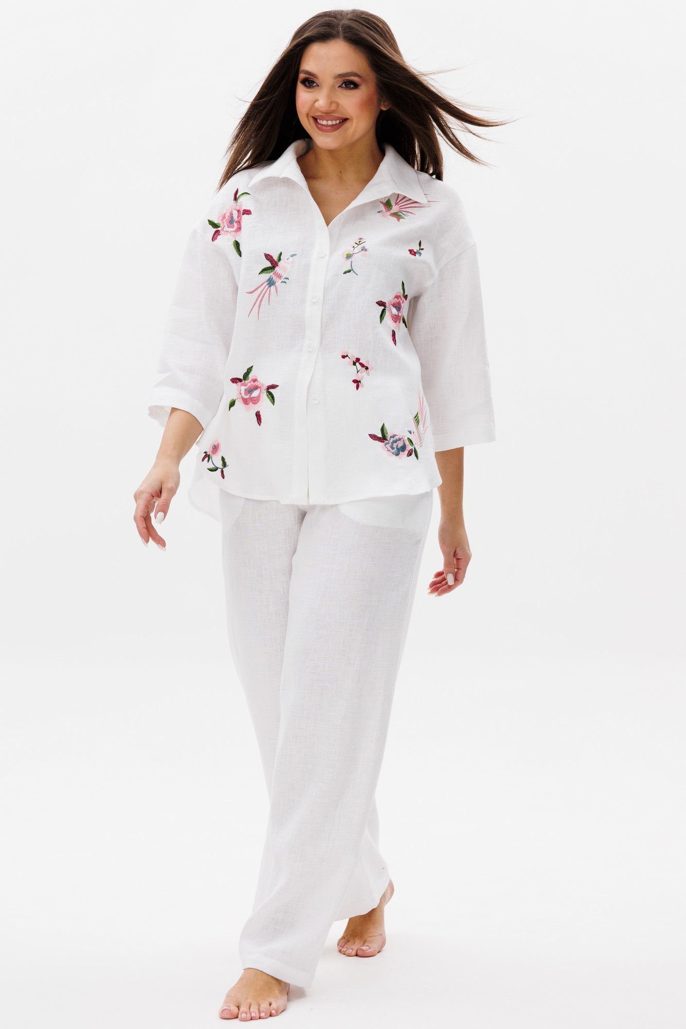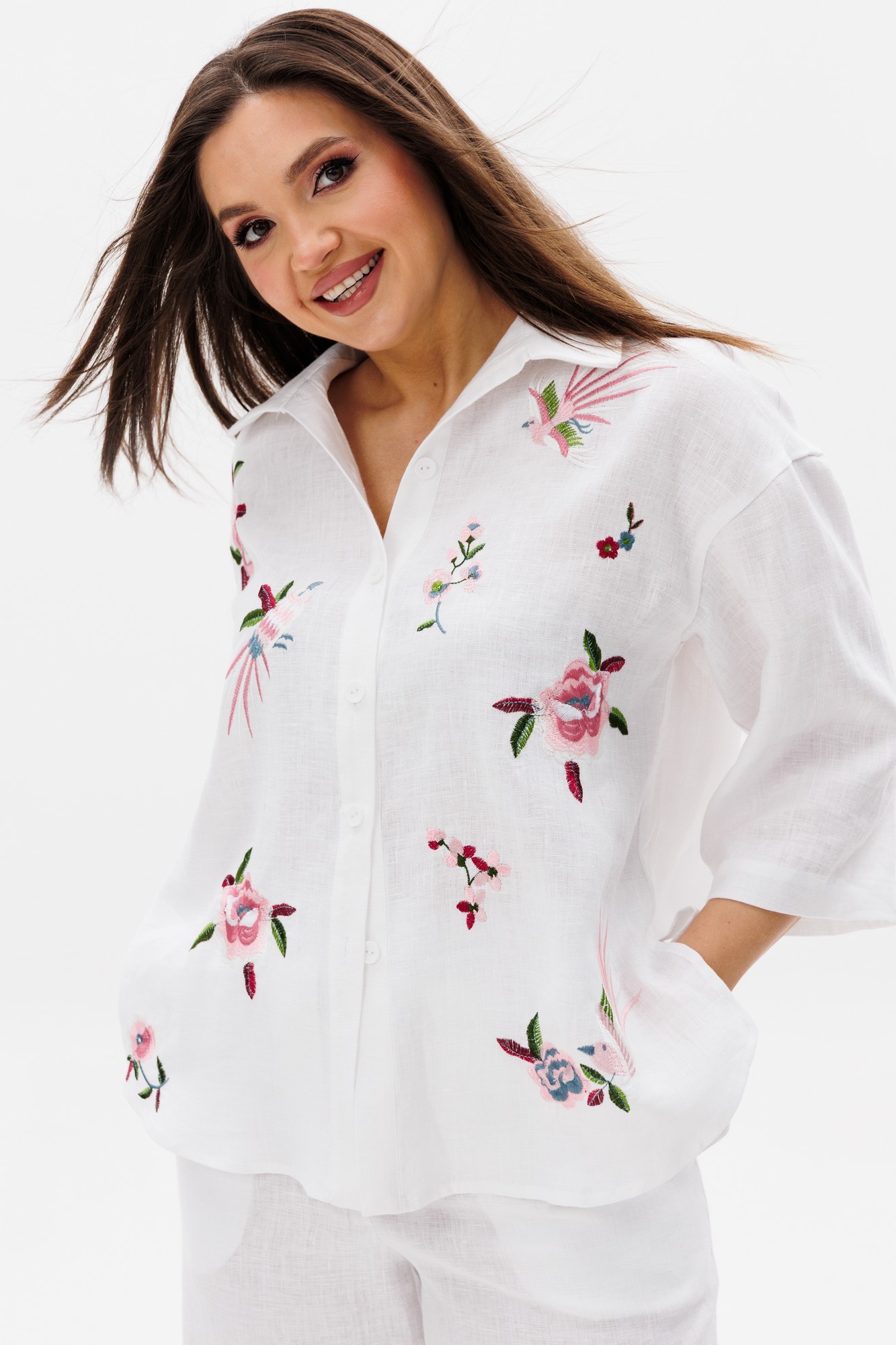 Воротник отложной рубашечного типа. Застежка центральная на петли и пуговицы, спинка с кокеткой. На полочке расположены дизайнерские вышивки. Рукав 3/4 со спущенной линией плеча, одношовный.
