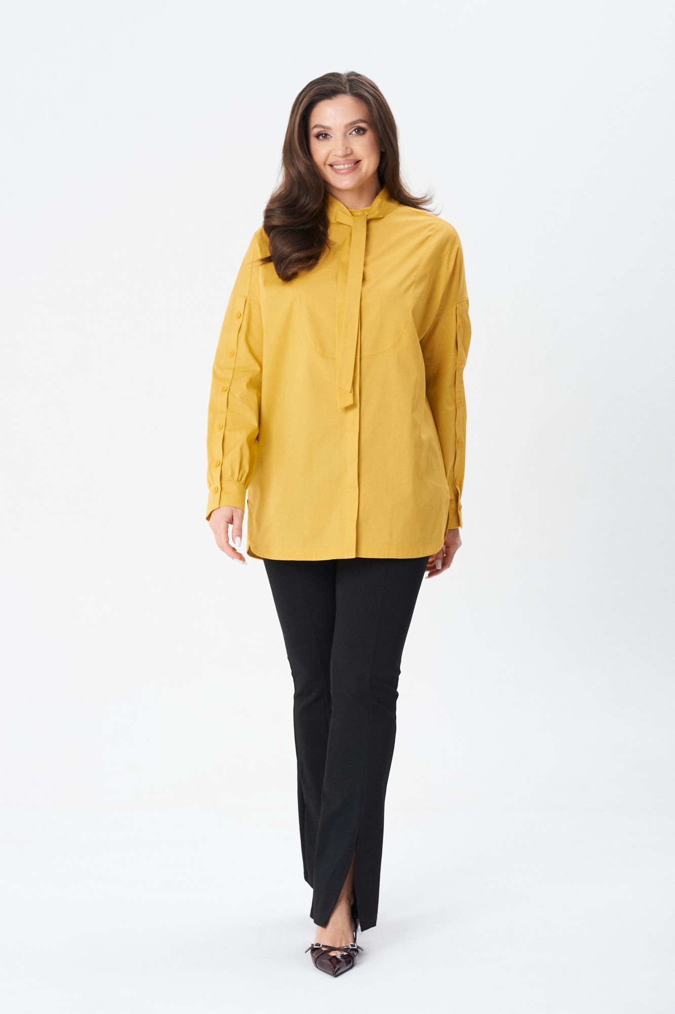 Стильная женская рубашка свободного кроя с воротником стойкой завязывающейся в бант и спущенной линией плеча. По переду планка на потайную застежку петли пуговицы. Рукав в тачной двух шовный с планкой на всю длину рукава и манжетой, застегивающейся на петли-пуговицы. Спинка изделия с кокеткой и заложенной складкой. Низ рубашки фигурный.