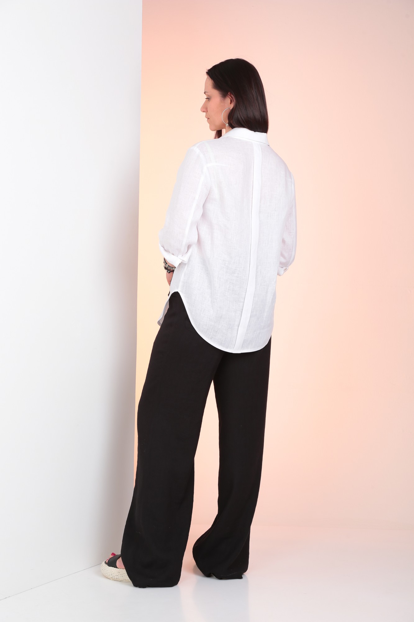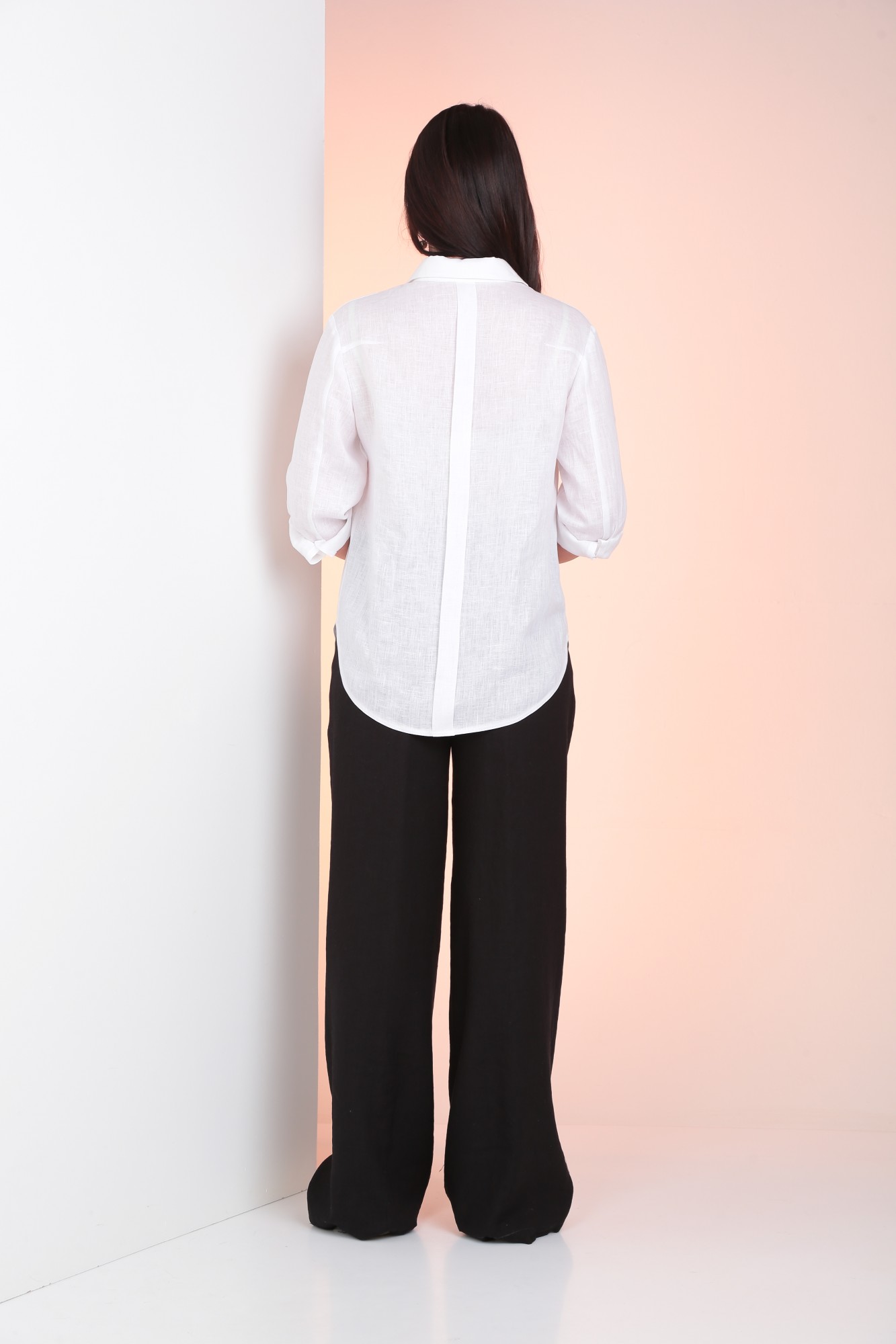 Рубашка прямого силуэта, с втачным рукавов длиной 3/4. На полочке в верхней части накладные карманы с клапаном. Центральная бортовая застежка на петли-пуговицы. Воротник рубашечный втачной на стойке.