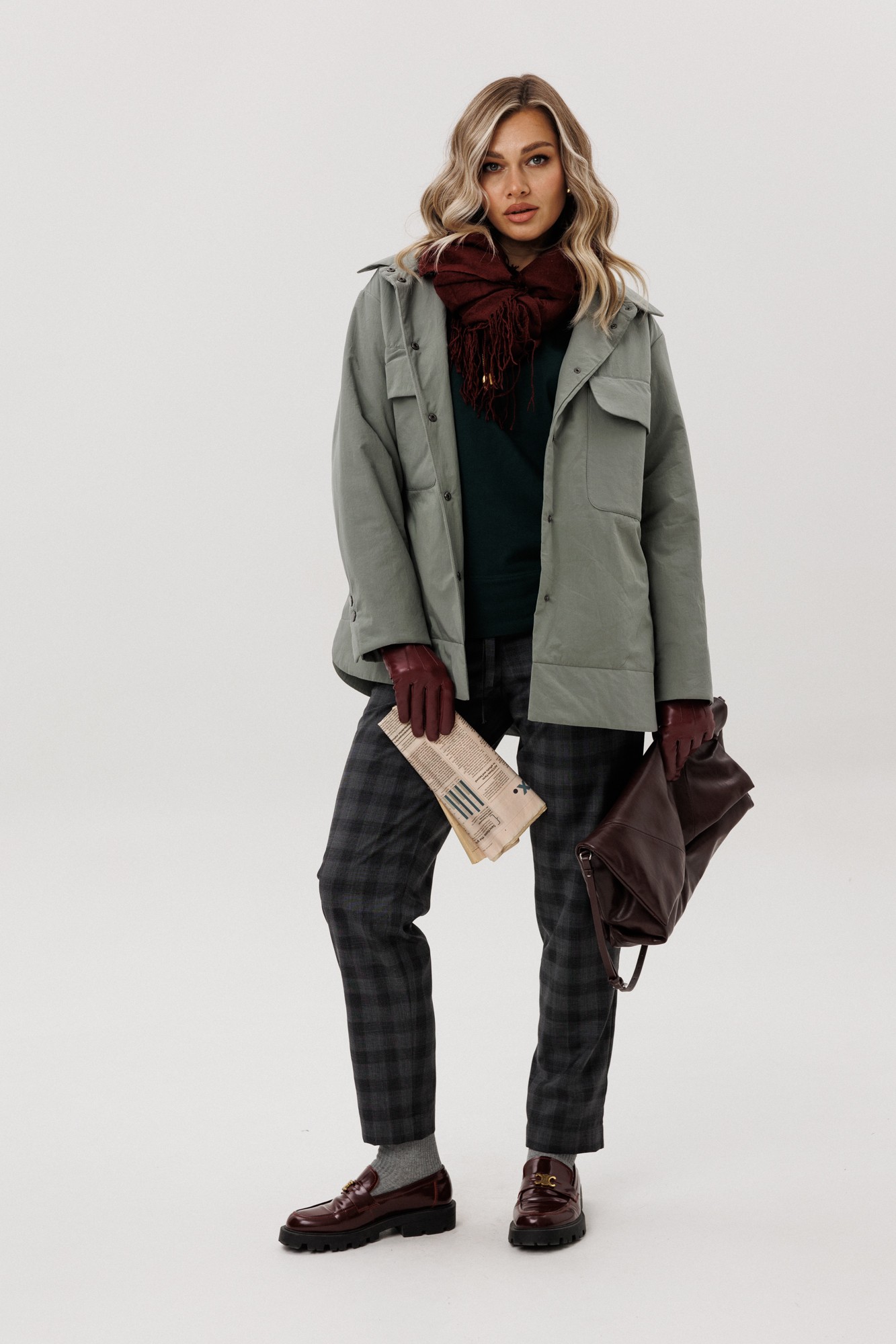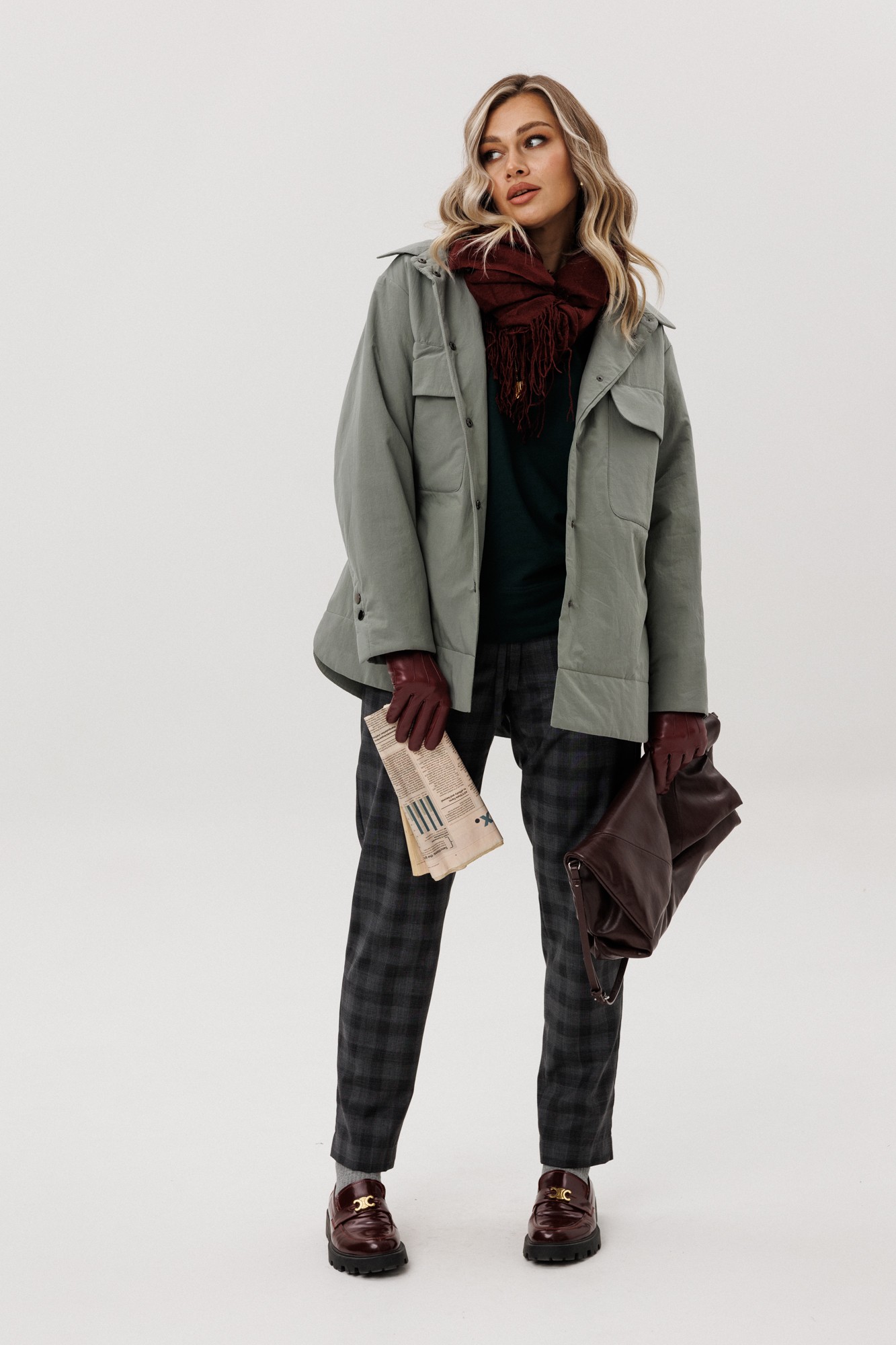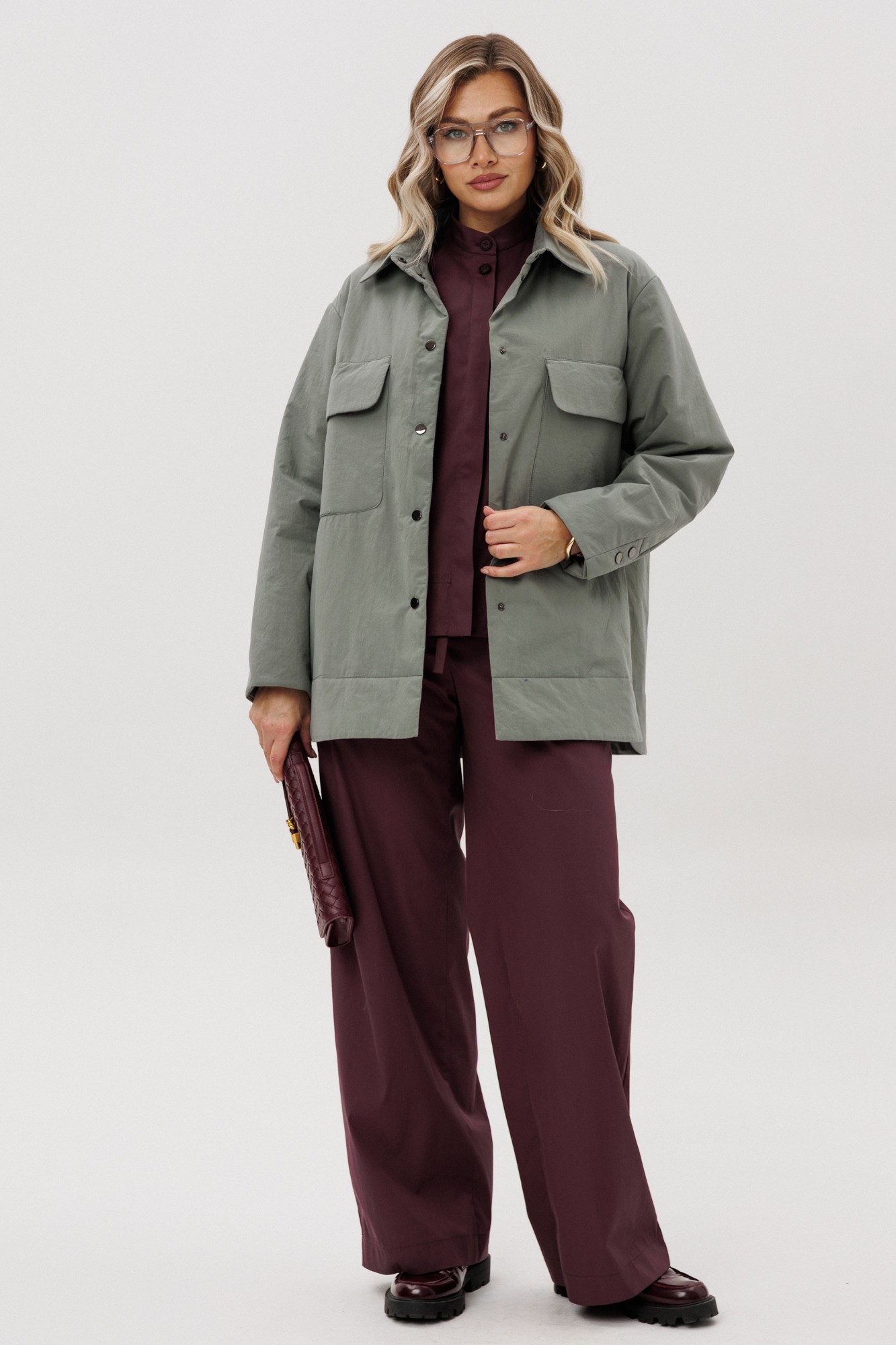 Стеганая рубашка из хлопчатобумажной ткани прямого силуэта. Воротник со стойкоа, рукав втачной. По переду накладные карманы с клапаном. По спинке декоративная вышивка.