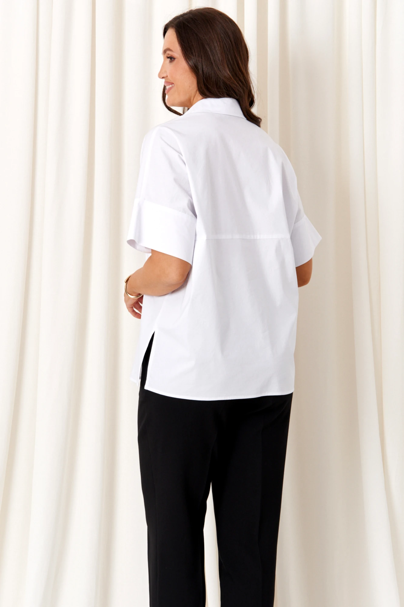 Эта женская рубашка выполнена из хлопковой ткани, что обеспечивает комфорт, легкость и приятные ощущение при носке. Модель отличается классическим кроем с супатной застежкой, на обметанные петли с пуговицами, что позволяет легко регулировать глубину выреза и создает аккуратный внешний вид. Спинка украшена кокеткой и двумя мягкими складками, обеспечивающими хорошую посадку и добавляющими объемности силуэту. Воротник рубашечного типа придает образу строгую и элегантную нотку. Рукава цельнокроеные, чуть ниже локтя, что делает их комфортными и универсальными — идеально подходят для разных сезонов и повседневного стиля. Низ рукава обработан притачной манжетой, добавляющей аккуратности и завершенности к деталям. В боковых швах находятся небольшие подрезы, создающие дополнительную динамику и легкость силуэта. Цвет — белый — универсальный и легко сочетается с различной одеждой, делая образ свежим и элегантным. Эта рубашка отлично подойдет для повседневных образов, офисных комплектов или стильных выходов, сочетаясь как с юбками, так и с брюками или джинсами.