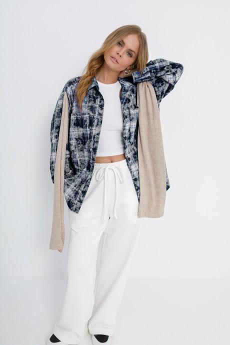 Свободная рубашка в клетку с эффектом потертости. Детали: прямой силуэт, спущенная линия плеча, накладные карманы, застежка на петли и пуговицы, удлиненные рукава с притачными манжетами. Имитация рукавов из трикотажа.