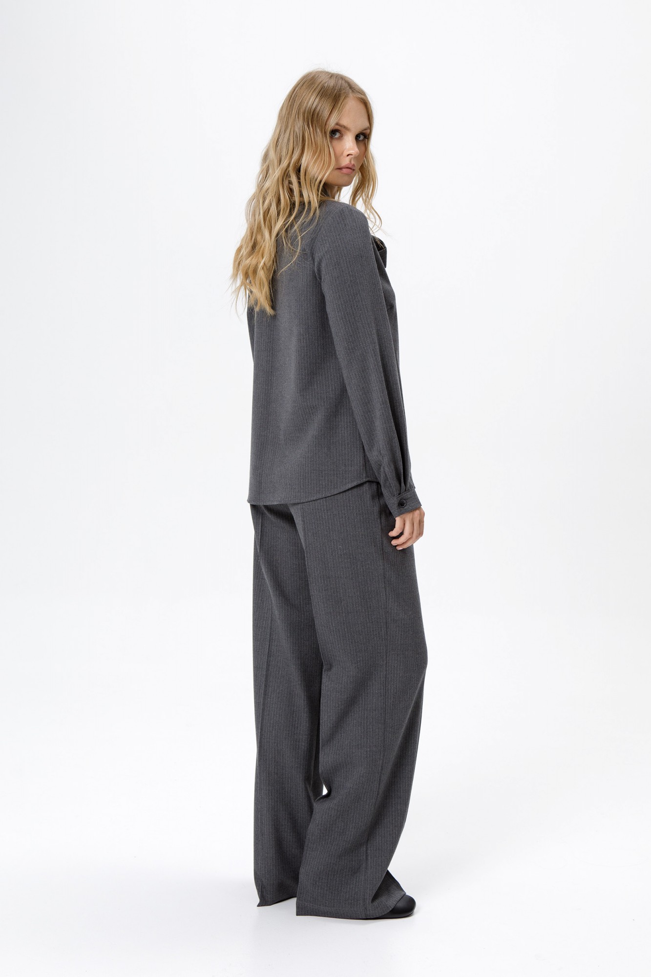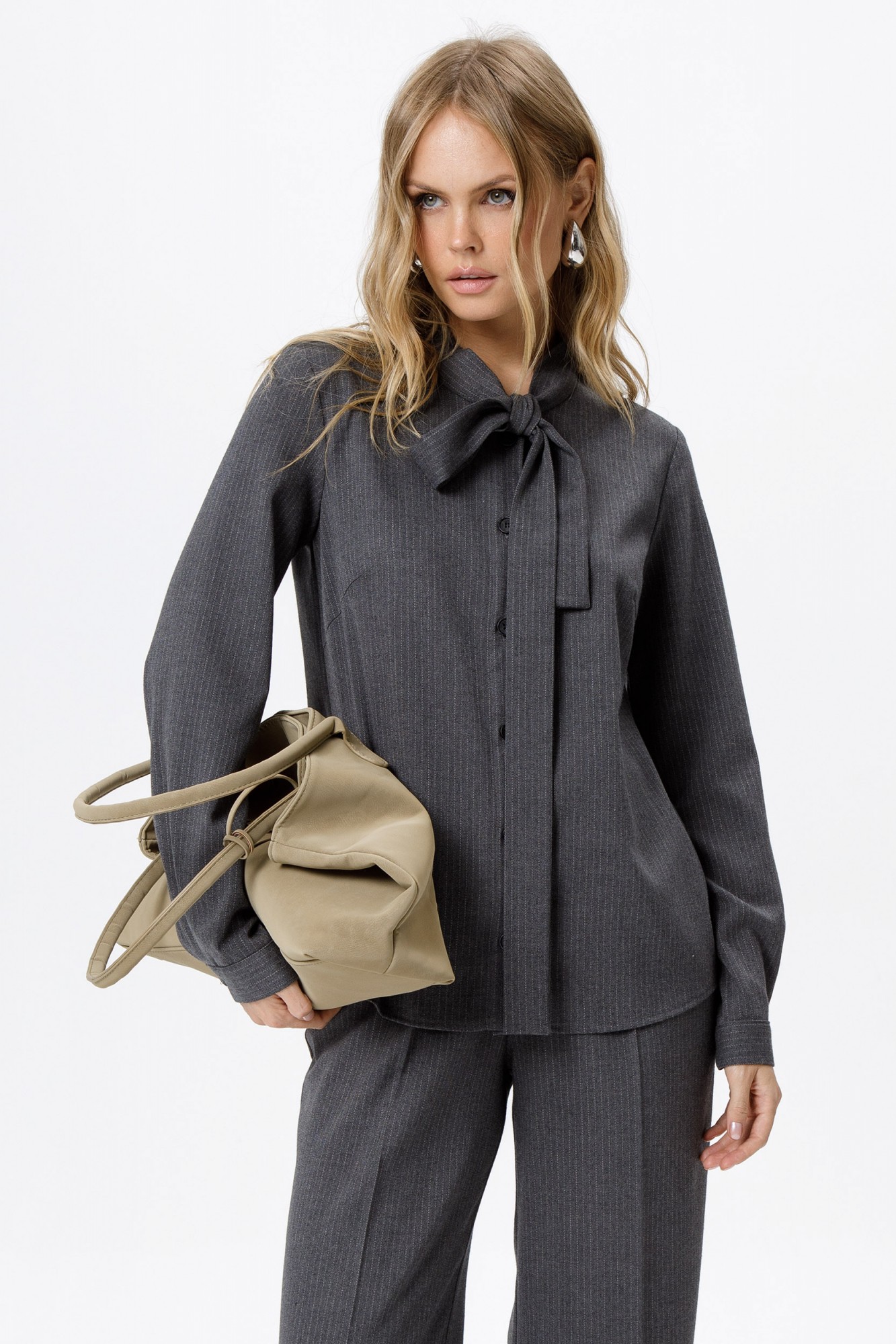 Рубашка с воротником-бантом. Детали: рубашка прямого силуэта, застежка на петли и пуговицы, длинные рукава с притачными манжетами.