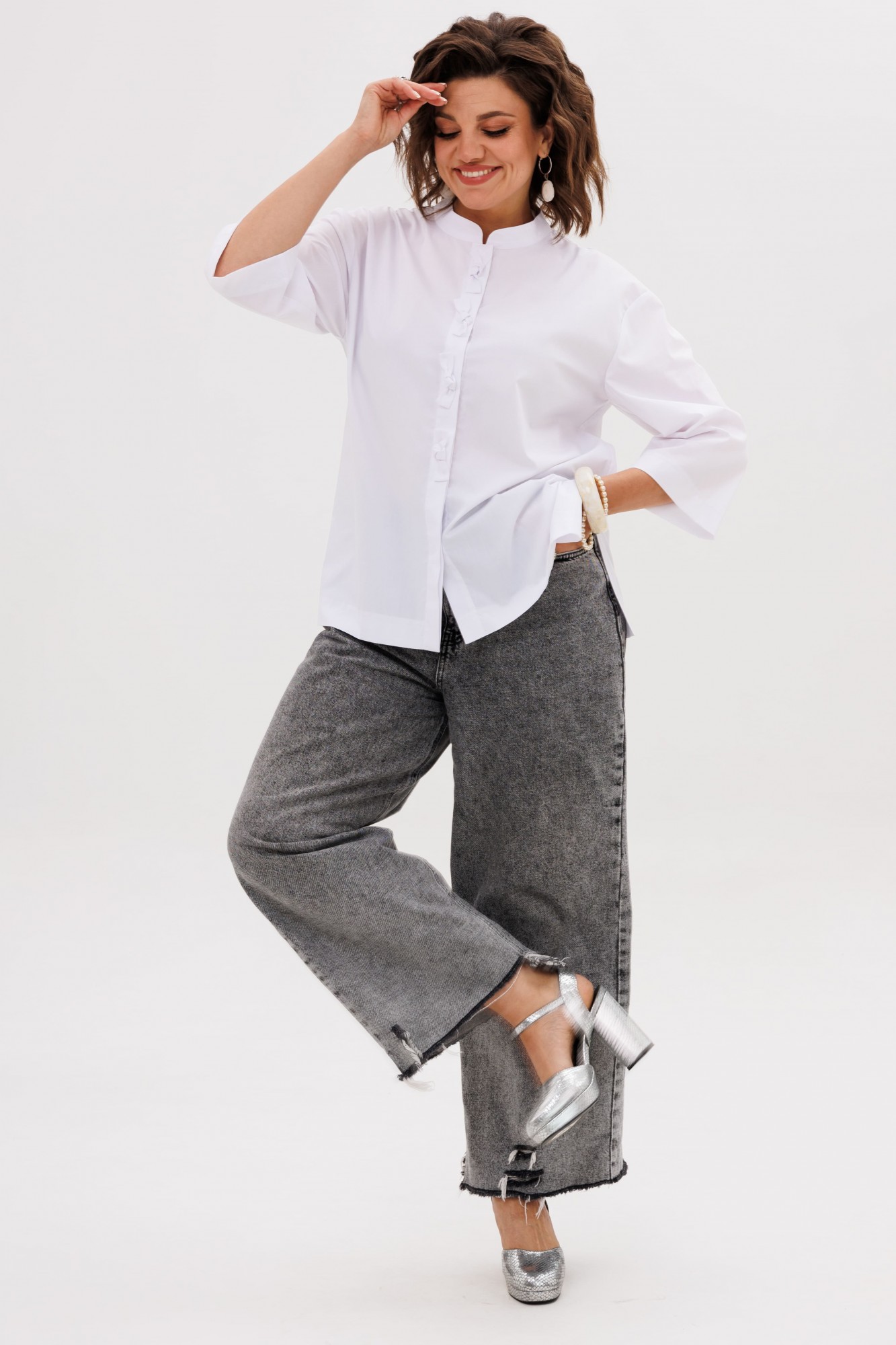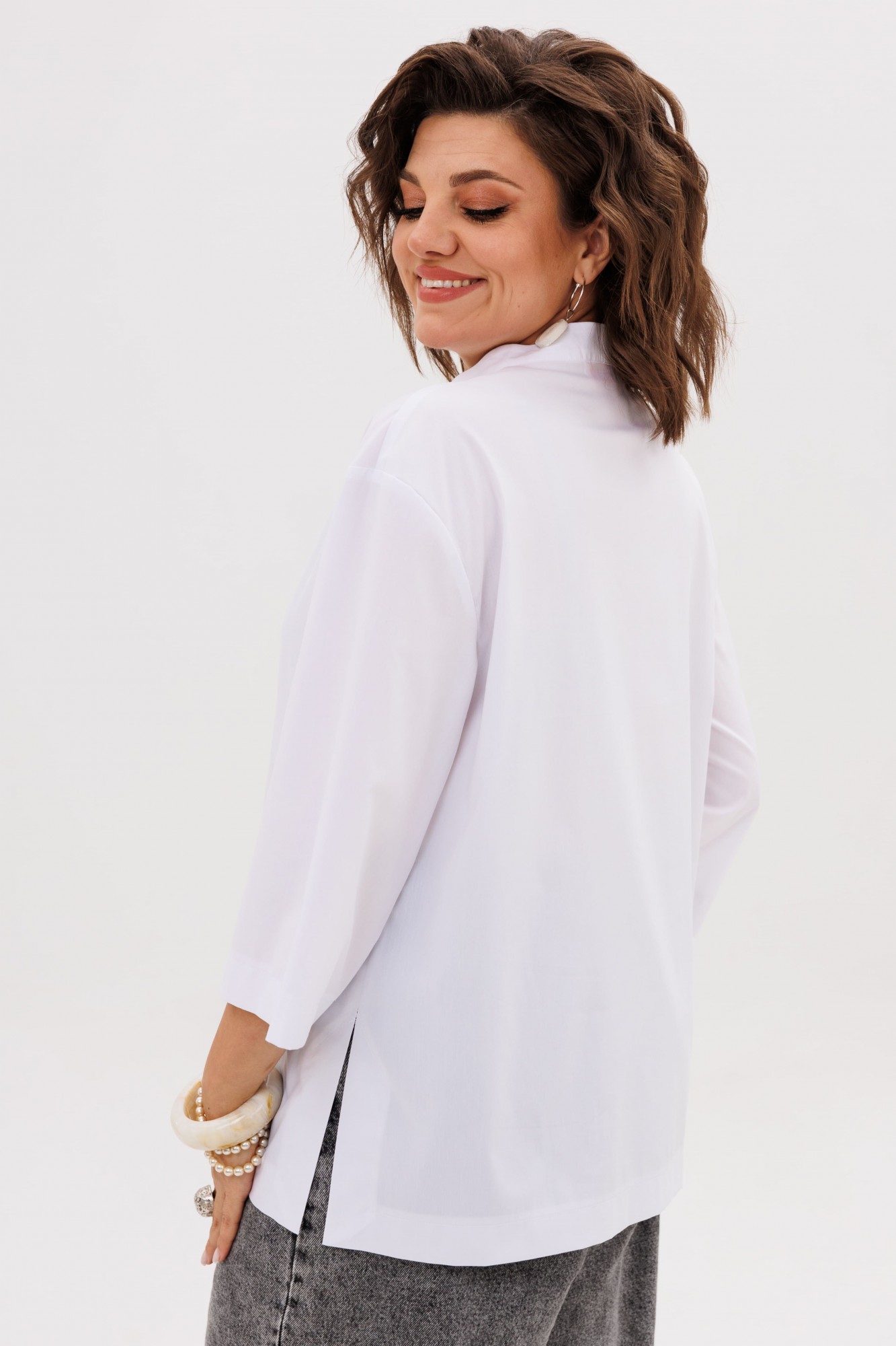 Белоснежная ткань, чистая и благородная, становится идеальным холстом для игры света и тени. Свободный, струящийся крой, вдохновленный традиционными восточными одеяниями, дарит неповторимое ощущение легкости и комфорта. Прямой силуэт, ниспадающий мягкими складками, обладает умиротворяющей гармонией и скрывает все лишнее, создавая идеальный контур.