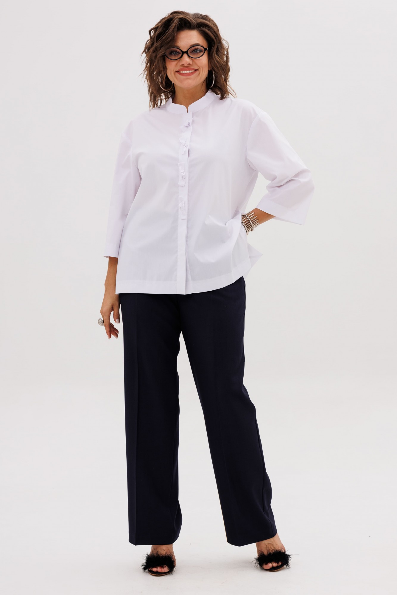 На модели в блузе «бантики» синие брюки 1540.