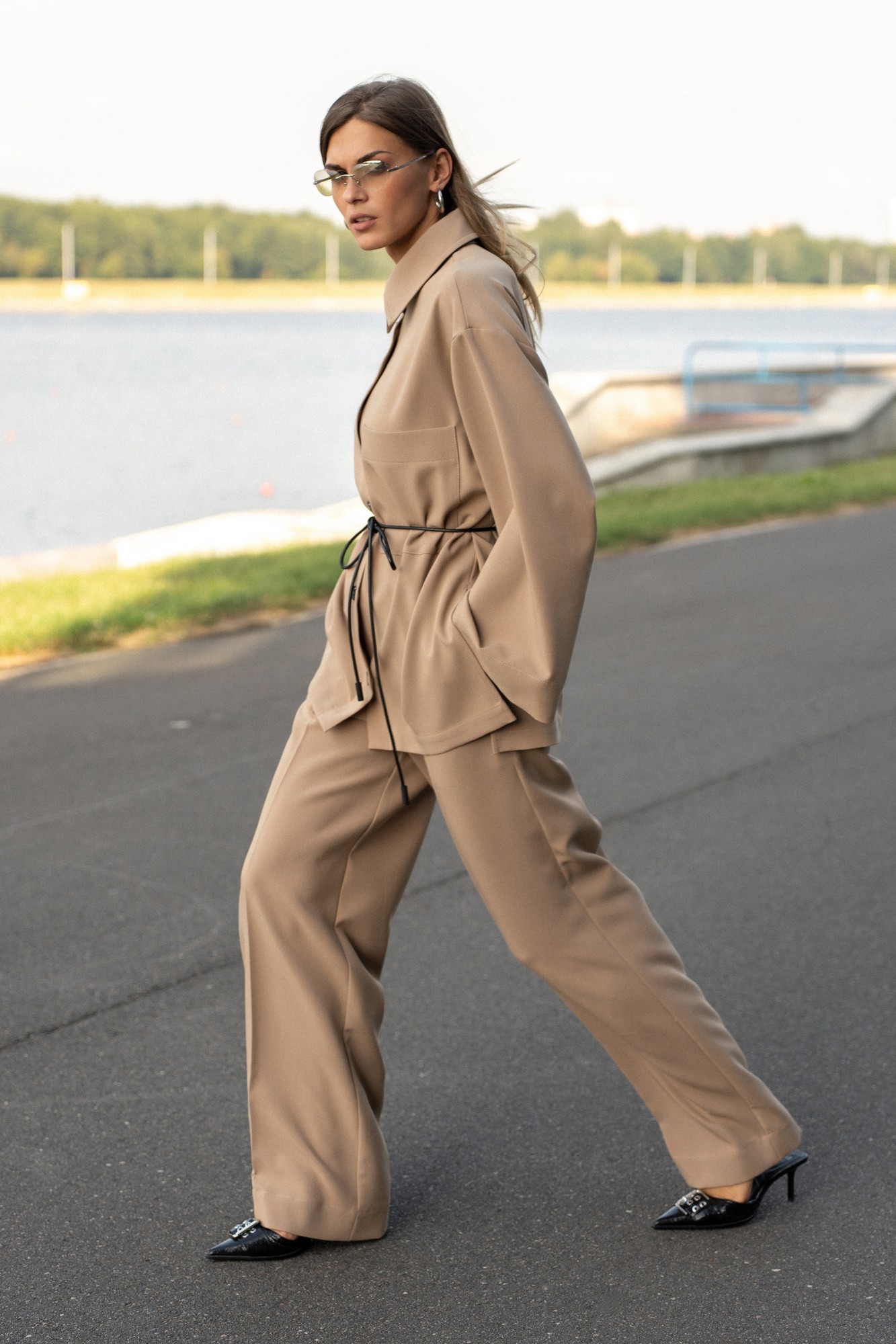 Стильная рубашка в цвете "Camel" свободного, прямого силуэта. На левой полочке накладной карман. Рукав широкий на спущенной пройме. В боковых швах разрезы. Воротник стояче-отложной с отрезной стойкой.