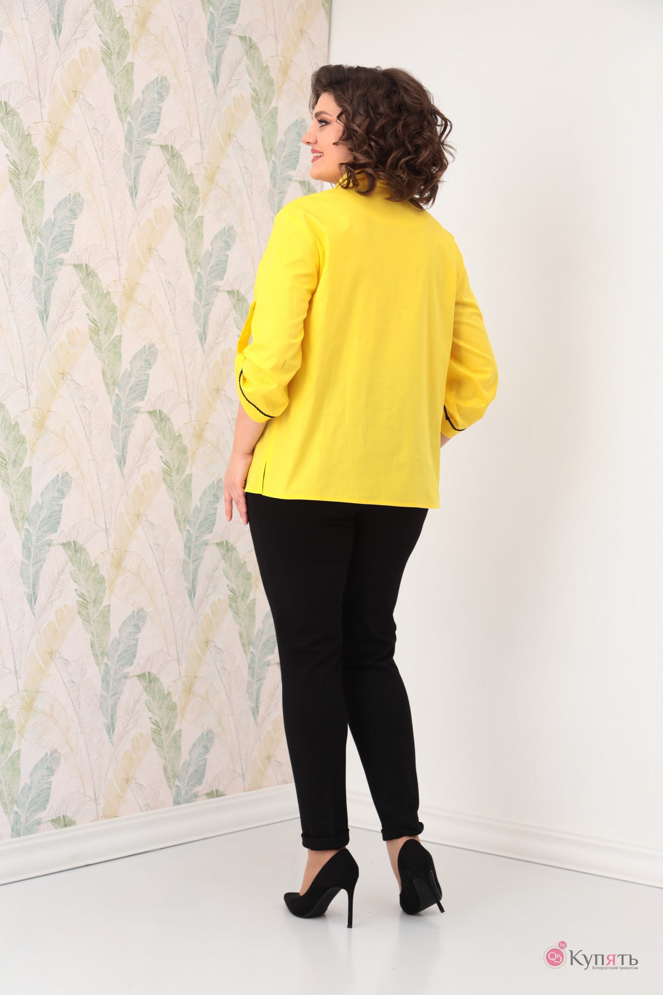 Рубашка женская полуприлегающего силуэта. По переду обработаны нагрудные выточки по центру со швом. Воротник пиджачного типа с отложными лацканами на планке и с 3 пуговицами. Рукав втачной, на пате с петлей-пуговицей. Спинка цельная. Отделкой служит настроченная тесьма по воротнику, лацканам и по низу рукавов.