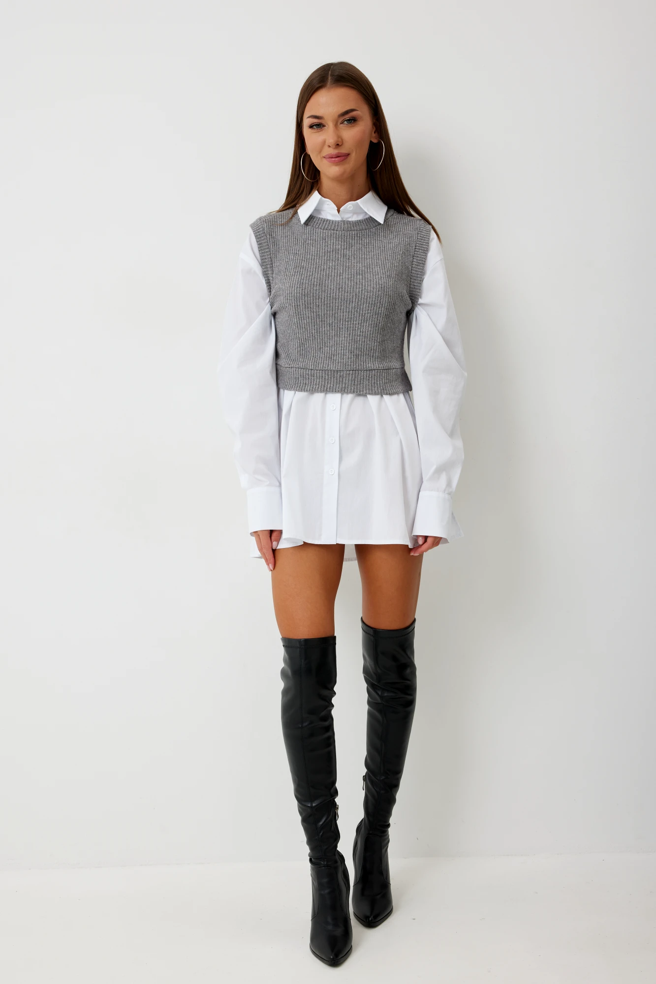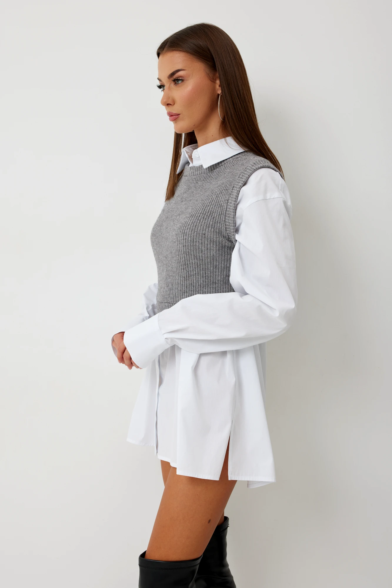 жилет: вязка -50% вискоза, 25% полиэстер, 25% нейлон рубашка: 65% хлопок, 32% вискоза, 3% спандекс