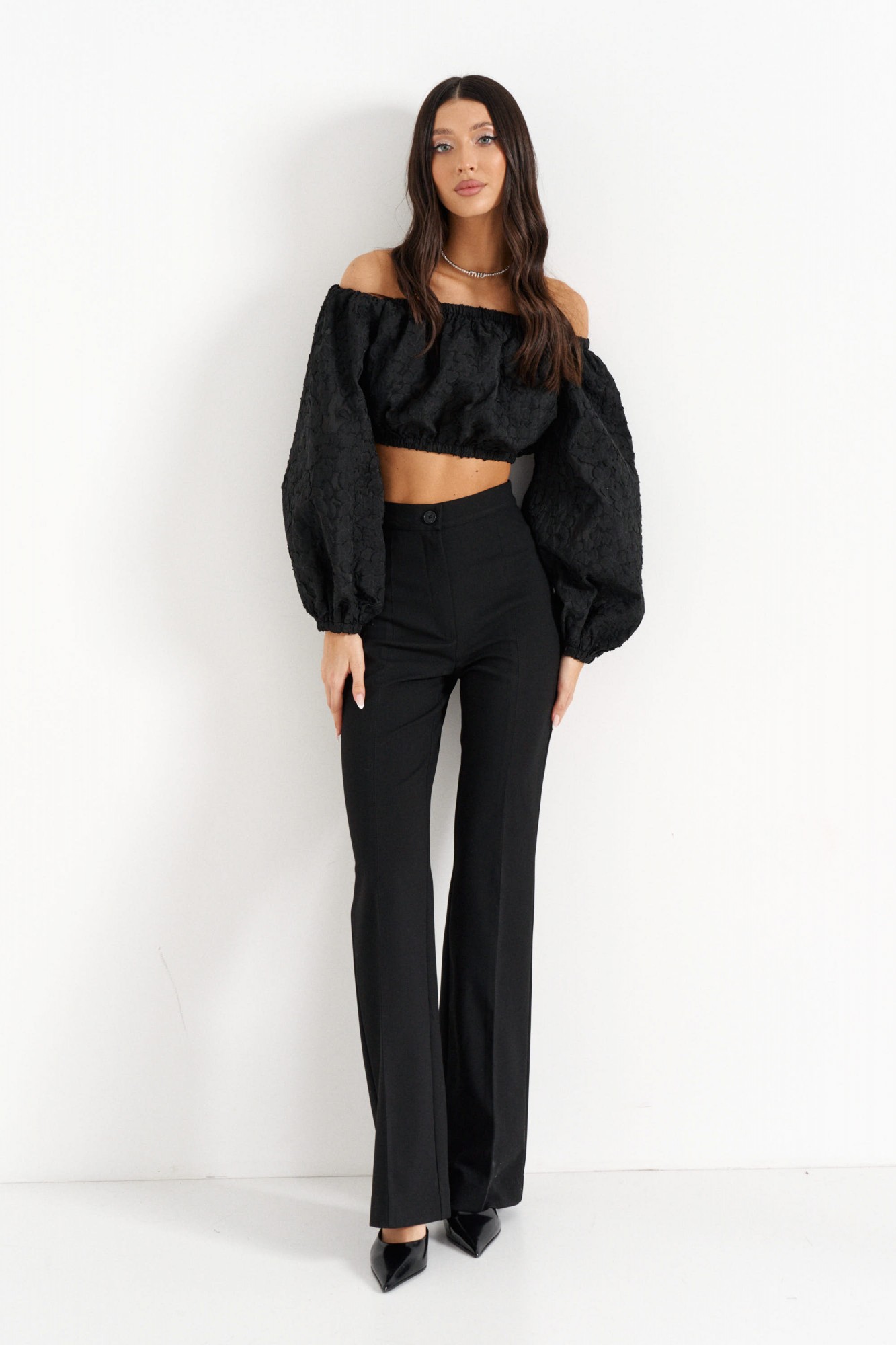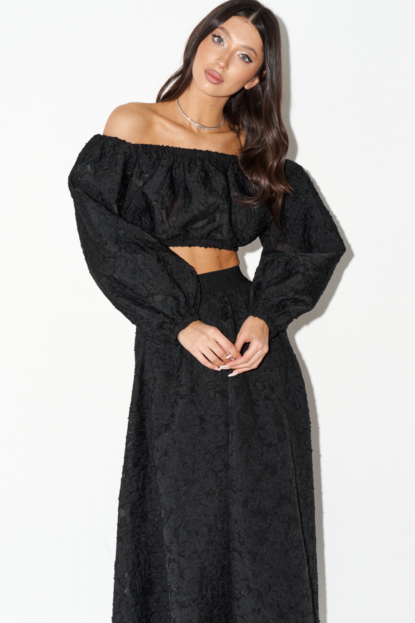 Топ с полуоткрытыми плечами выполнен черного полупрозрачного фактурного полотна. Характеристики: полуоткрытые плечи, рукав спущен, верх и низ рукава на резинке, низ изделия на резинке.
