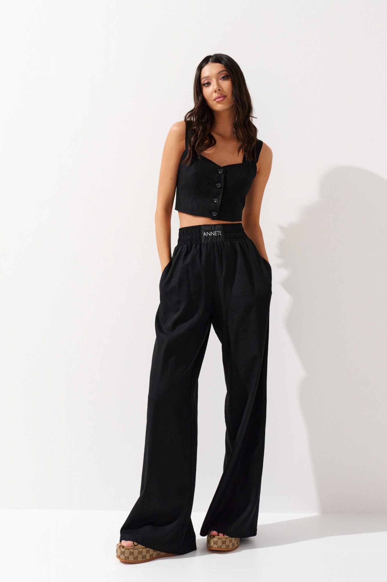 Топ прилегающего силуэта выполнен из льняного полотна черного цвета. Характеристики: прилегающий силуэт, фигурный вырез горловины, широкие бретели, застежка центральная на петли пуговицы. Образ дополнят брюки артикул А 1218.