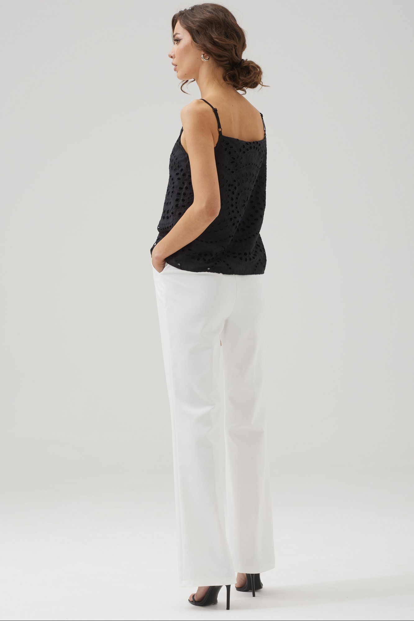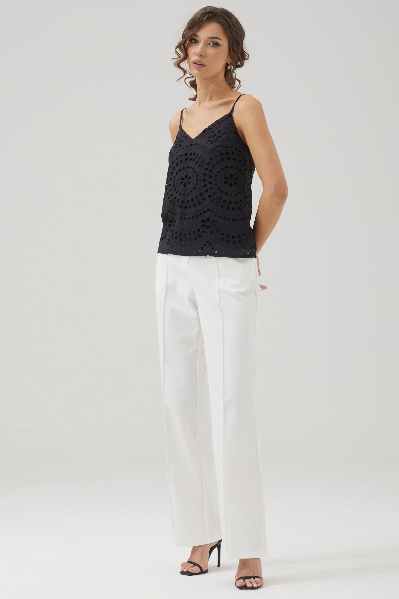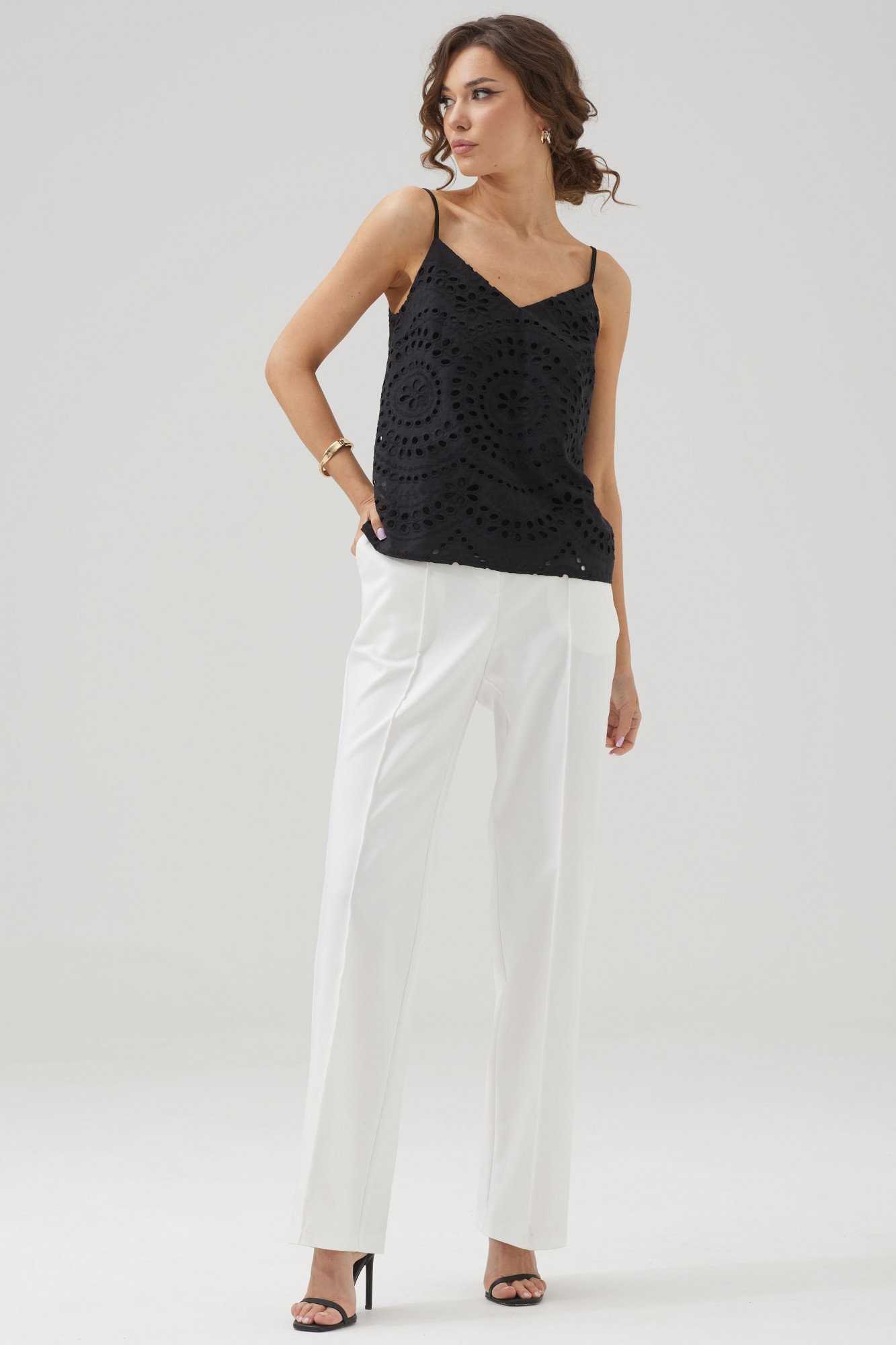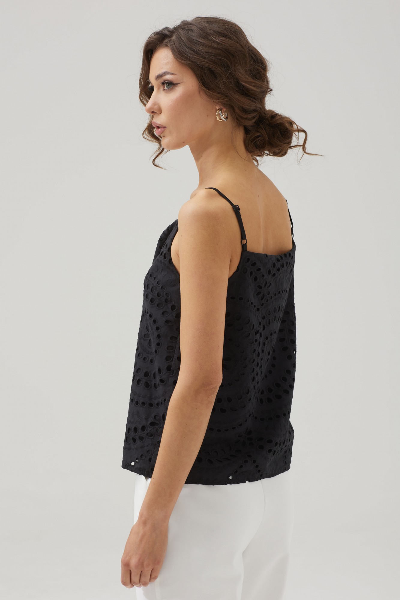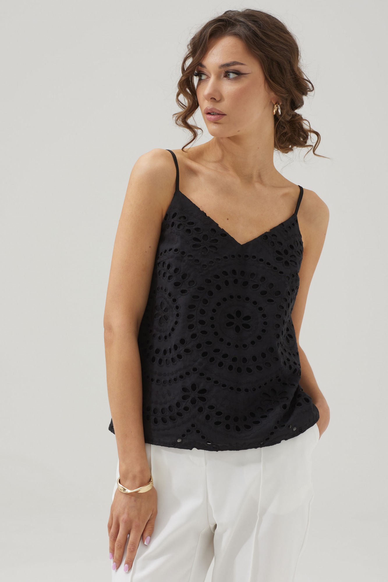 Женский топ на бретелях полуприлегающего силуэта с фигурным вырезом из ришелье.
