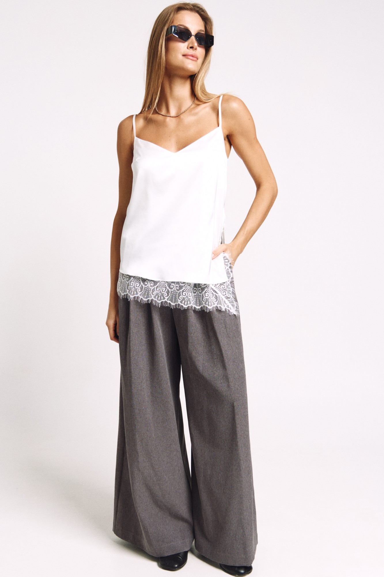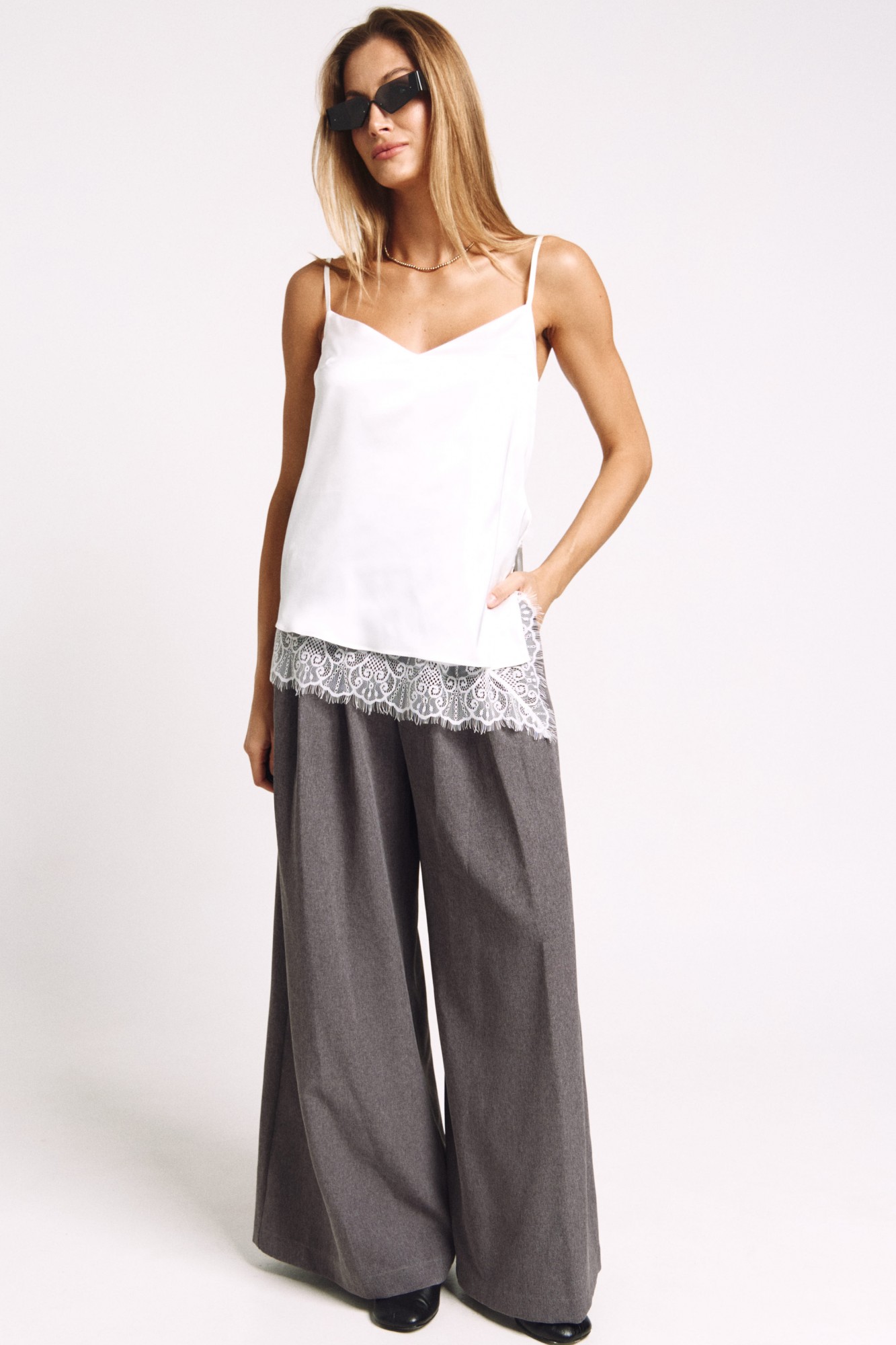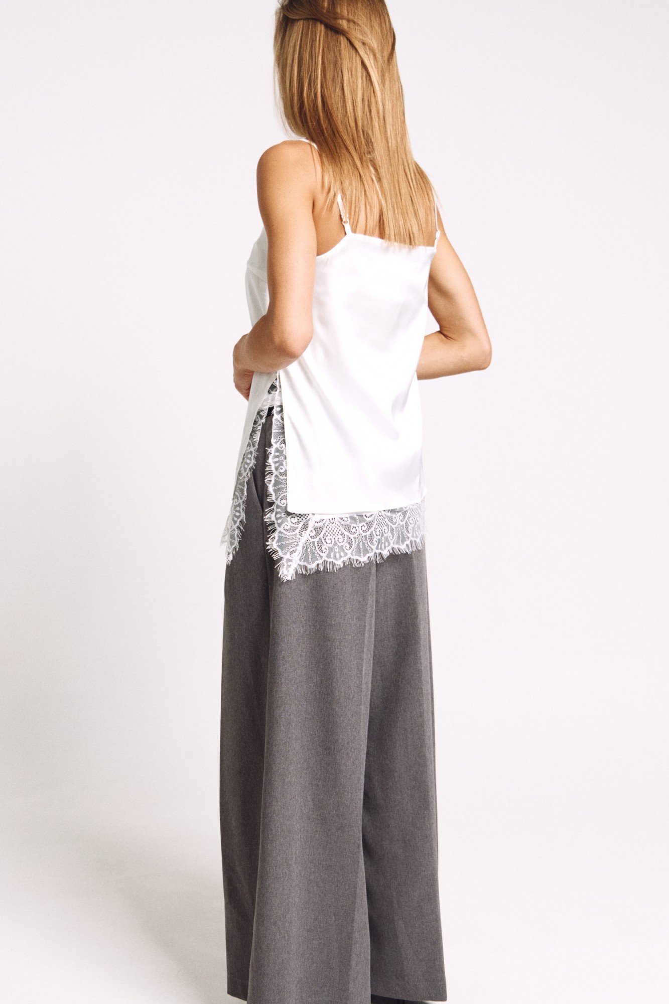Топ-комбинация на подкладке. К подкладка притачано французское кружево. Асимметричный низ, разрез сбоку из которого видно кружево. Бретели регулируются.