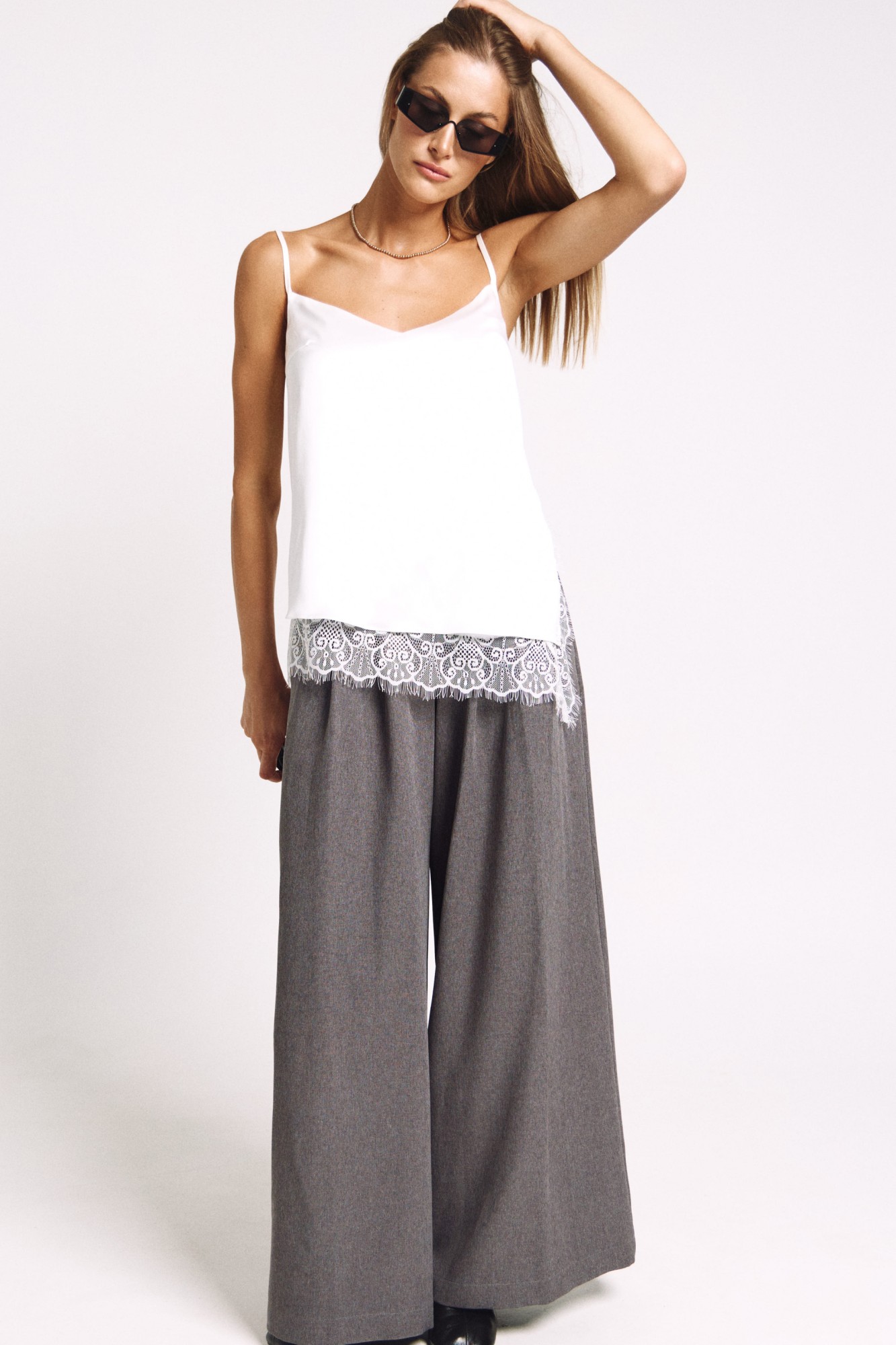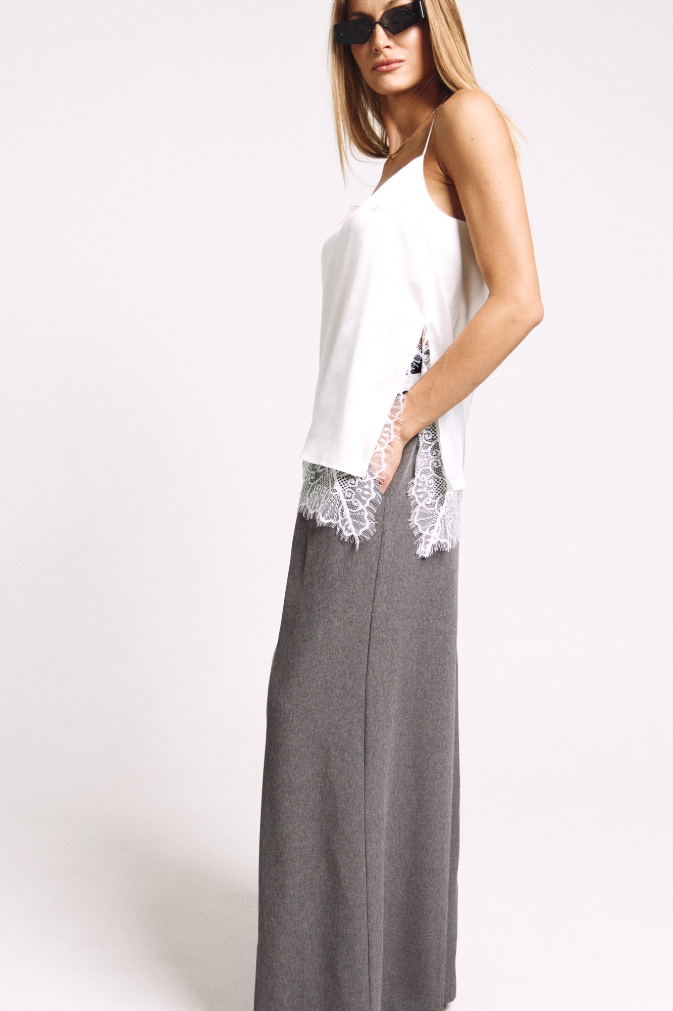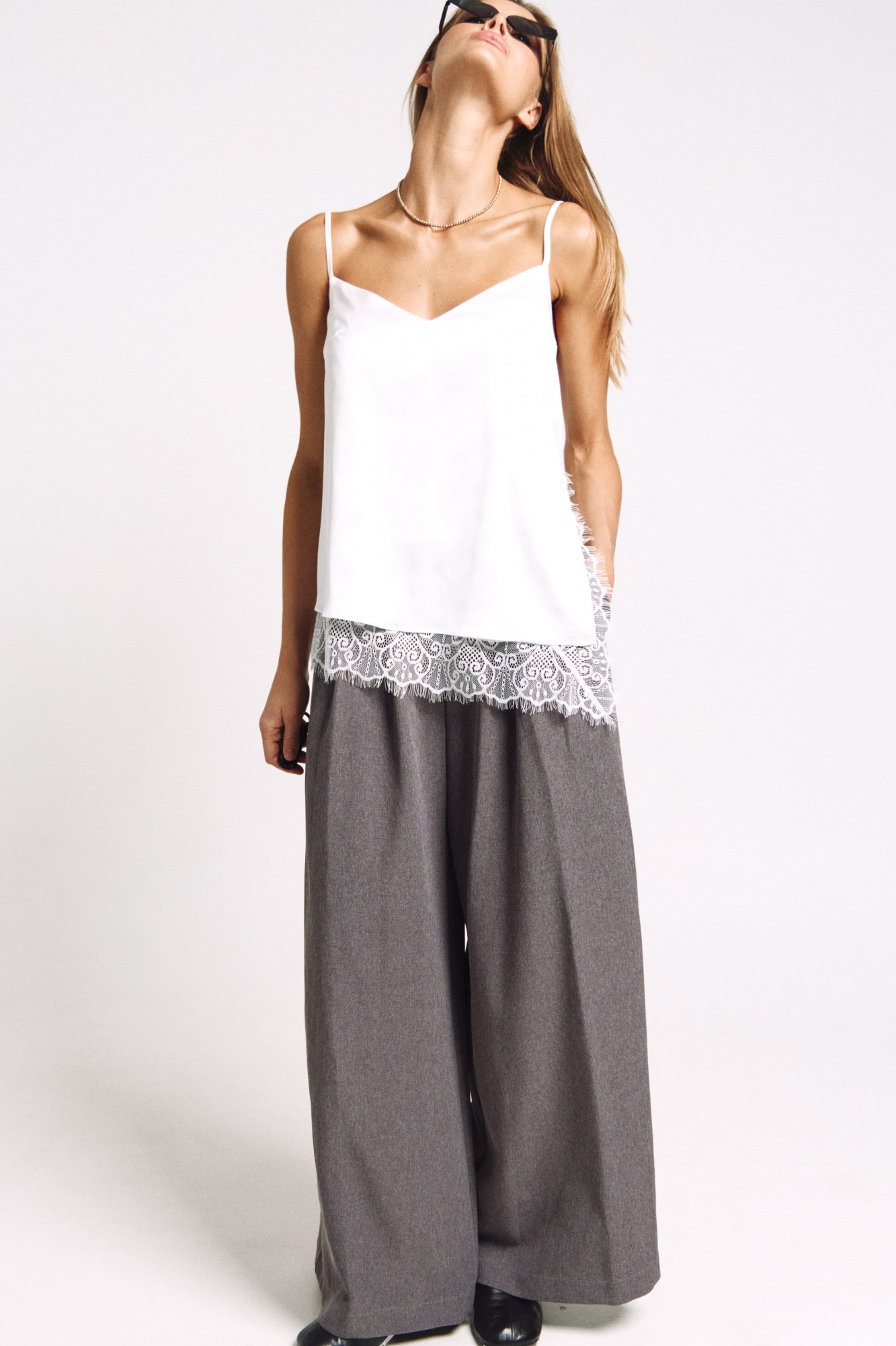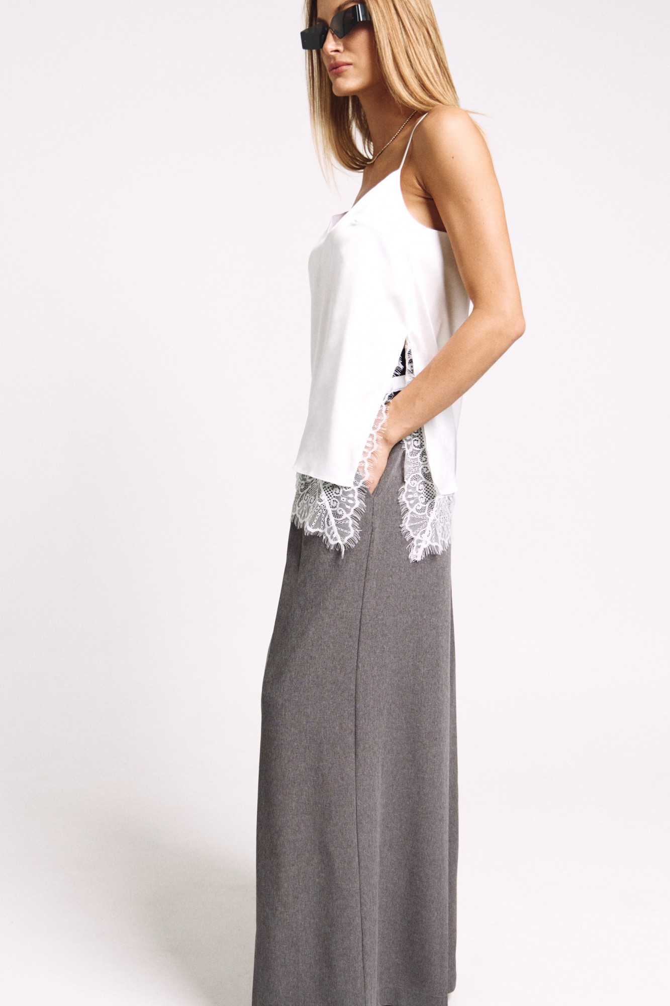 Топ-комбинация на подкладке. К подкладка притачано французское кружево. Асимметричный низ, разрез сбоку из которого видно кружево. Бретели регулируются.
