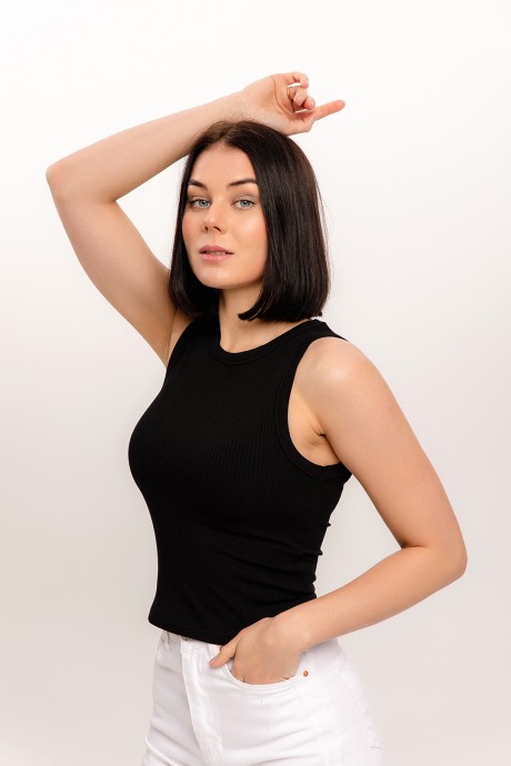 Топ прилегающего силуэта, укороченный. Вырез горловины круглой формы. Горловина и проймы обработаны широкой окантовкой с основного полотна. Топ изготовлен с трикотажного полотна "кашкорсе".
